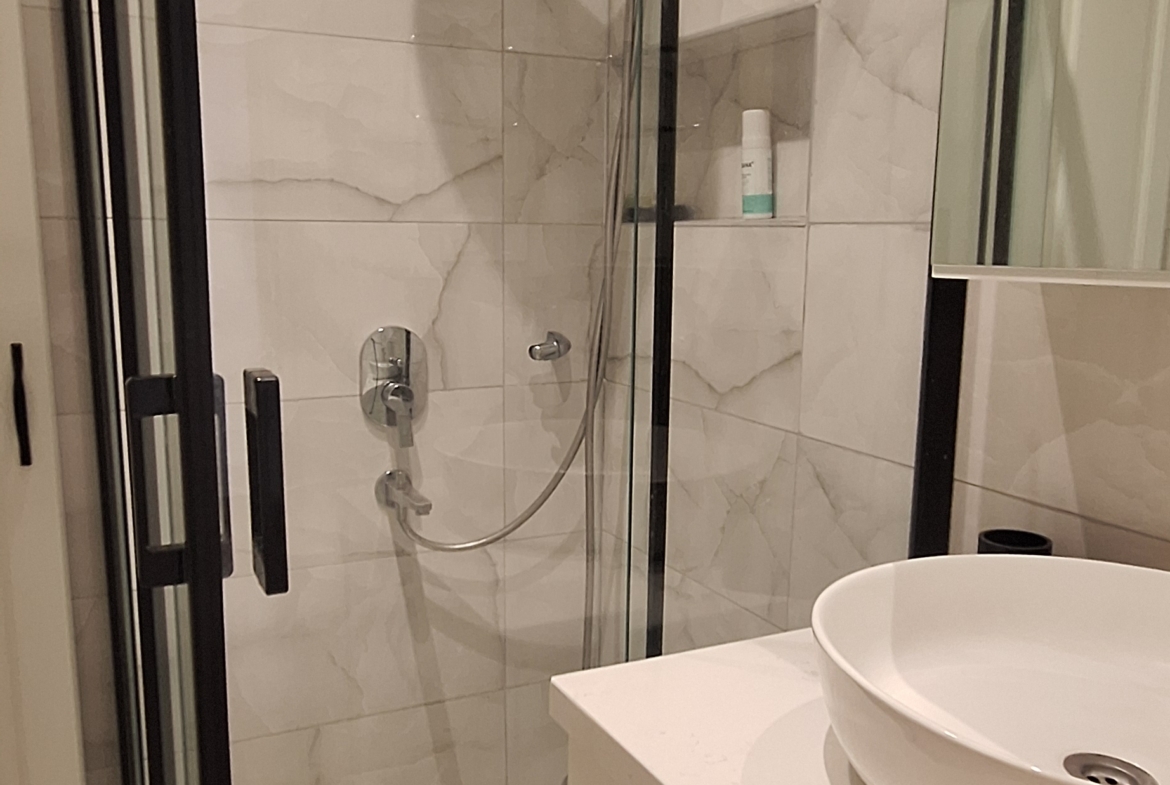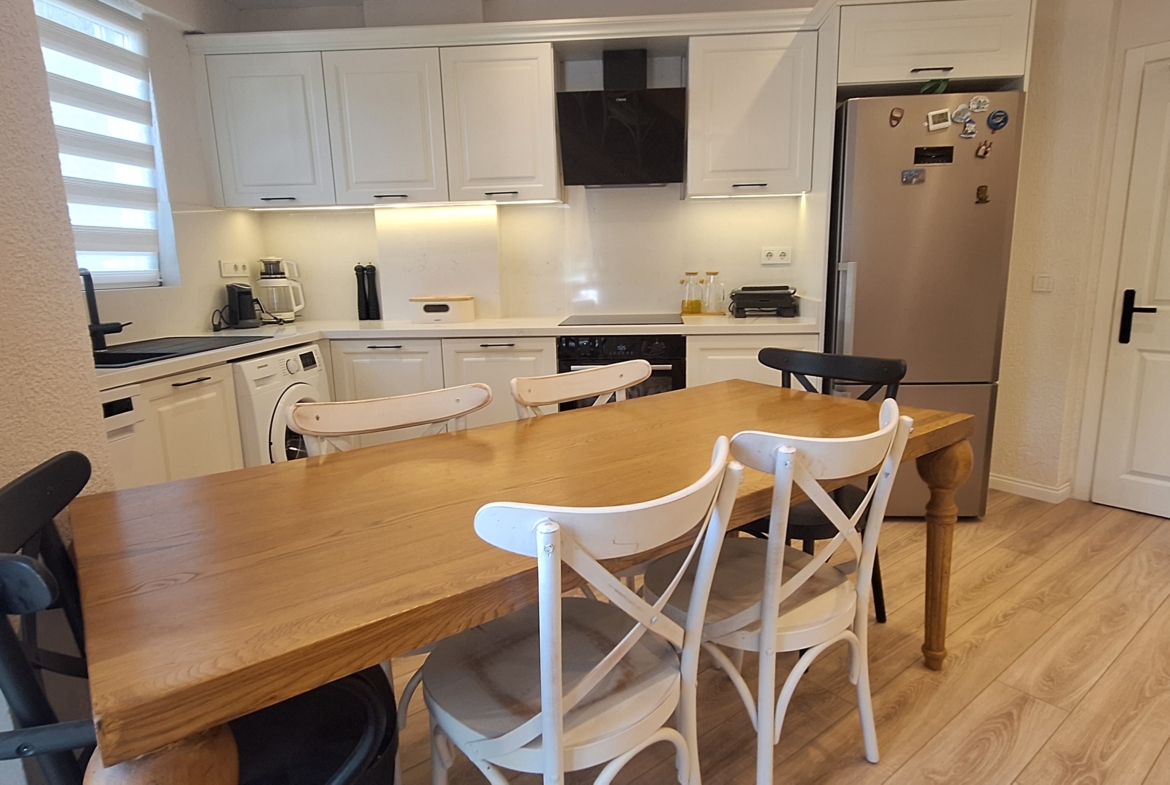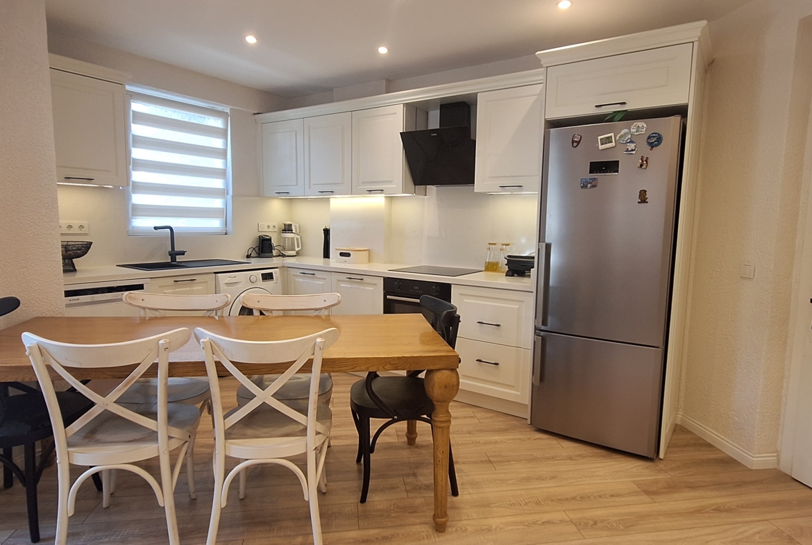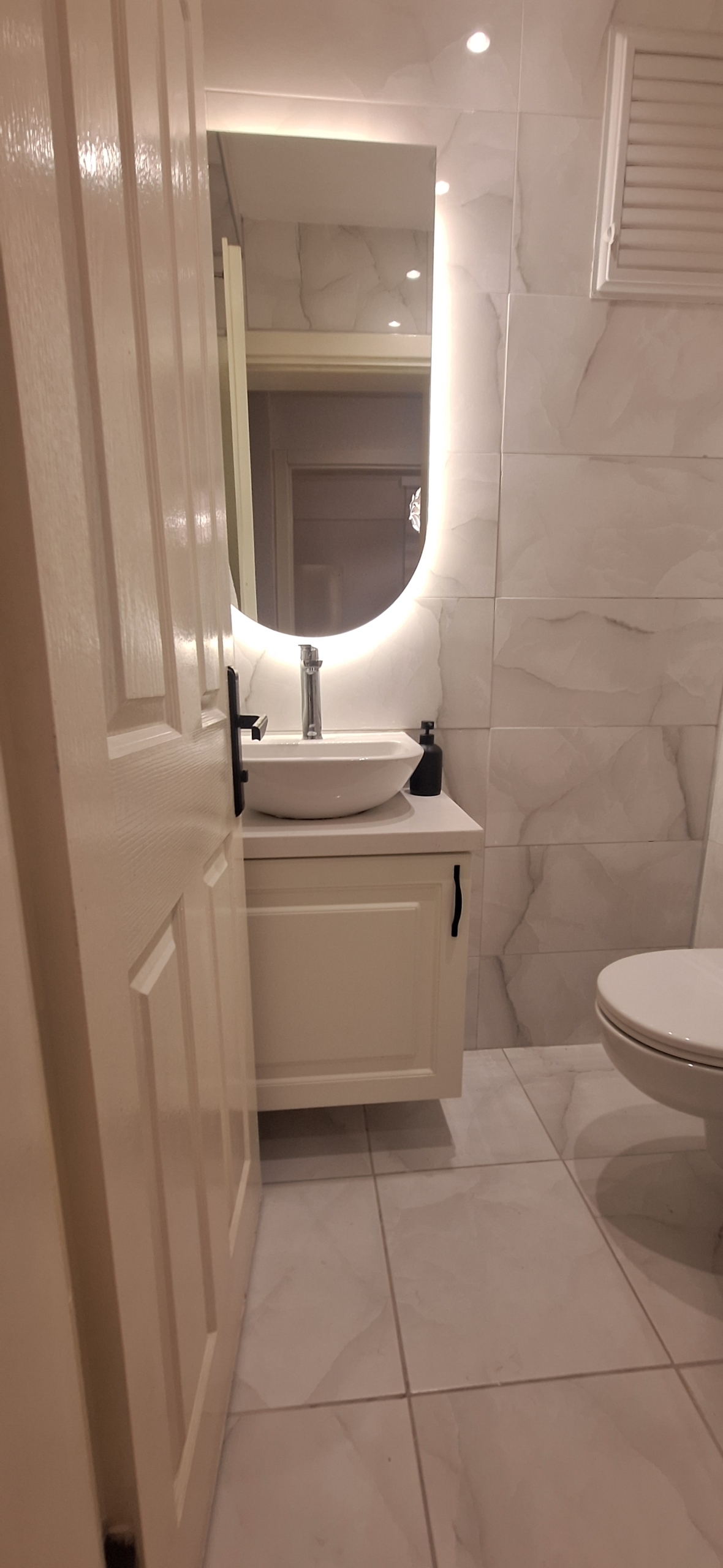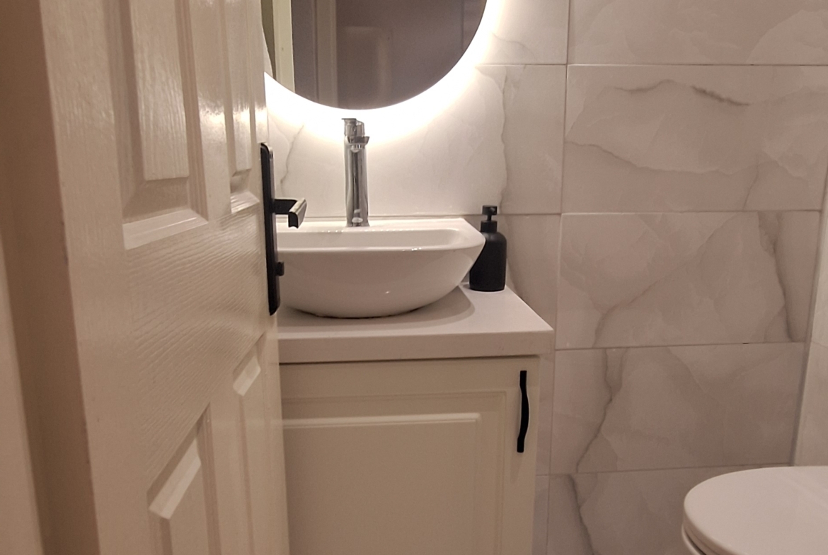 The kitchen is beautiful. It has lot’s of storage comes with a built in oven hob and extractor. White finished worktops and great lighting. Very sleek! There is also room for a large kitchen table adjacent to the kitchen.