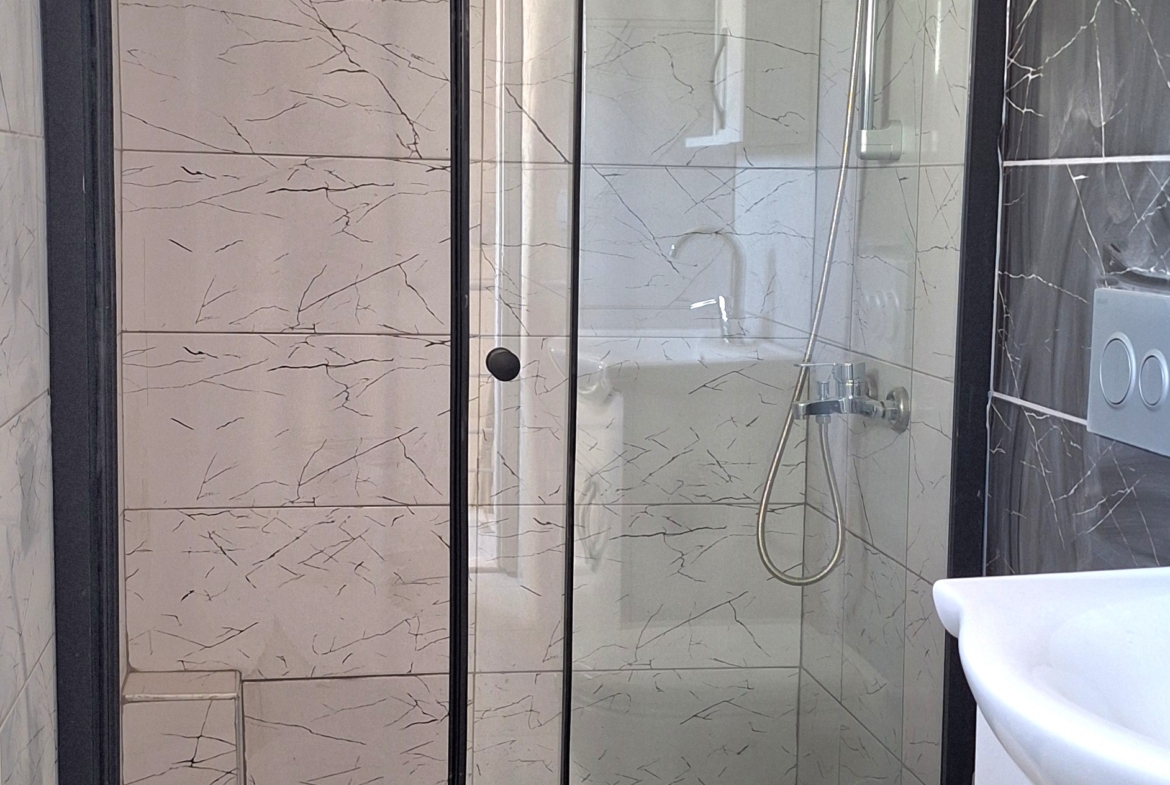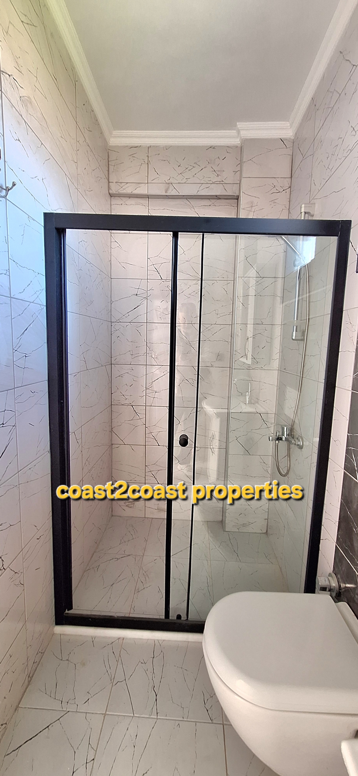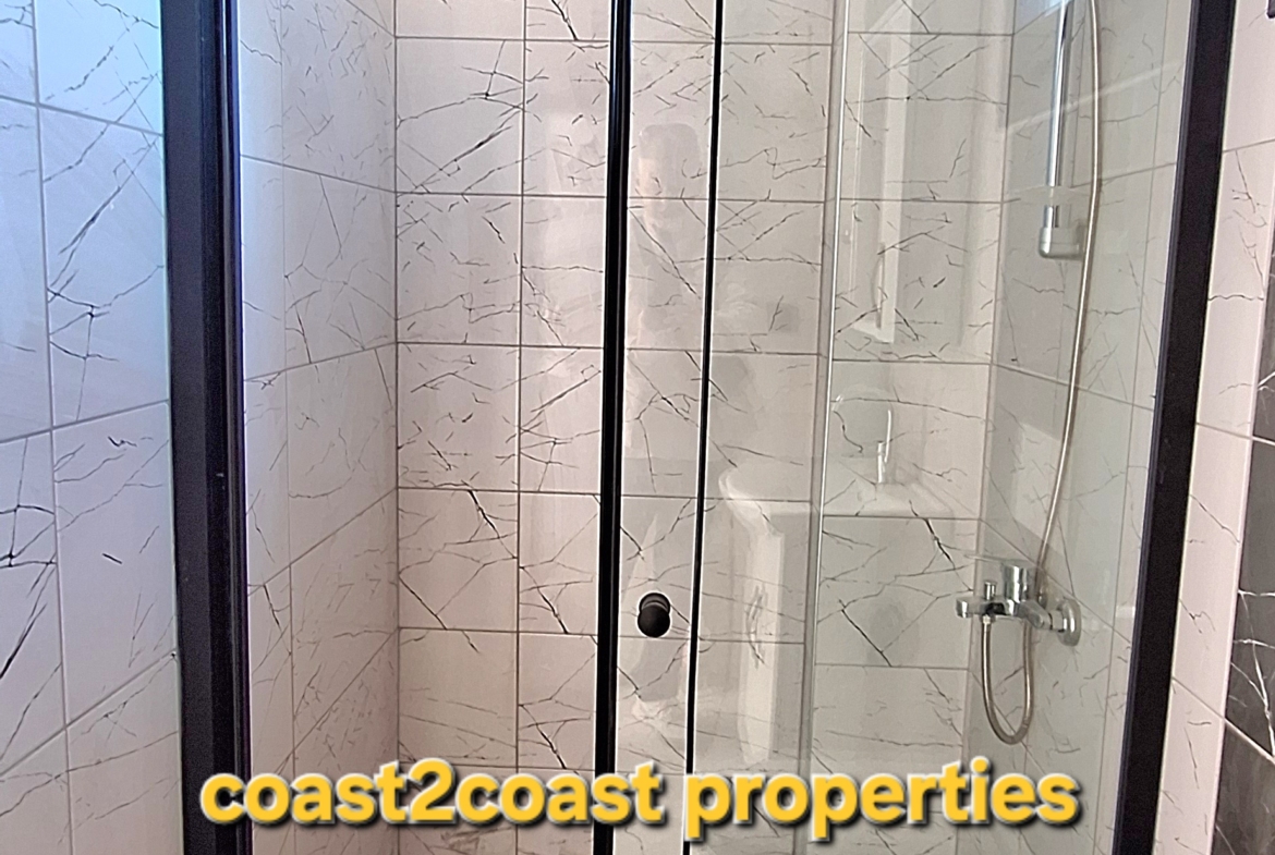 The top floor hosts two further double bedrooms and a shared shower room. The larger bedroom on this level also enjoys a spacious balcony with equally impressive views. All shower rooms are finished with floor-to-ceiling ceramic tiling and sleek glass cubicle screens, adding a modern and high-quality finish throughout.