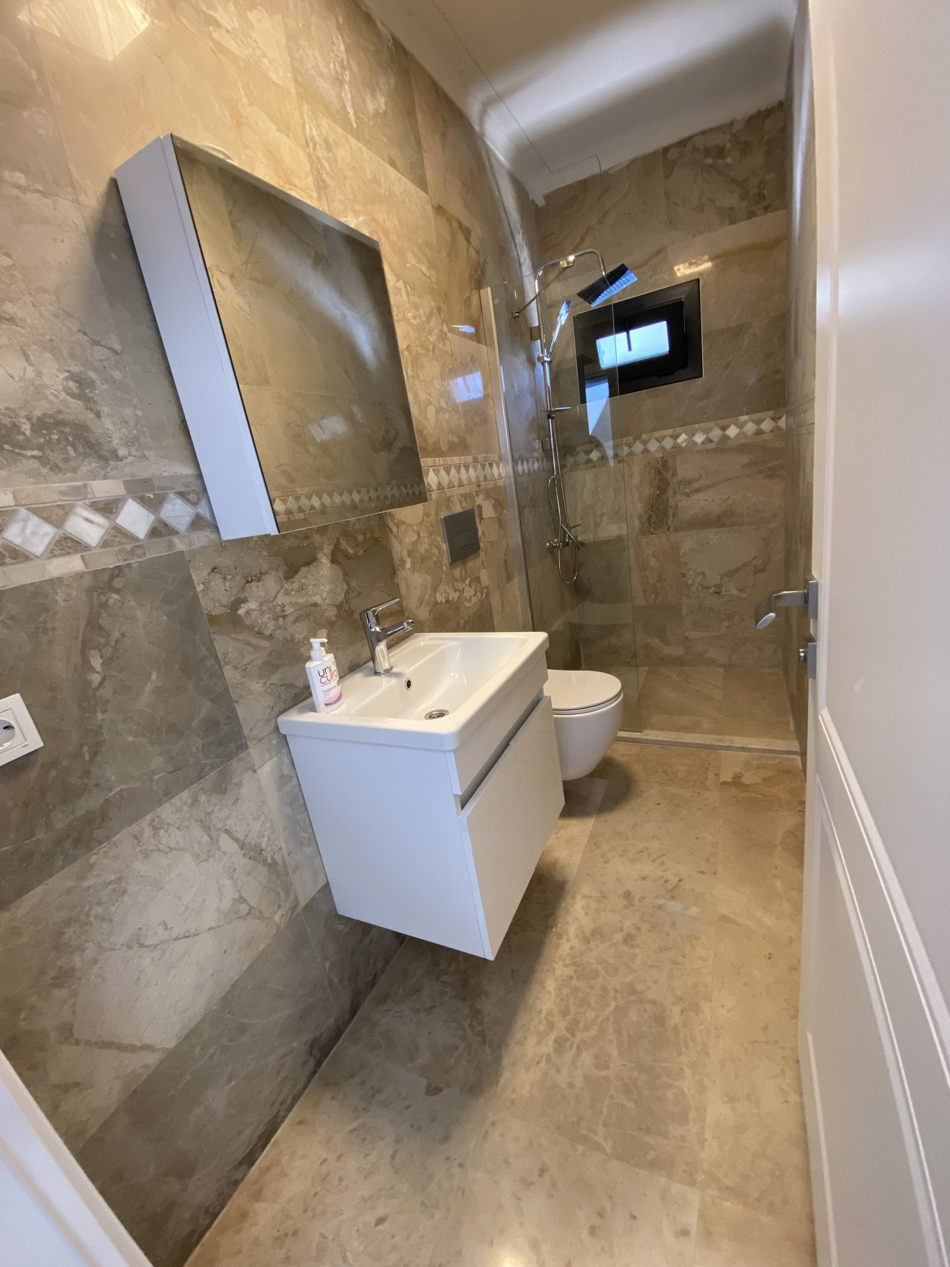 - Bathrooms floor and walls ceramic tiled and fitted toilet pan and shower cubicle, wash basin, set of mirror with fittings,