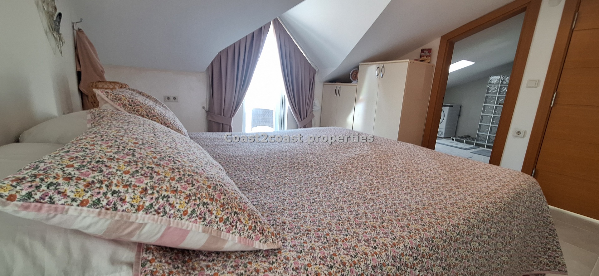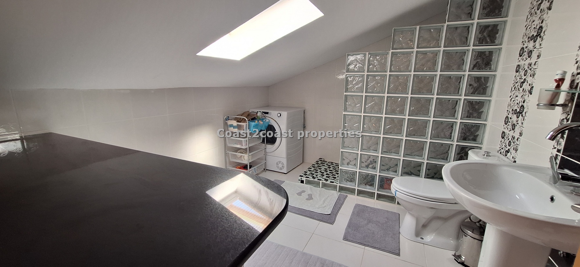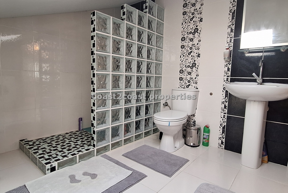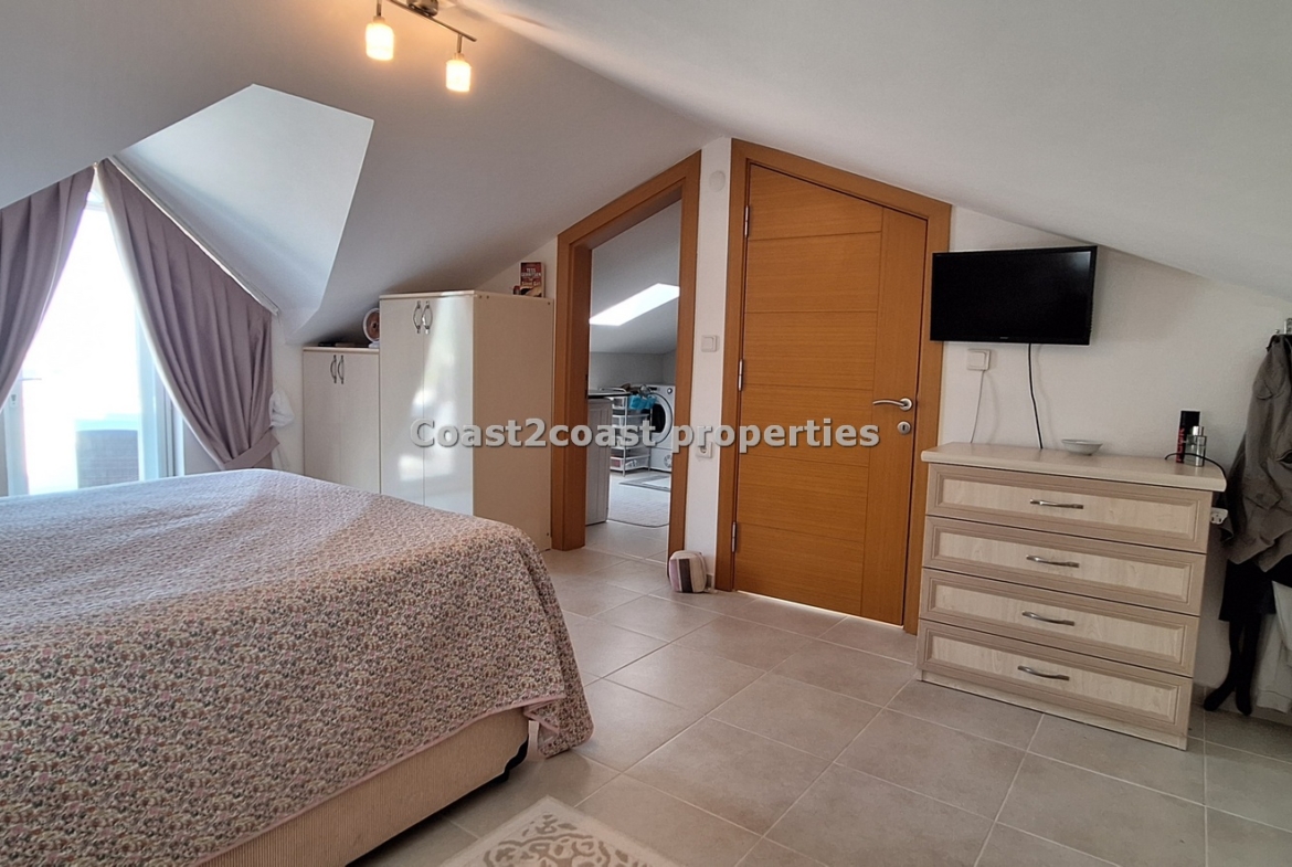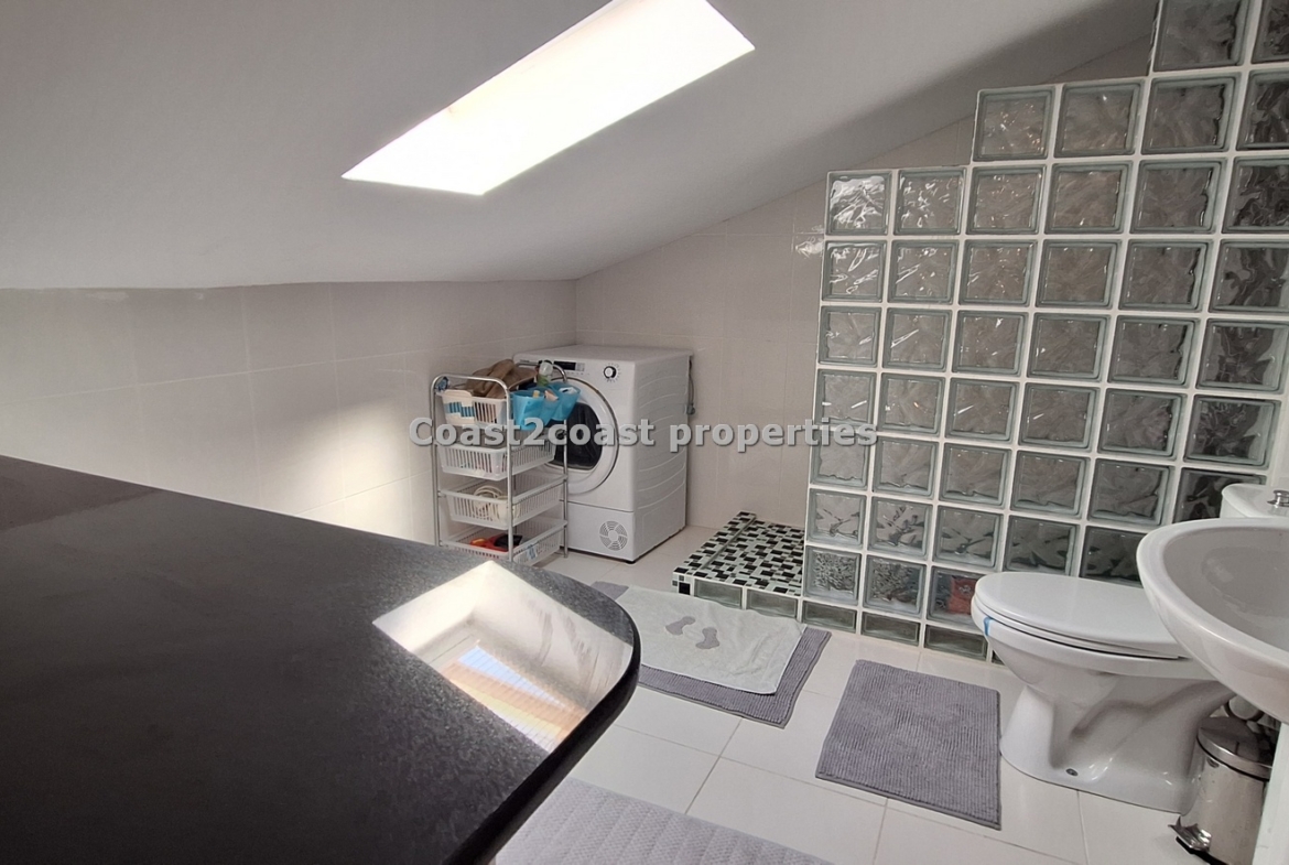 The marble staircase takes you to a large bedroom which is en suite. This again is larger than most rooms. It has lot’s of furniture , again inclusive of the sale of this property in Fethiye. This is a beautiful master bedroom. The en suite design is just wonderful with lot’s of care and attention given to the finishing. There is a working space so this can be used as a laundry room also with appliances. A Special glass brick wall is our shower area. Beautifully done. Light is in the form of a roof window which brightens this area up perfectly. Again we have a WC, sink and mirror areas.