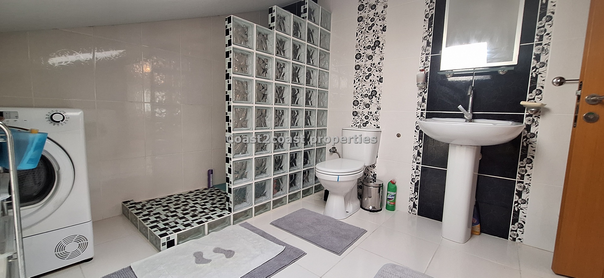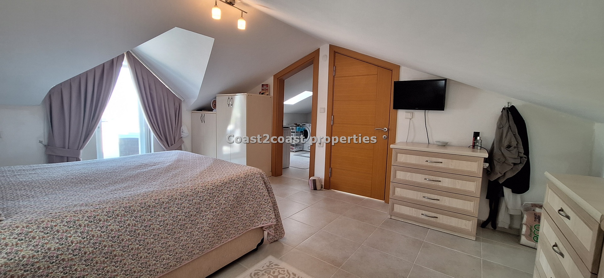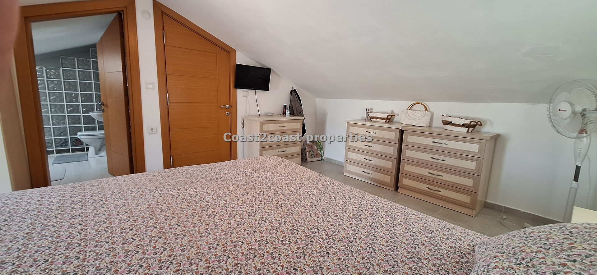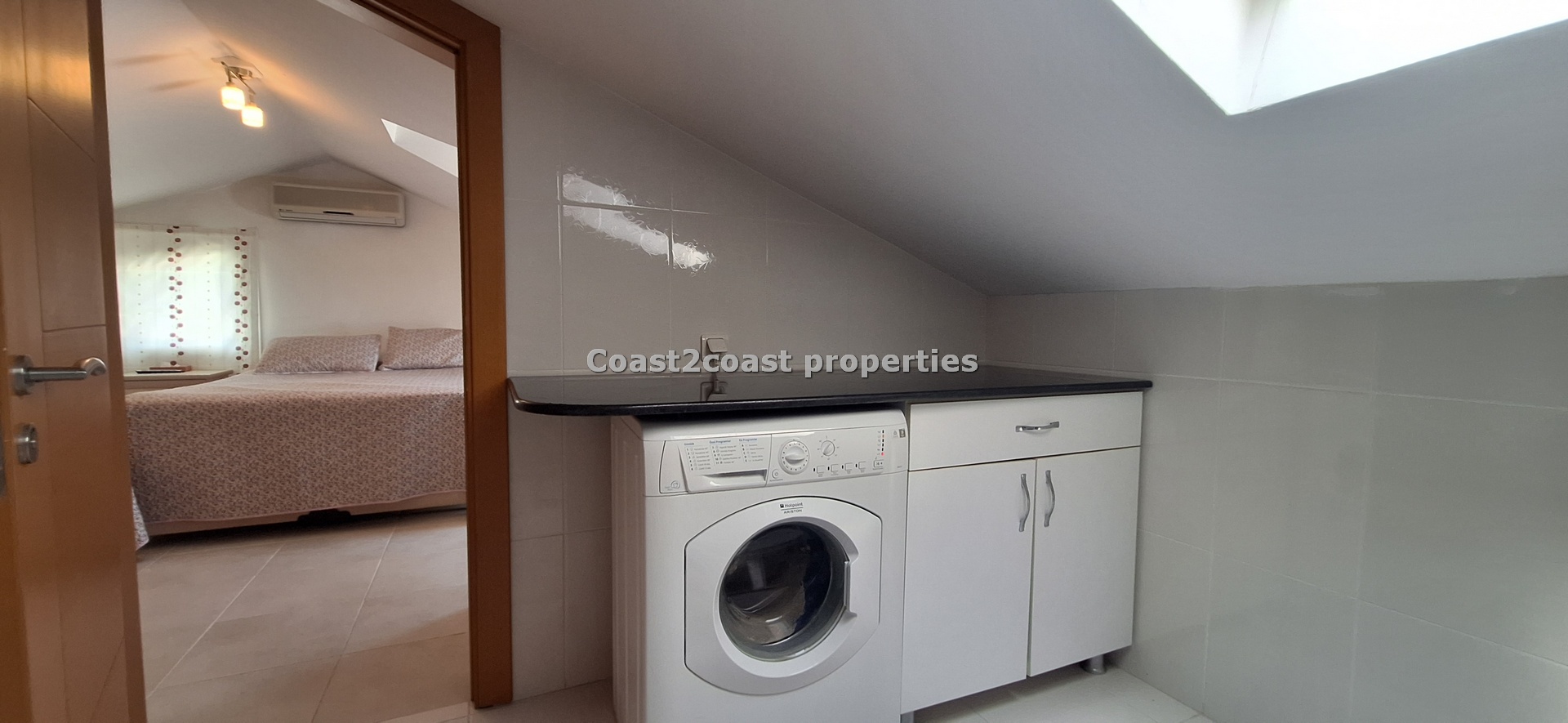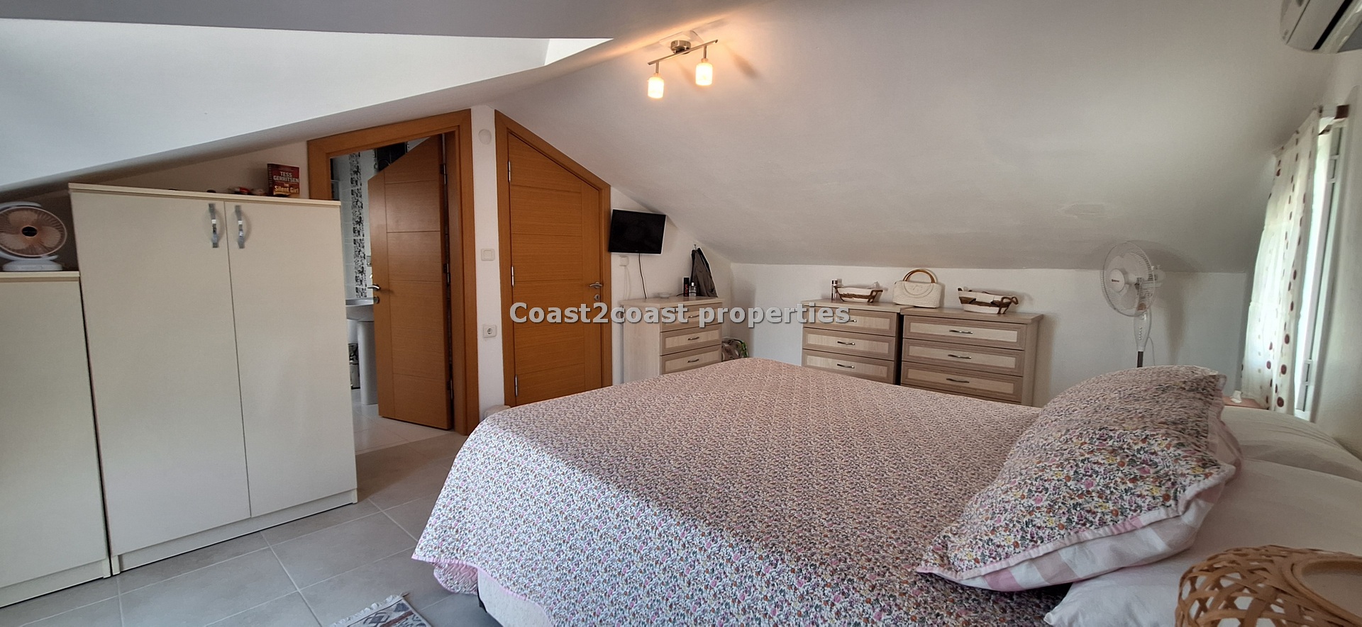 The marble staircase takes you to a large bedroom which is en suite. This again is larger than most rooms. It has lot’s of furniture , again inclusive of the sale of this property in Fethiye. This is a beautiful master bedroom. The en suite design is just wonderful with lot’s of care and attention given to the finishing. There is a working space so this can be used as a laundry room also with appliances. A Special glass brick wall is our shower area. Beautifully done. Light is in the form of a roof window which brightens this area up perfectly. Again we have a WC, sink and mirror areas.