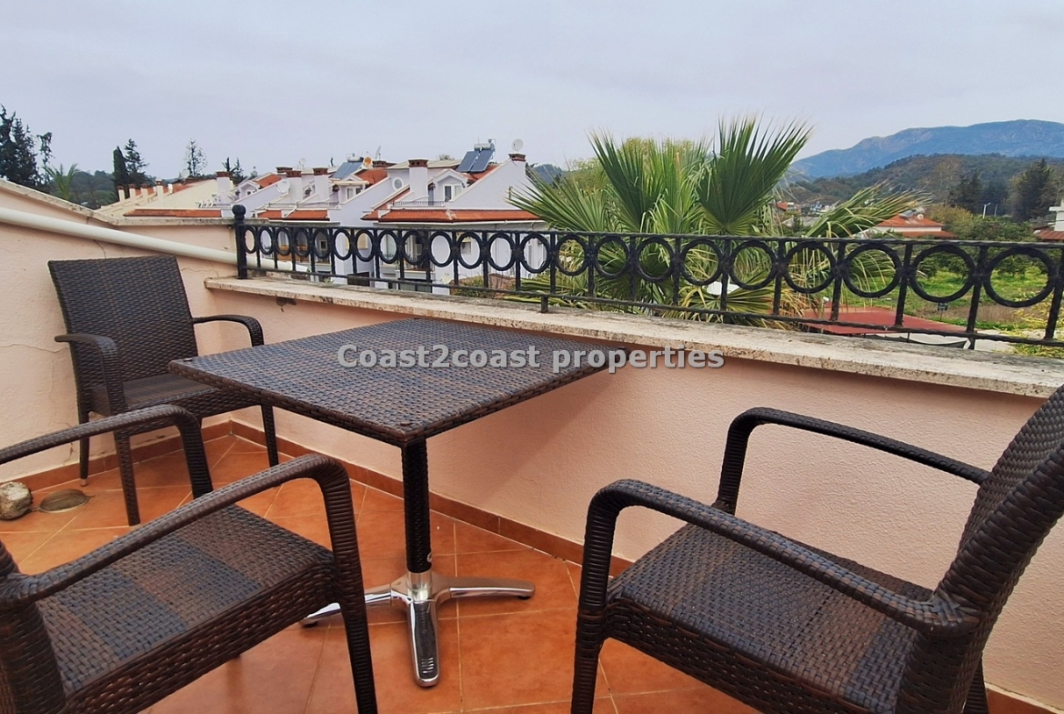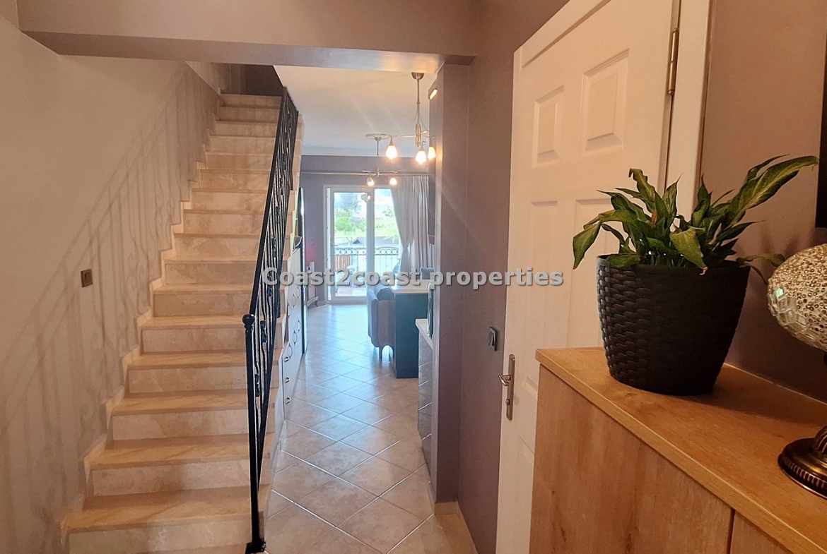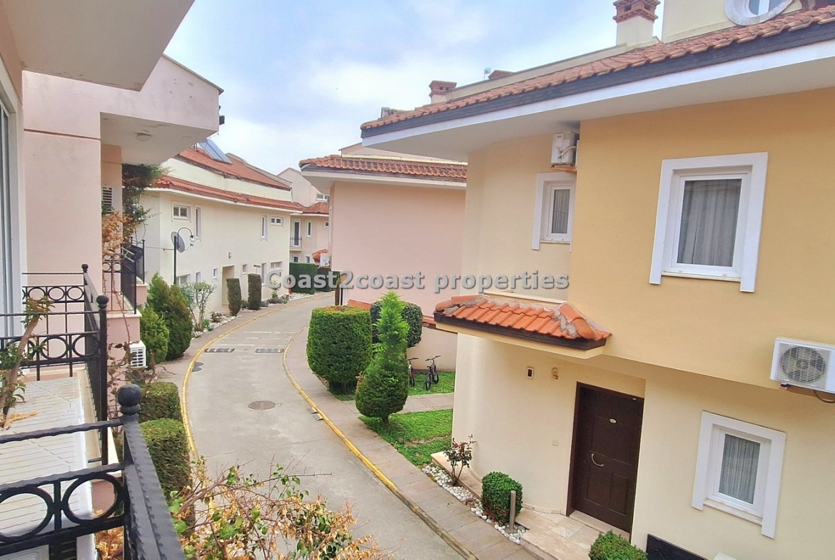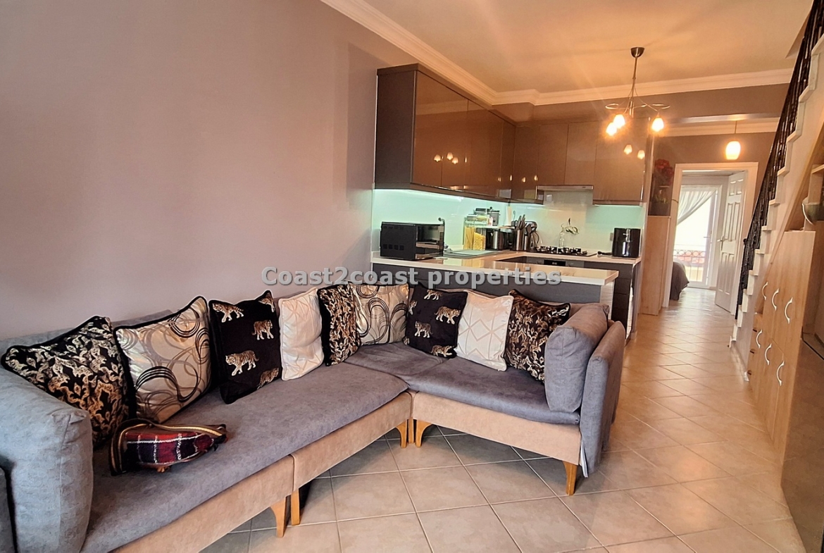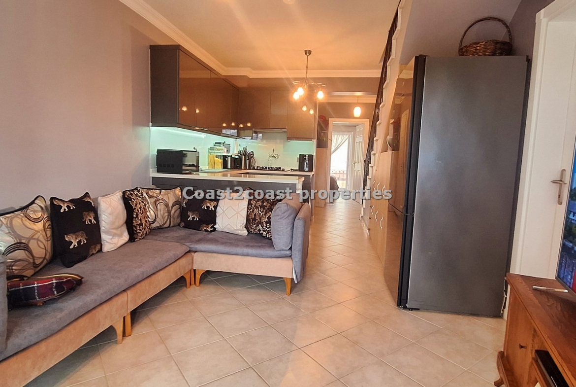 This property for sale in Turkey is a three bedroom on two floors. There is an apartment below this one. The courtyard that leads you up to this property is very nice and spacious with access to 2 swimming pools which this apartment over looks. The entrance level has Lounge, kitchen, 2 double bedrooms, shower room and a balcony.