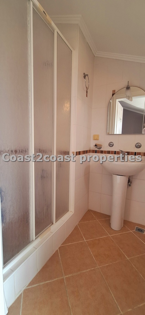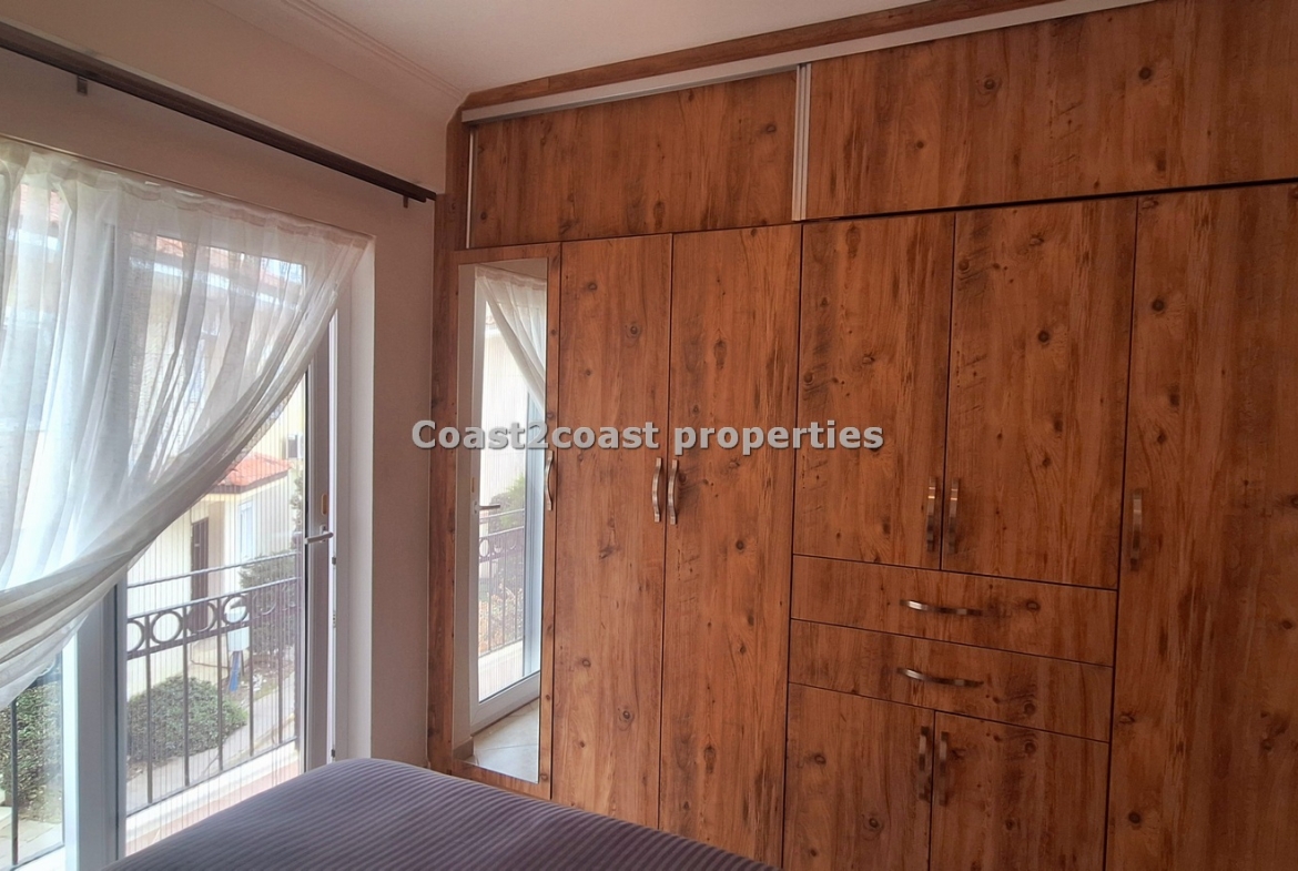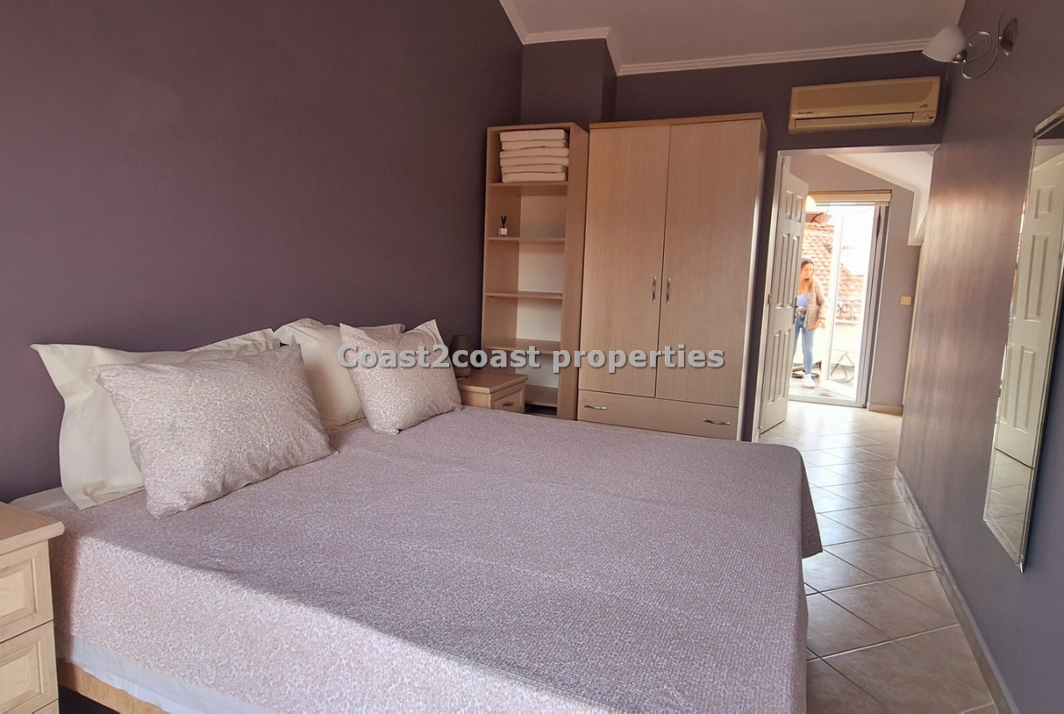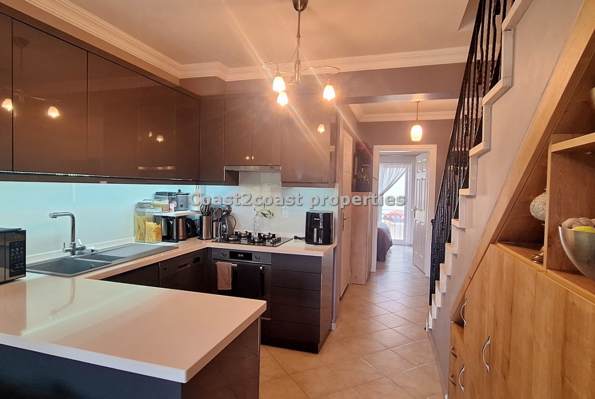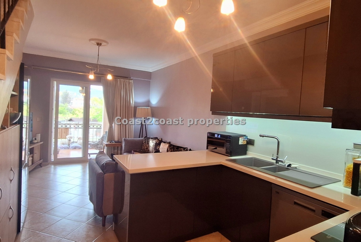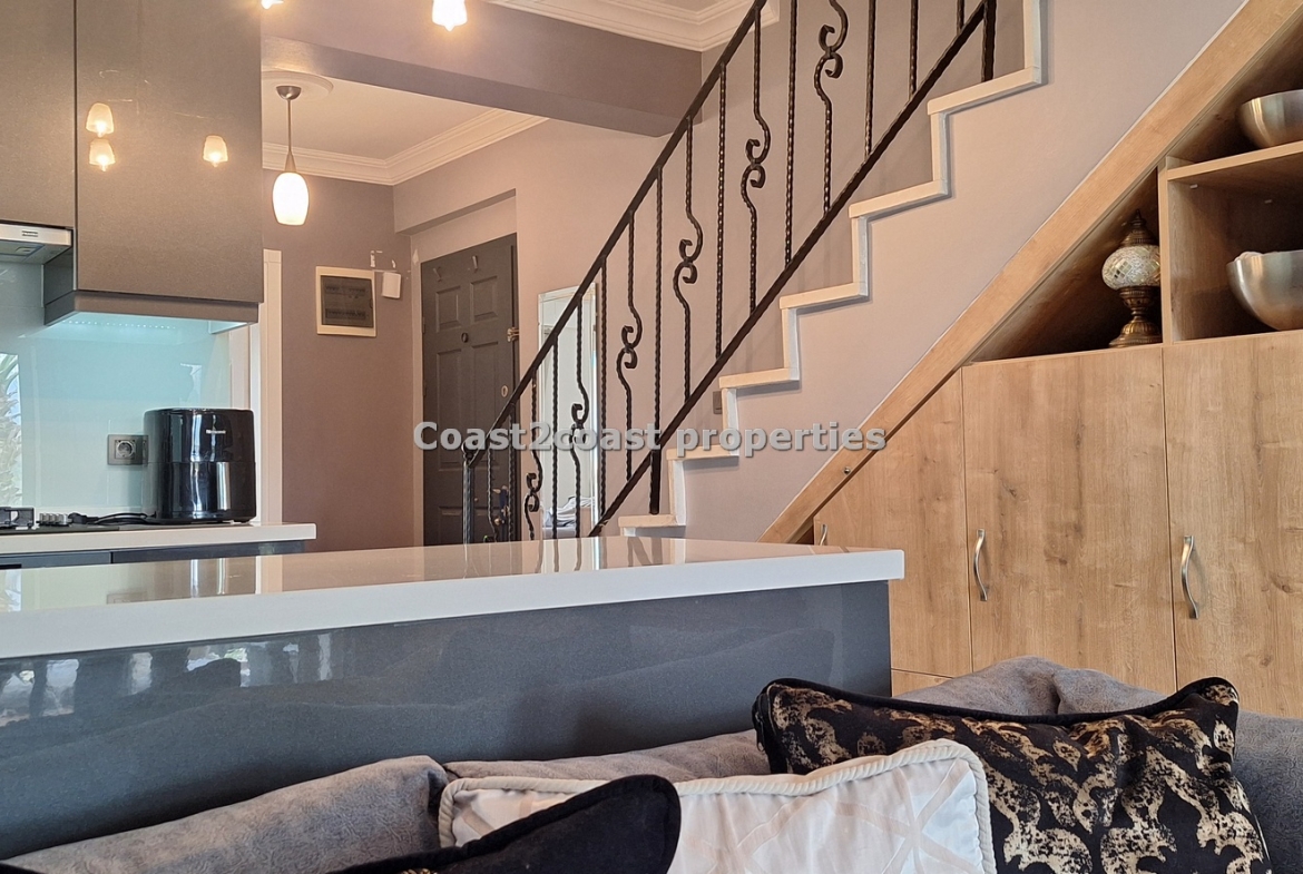 This property for sale in Turkey is a three bedroom on two floors. There is an apartment below this one. The courtyard that leads you up to this property is very nice and spacious with access to 2 swimming pools which this apartment over looks. The entrance level has Lounge, kitchen, 2 double bedrooms, shower room and a balcony.