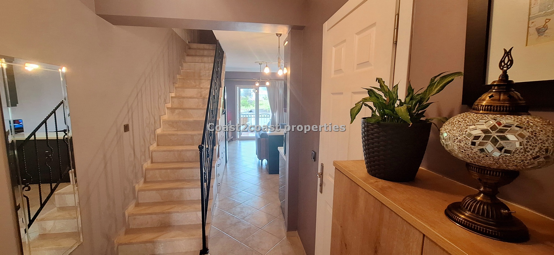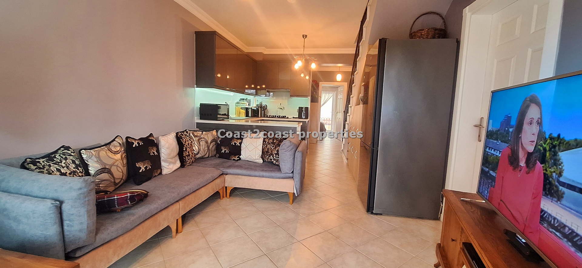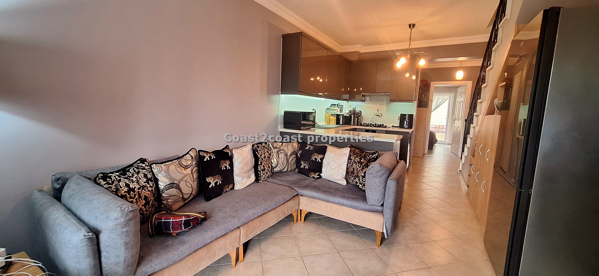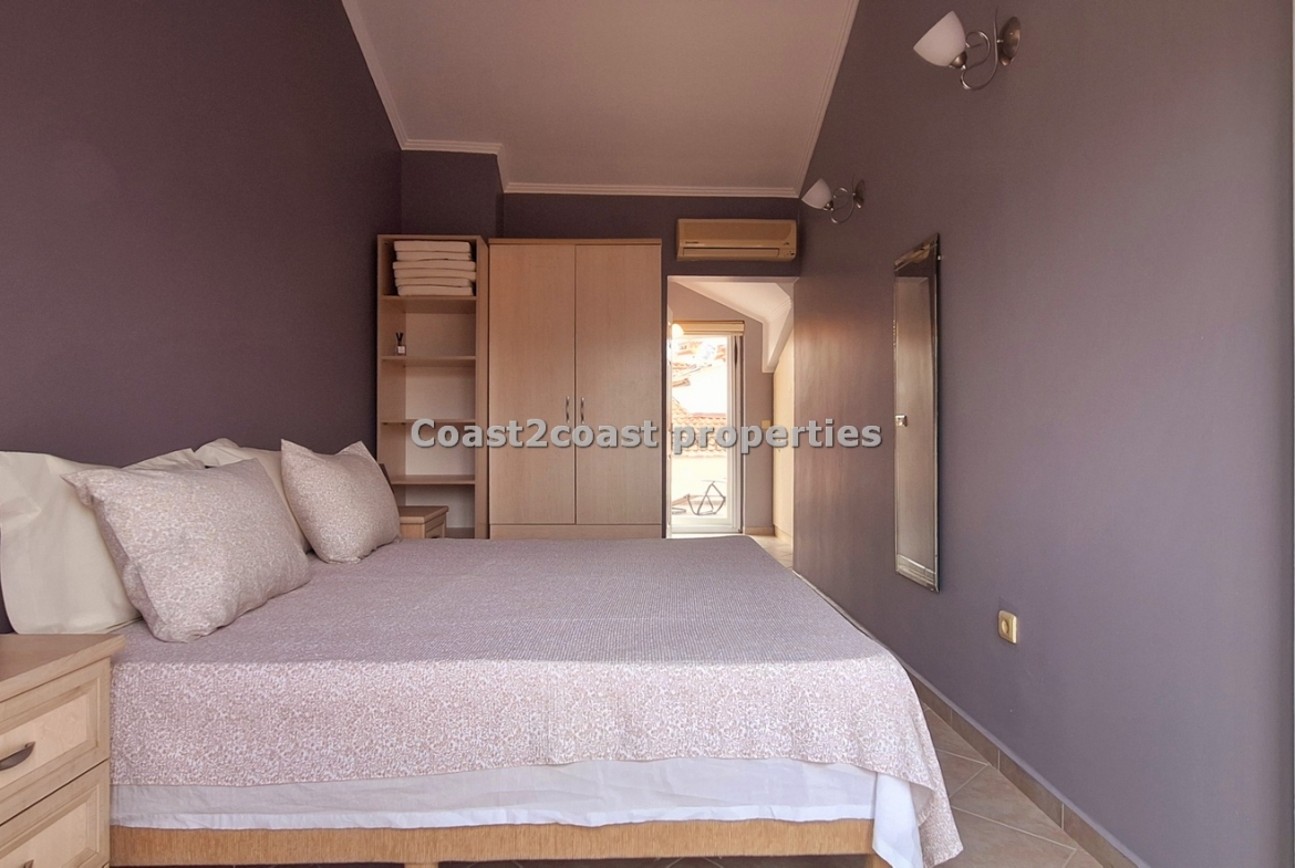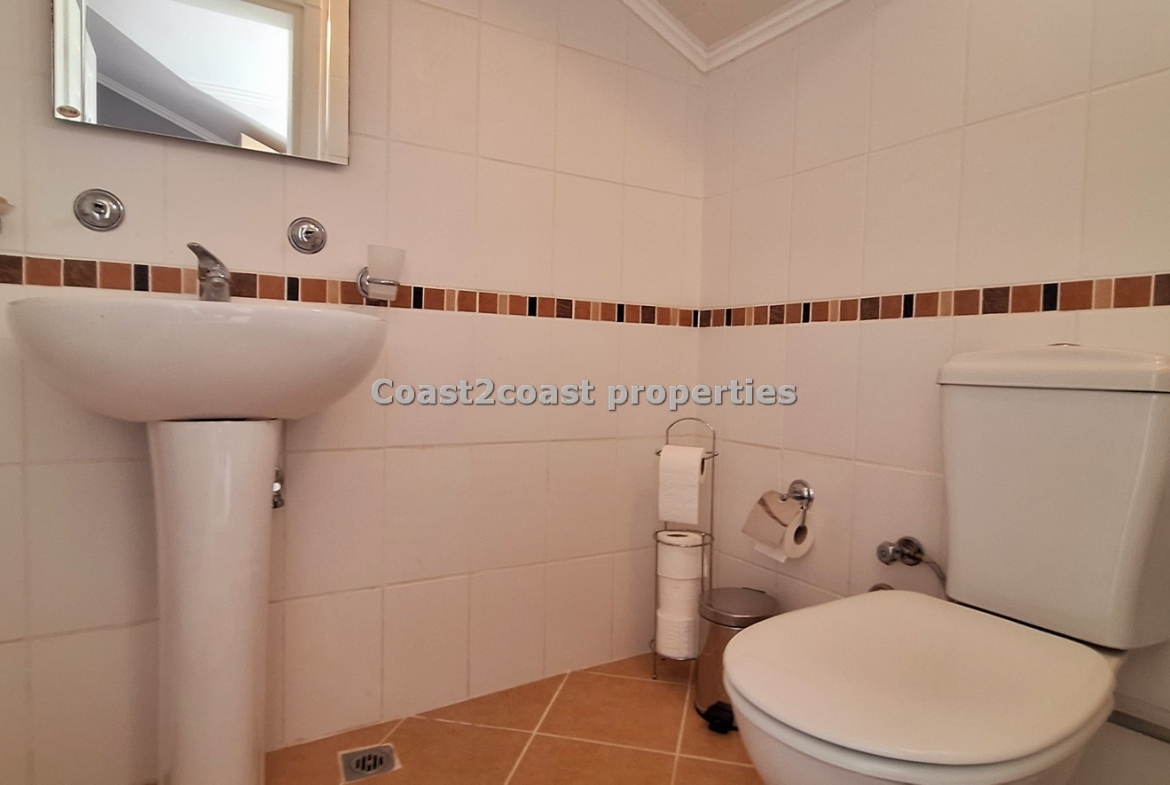 This property for sale in Turkey is a three bedroom on two floors. There is an apartment below this one. The courtyard that leads you up to this property is very nice and spacious with access to 2 swimming pools which this apartment over looks. The entrance level has Lounge, kitchen, 2 double bedrooms, shower room and a balcony.