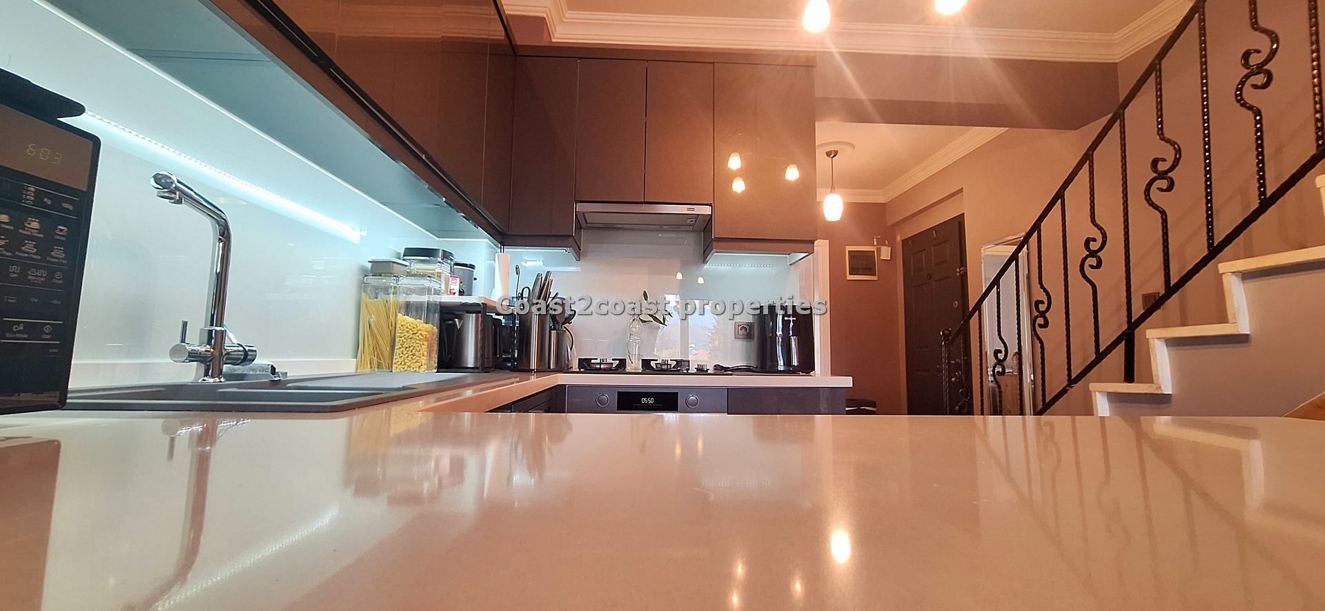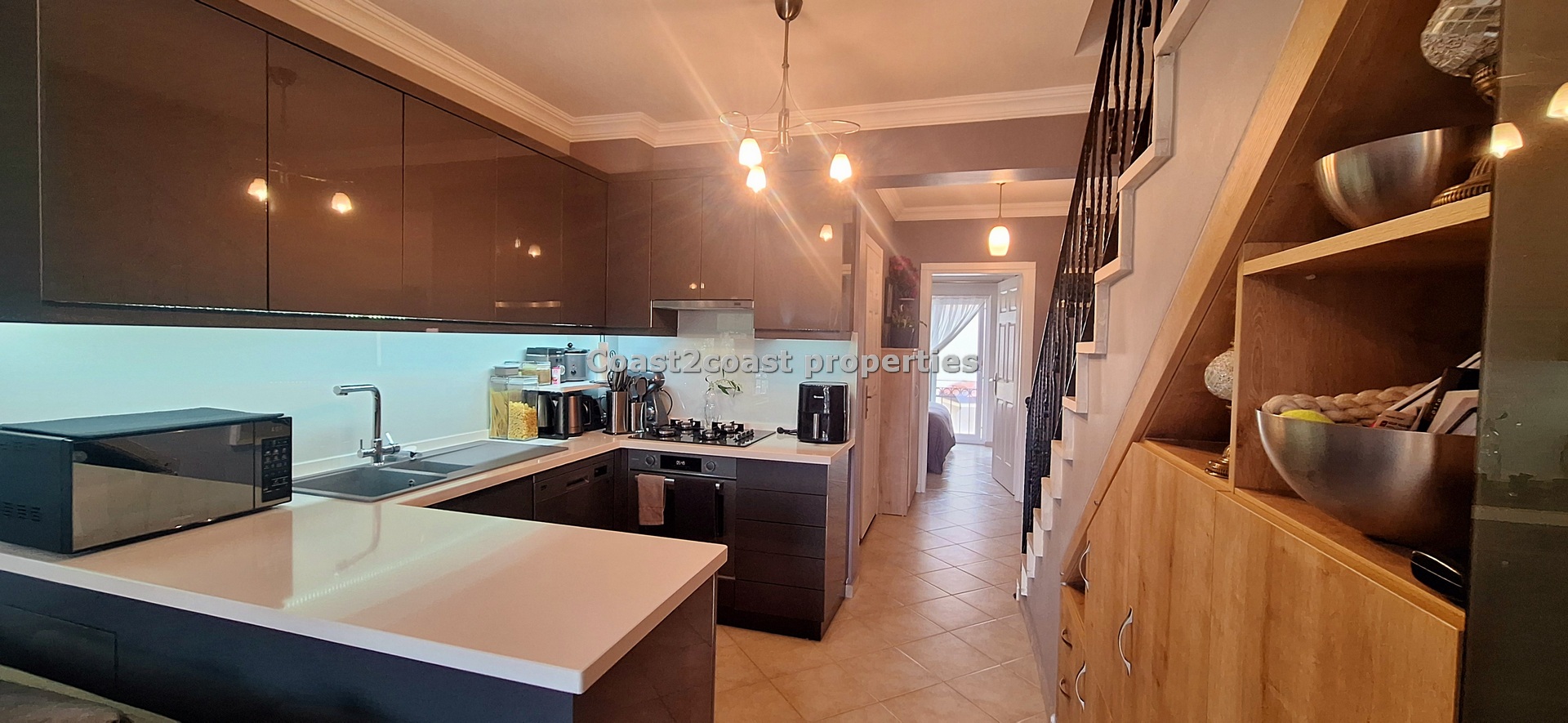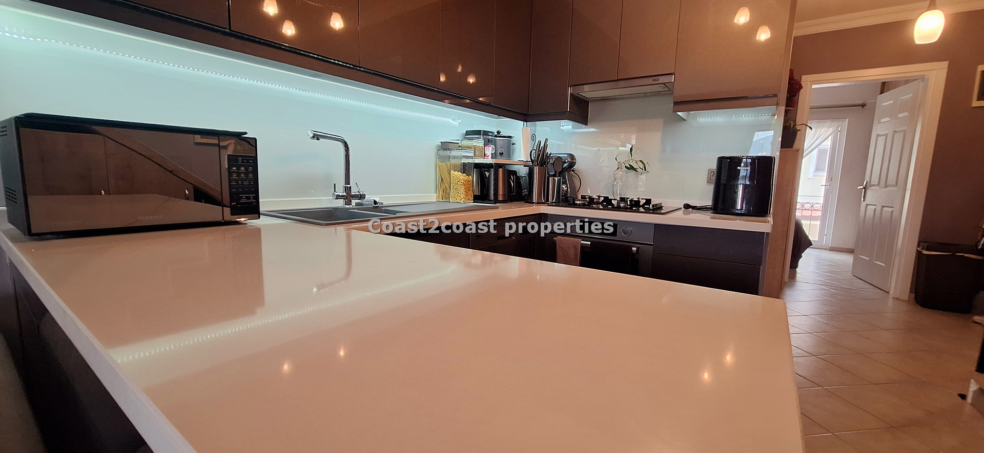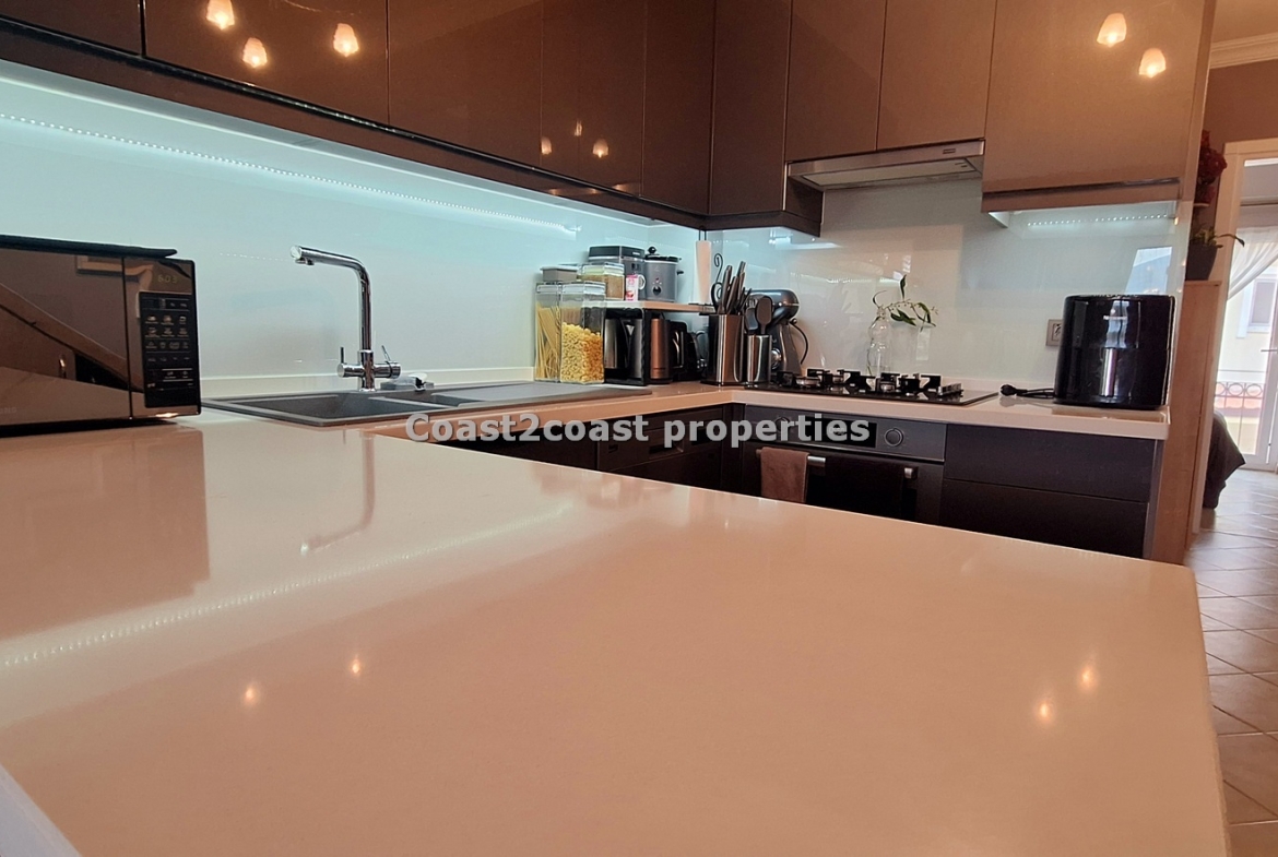 What we can say is the property interior is showroom style throughout. Although coming unfurnished the fixtures and fittings are all quality. So, we enter into the hallway and first come to the stunning modern fitted kitchen. Again the standard is very high with sleek modern doors, marble worktops , built in oven, hob and extractor and finished off with a stunning easy wipe glass backsplash. One of the best fitted kitchens we have seen in an apartment in a long time. Adjacent we have great storage space that leads you to the the lounge. The lounge is facing the back of the complex so very private and quiet. The double doors lead you onto a large balcony which has a built in BBQ and over looks the gardens, pool and offers quite stunning mountain views. From the kitchen to the lounge then to the balcony flows real good!