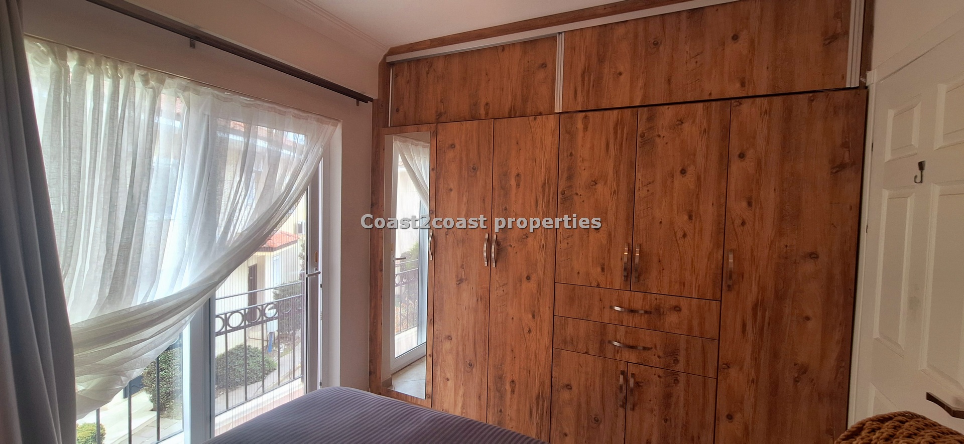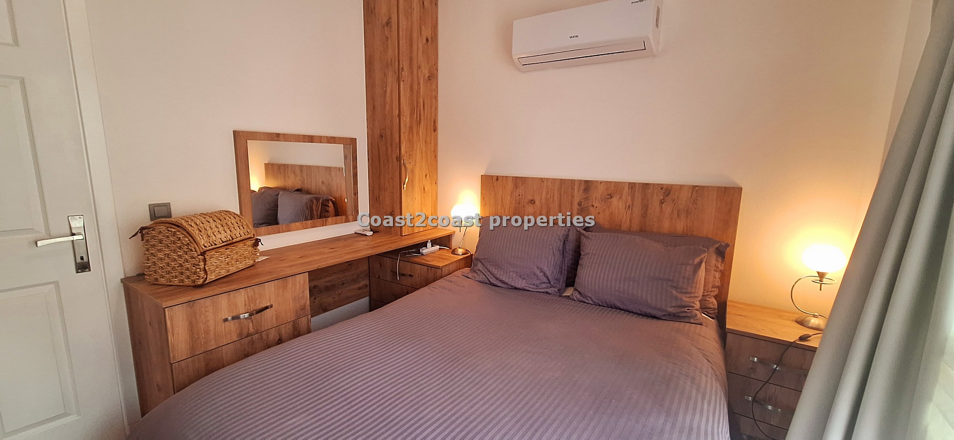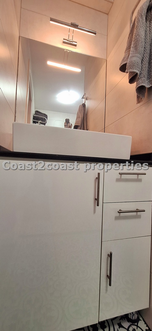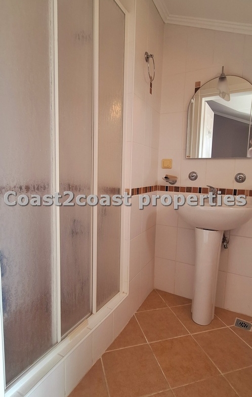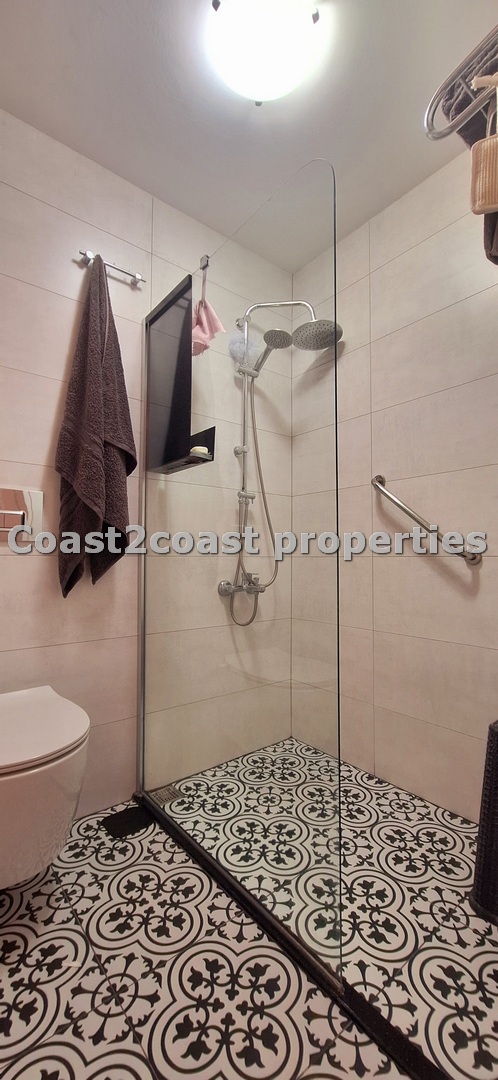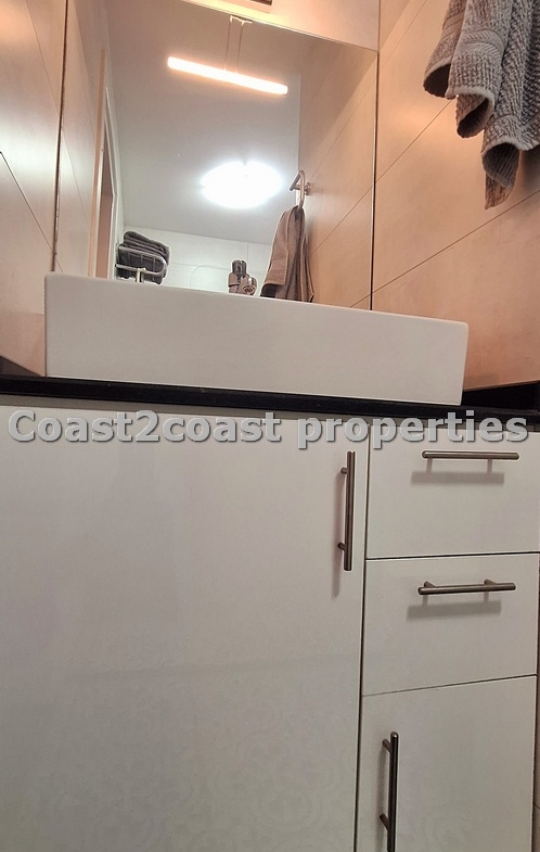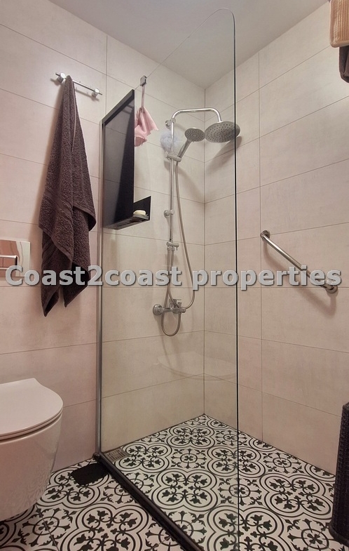 We have a double room off the lounge area. At the other end of the hallway we have another double bedroom which boasts large built in wardrobes plus a shared shower room. This has ceramics, floor to ceiling and has a glass front with a modern shower. Next we have a vanity unit with mirror and extra storage. Again the quality throughout is impressive!