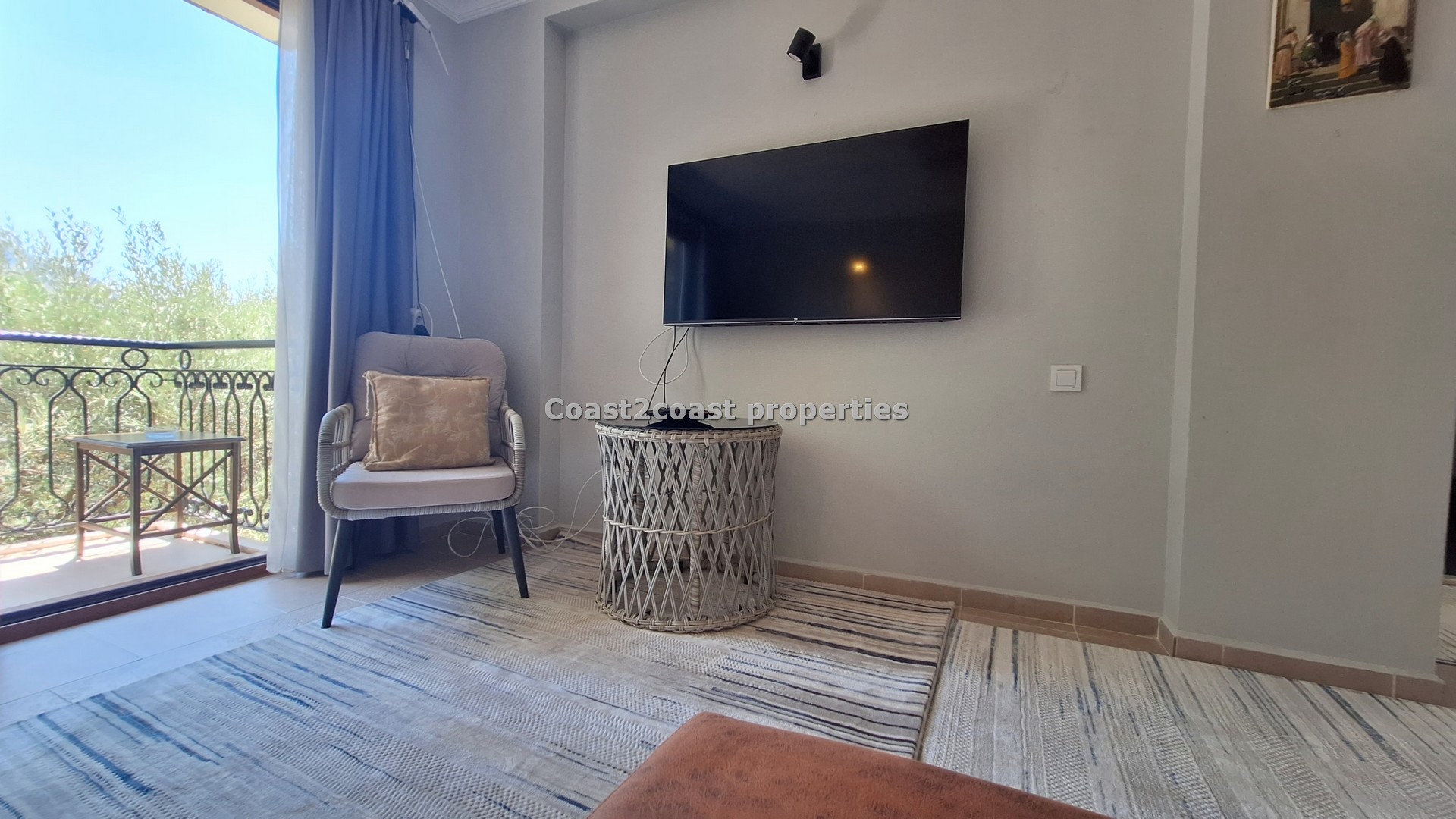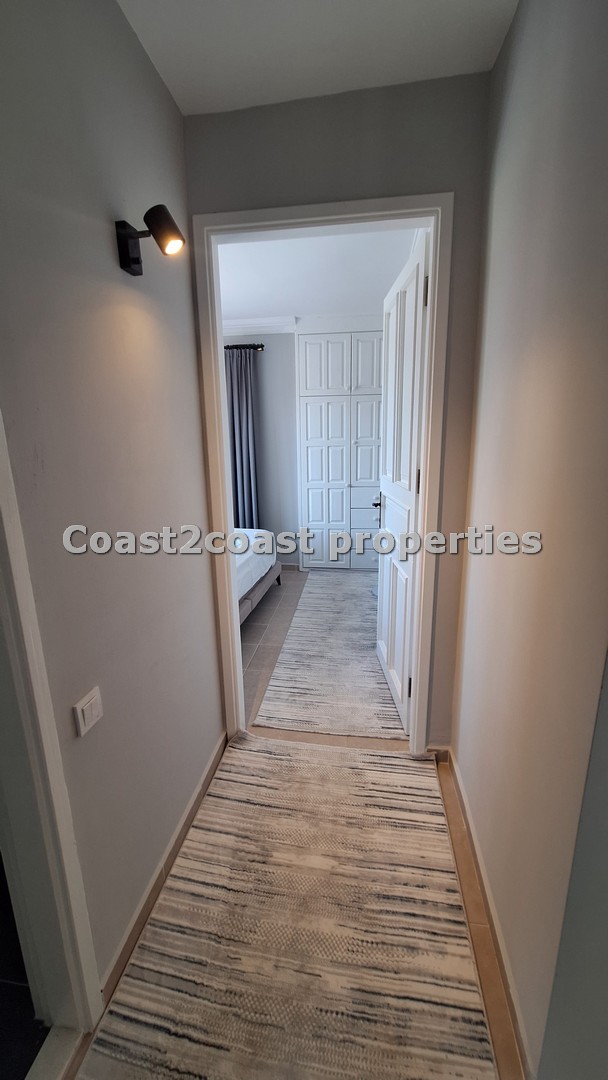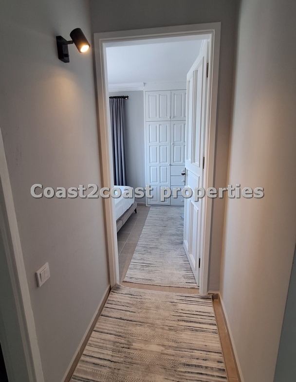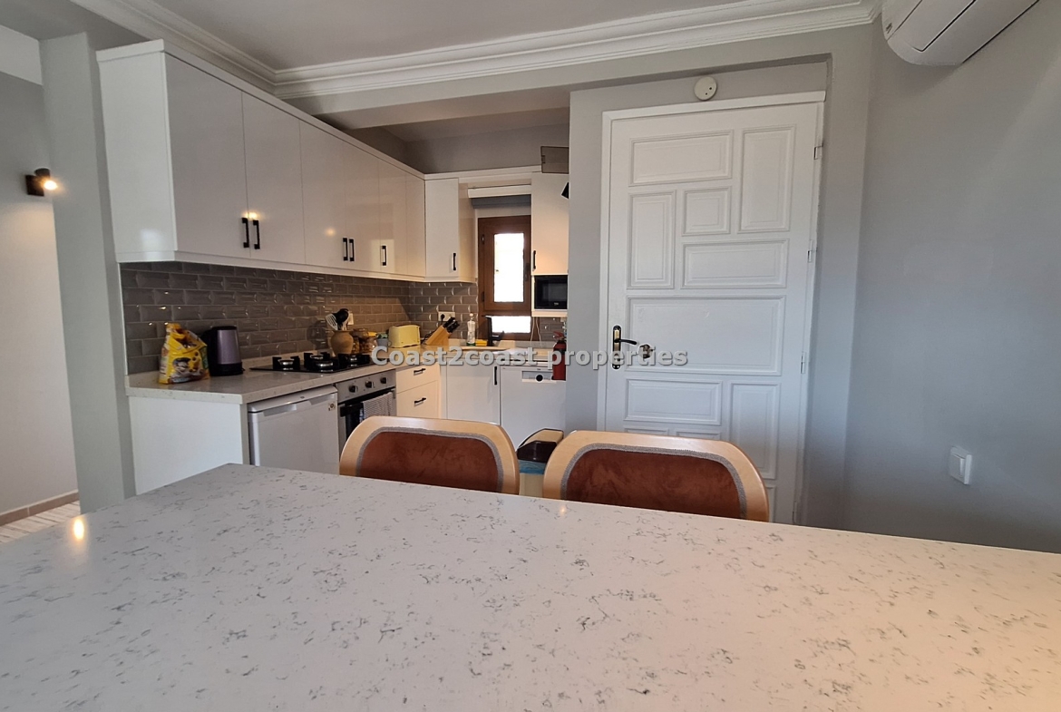 A 2 bedroom top floor apartment . The property as said comes fully furnished. We have a lounge which is open plan and an American style open kitchen together. The lounge is a good size with double glazing doors leading you to a balcony offering great mountain views. The lounge and kitchen are separated by a modern breakfast bar with high chairs plus under storage and also a fridge.