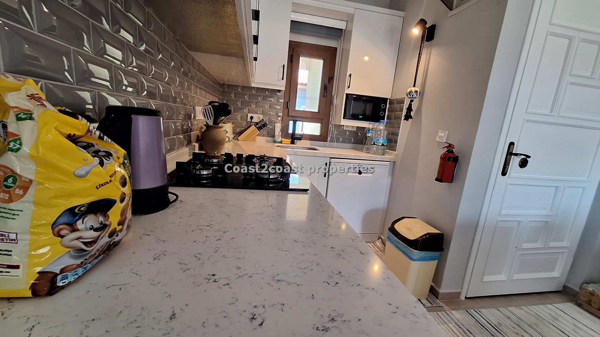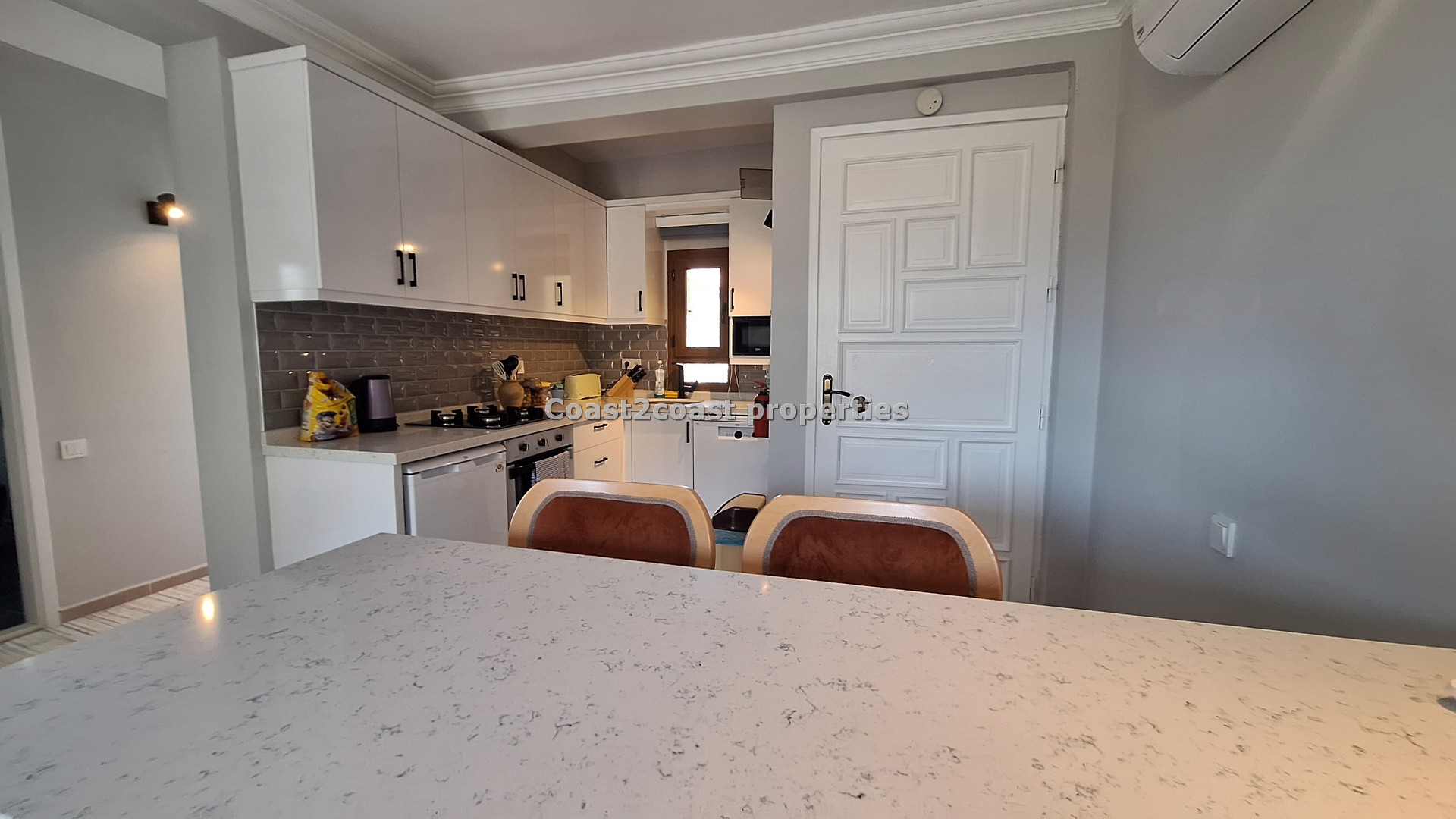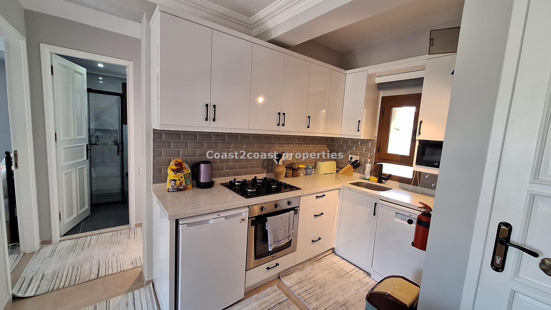 The kitchen is all new , modern and slick! Great worktop, marble style with white units and lot’s of storage space again. The tiled splash back compliments the white modern units and the worktop.