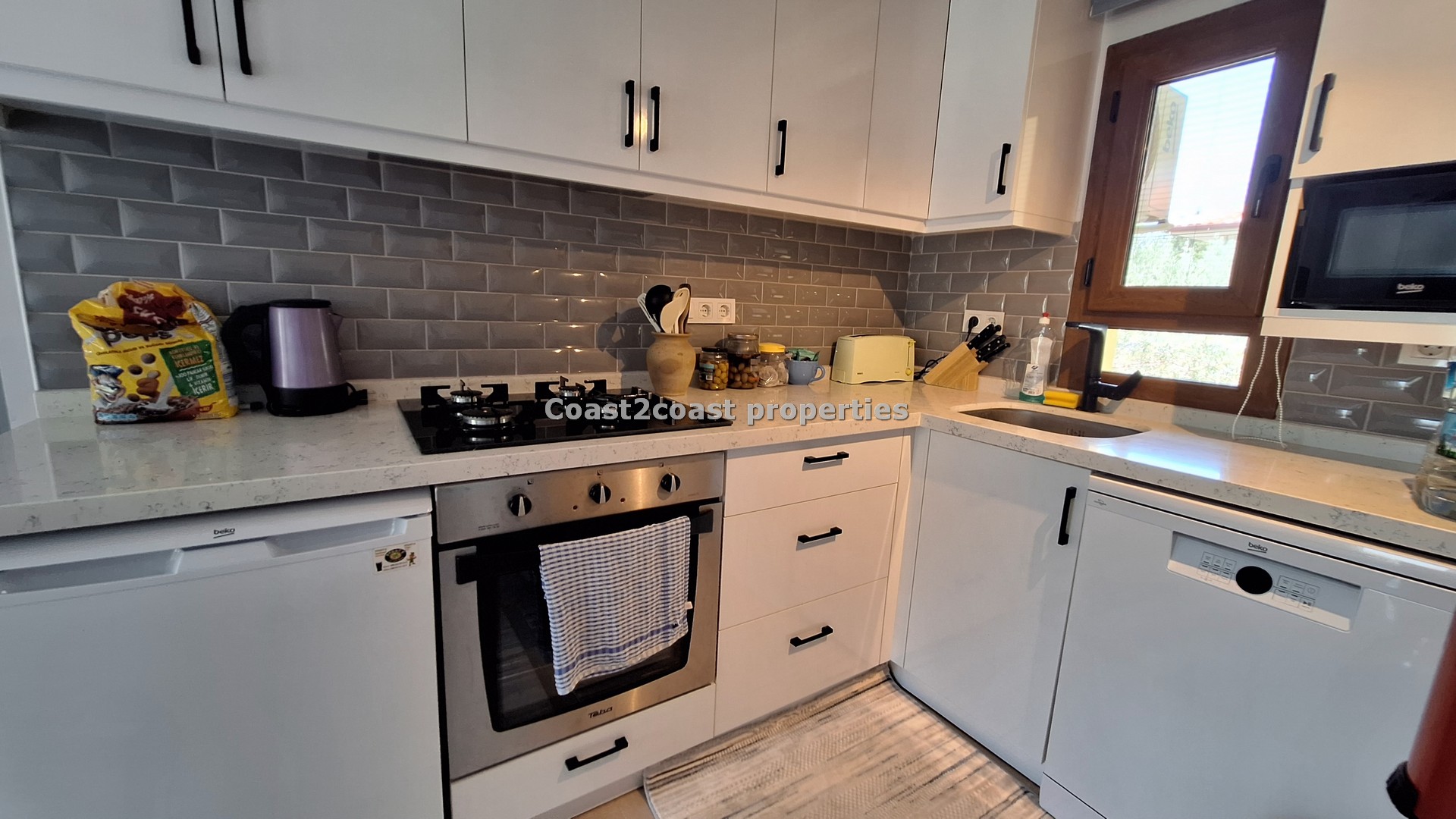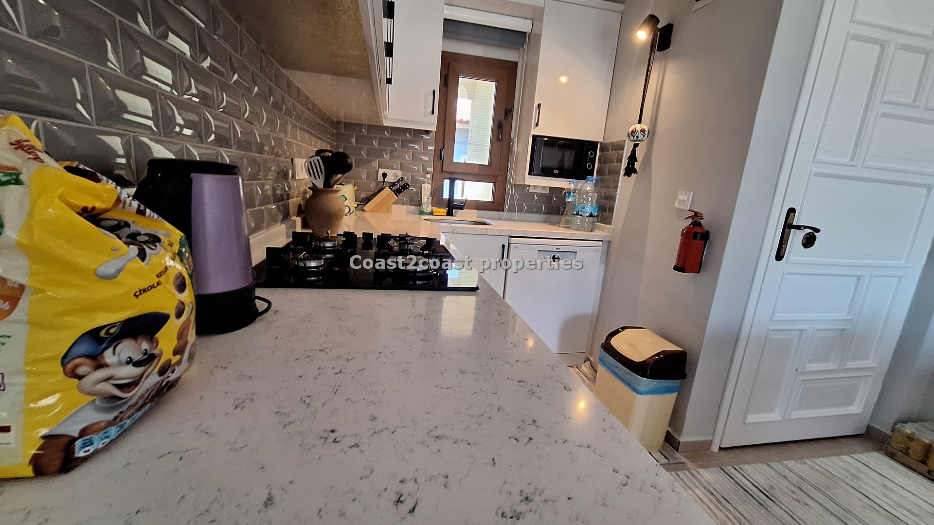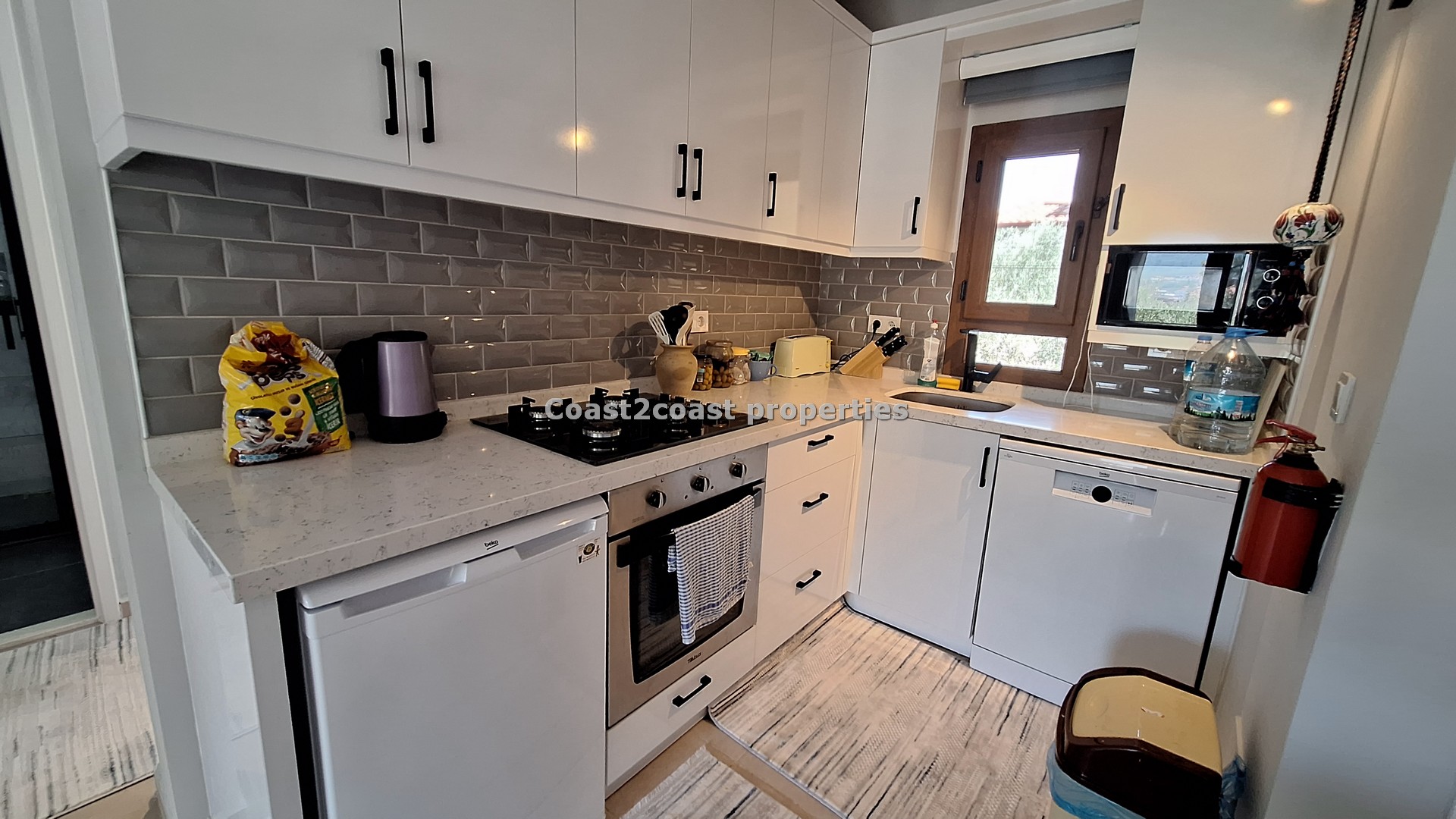 The kitchen is all new , modern and slick! Great worktop, marble style with white units and lot’s of storage space again. The tiled splash back compliments the white modern units and the worktop.