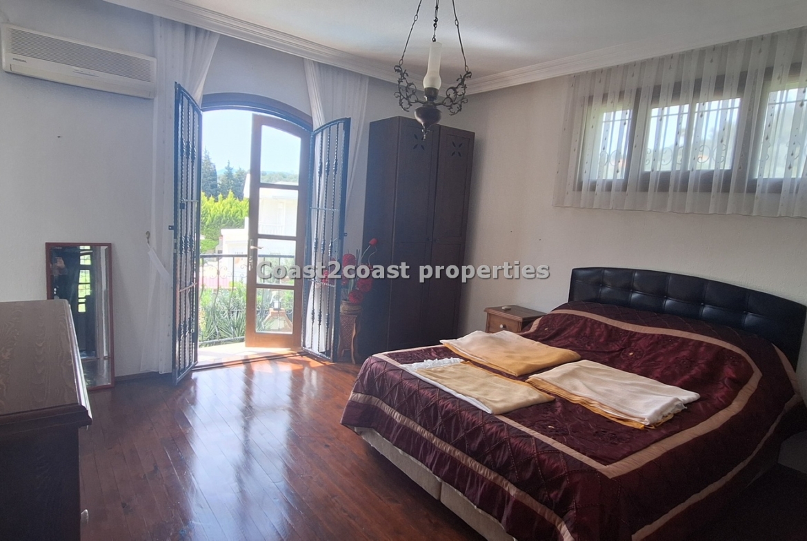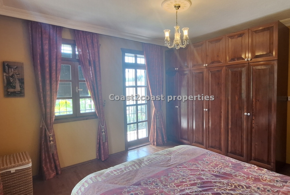 The stunning wooden staircase takes you to the next level. All the floors a real wood on this level. We have 3 double bedrooms, 1 en suite and a shared shower room. Bedroom one we would class as the master bedroom is very large with en suite.  The en suite is a shower room with cubicle and vanity unit. Wooden floors and lot’s of big furniture in terms of wardrobes and units. The doors lead you to a small French window with beautiful country views. There is also access to a large balcony that again has the most stunning mountain views plus pool and gardens. You could spend most of your day chilling here easily.