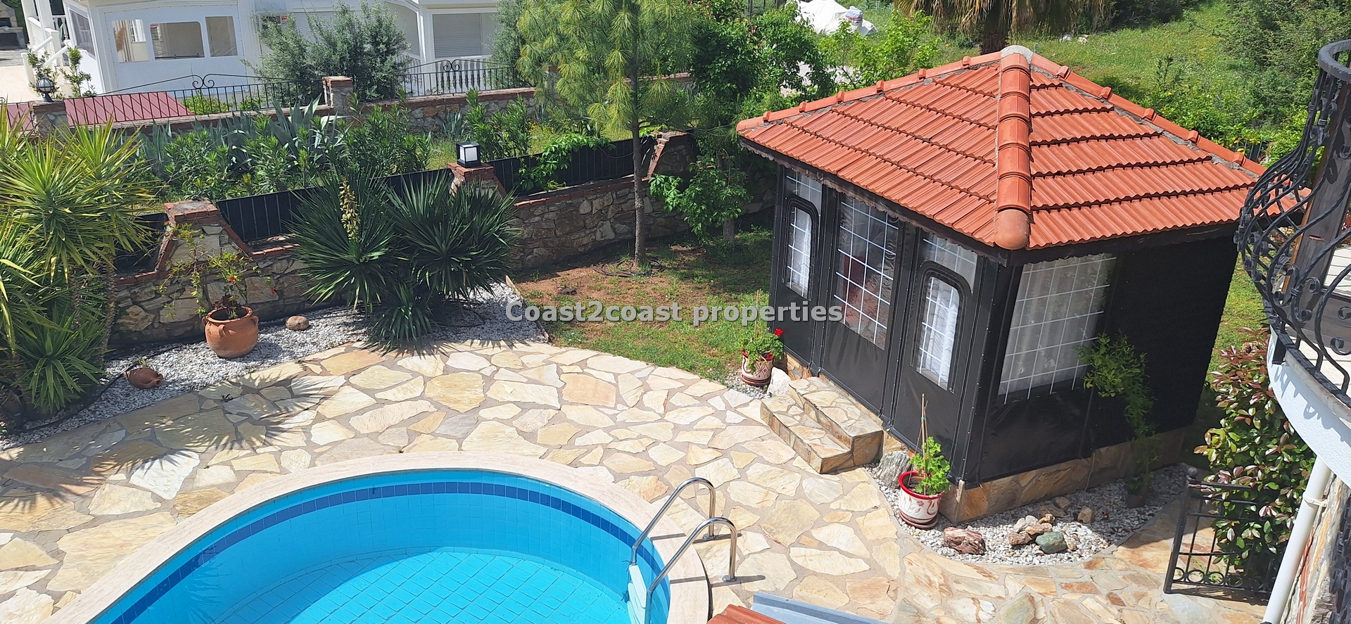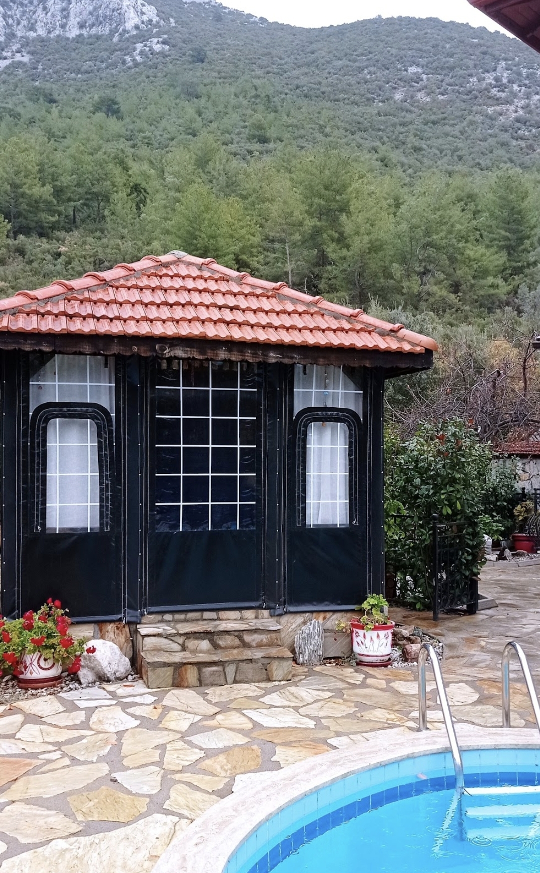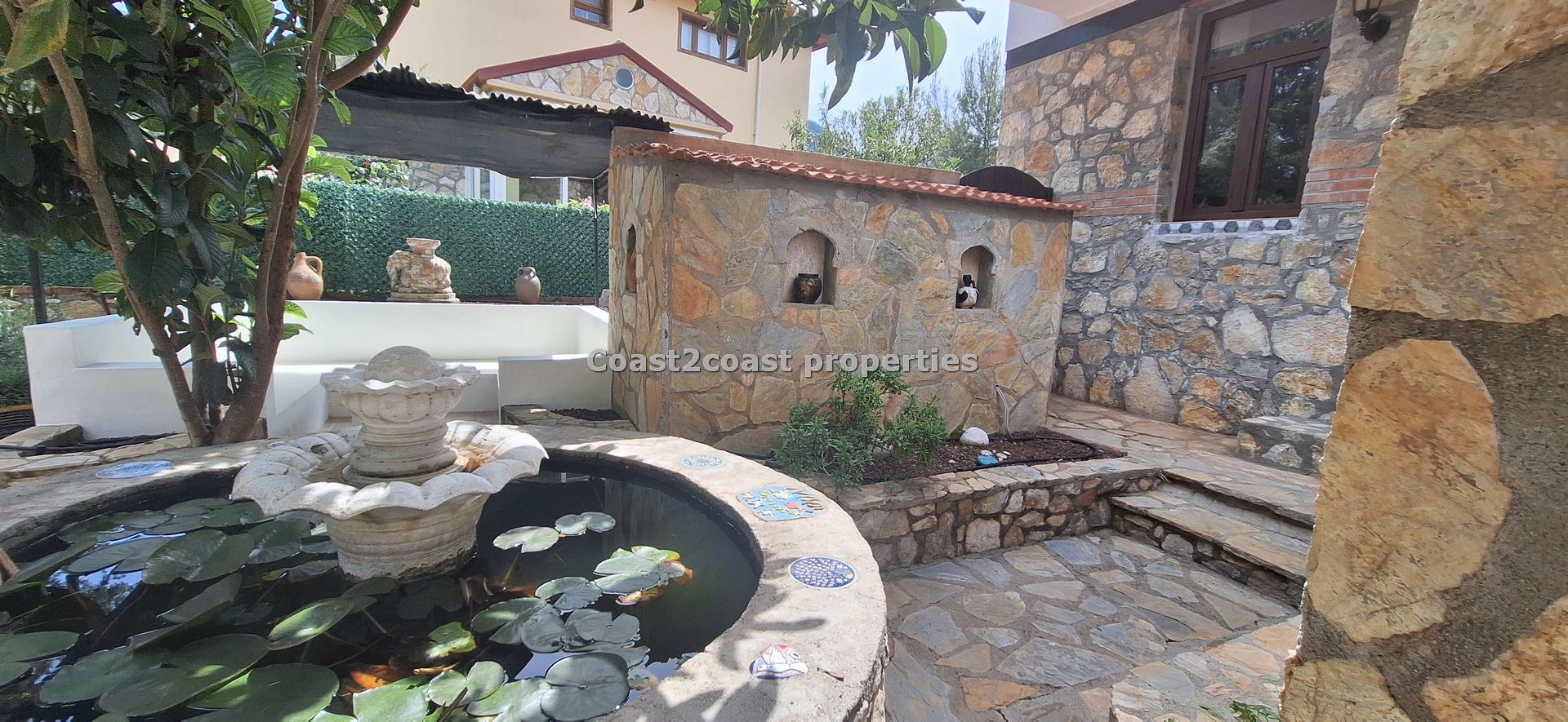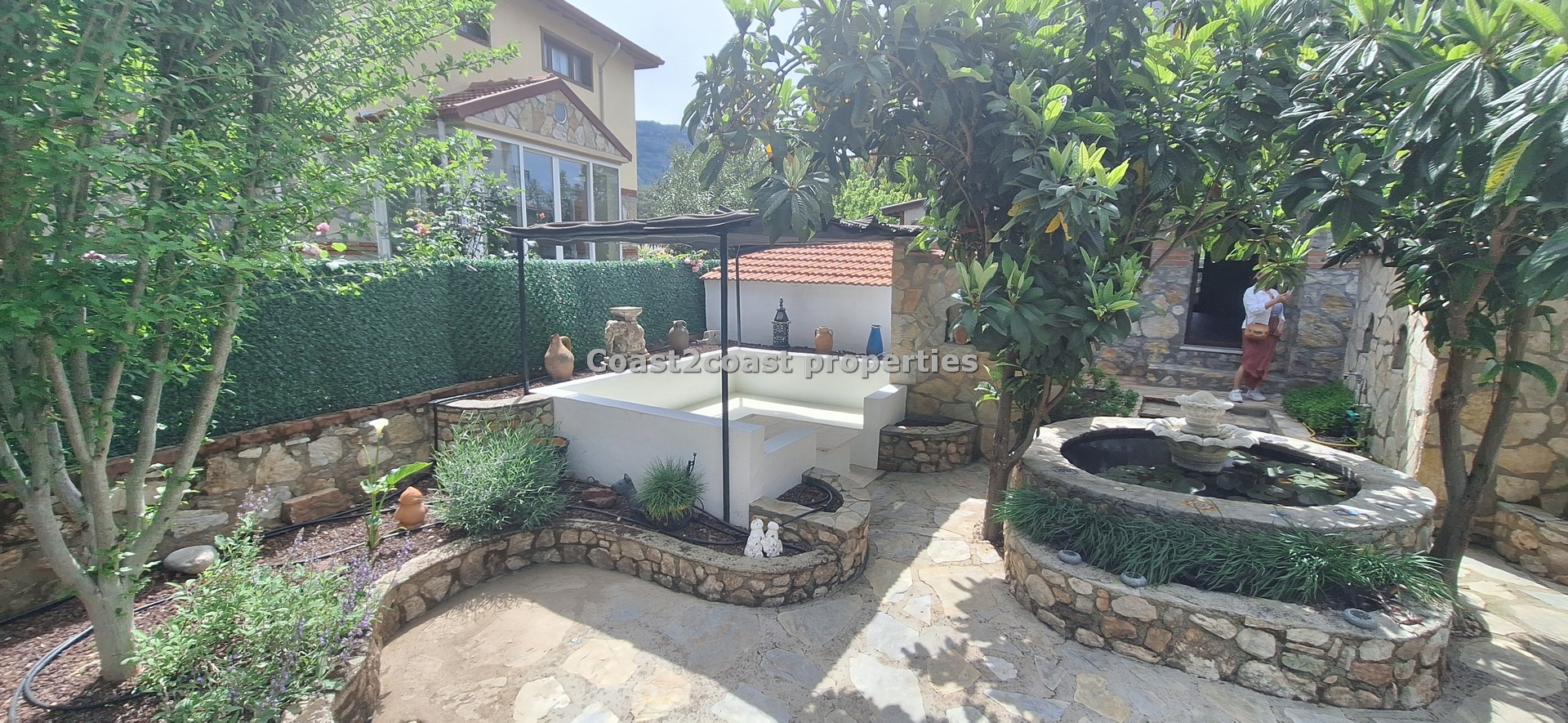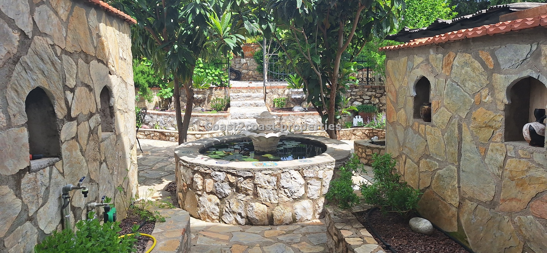 Stone walls that are fitting to the surroundings. The gardens have many different parts to explore. We have of course the poolside which has a kidney shaped pool and a great size for family fun. Around the pool area we have also a Turkish Kuş (covered seating area) which is a brilliant area to get out of the sun in the hot summer months to cools down. This can also be used in the winter months as it can close up also. Not only is it practical, but it looks fantastic.