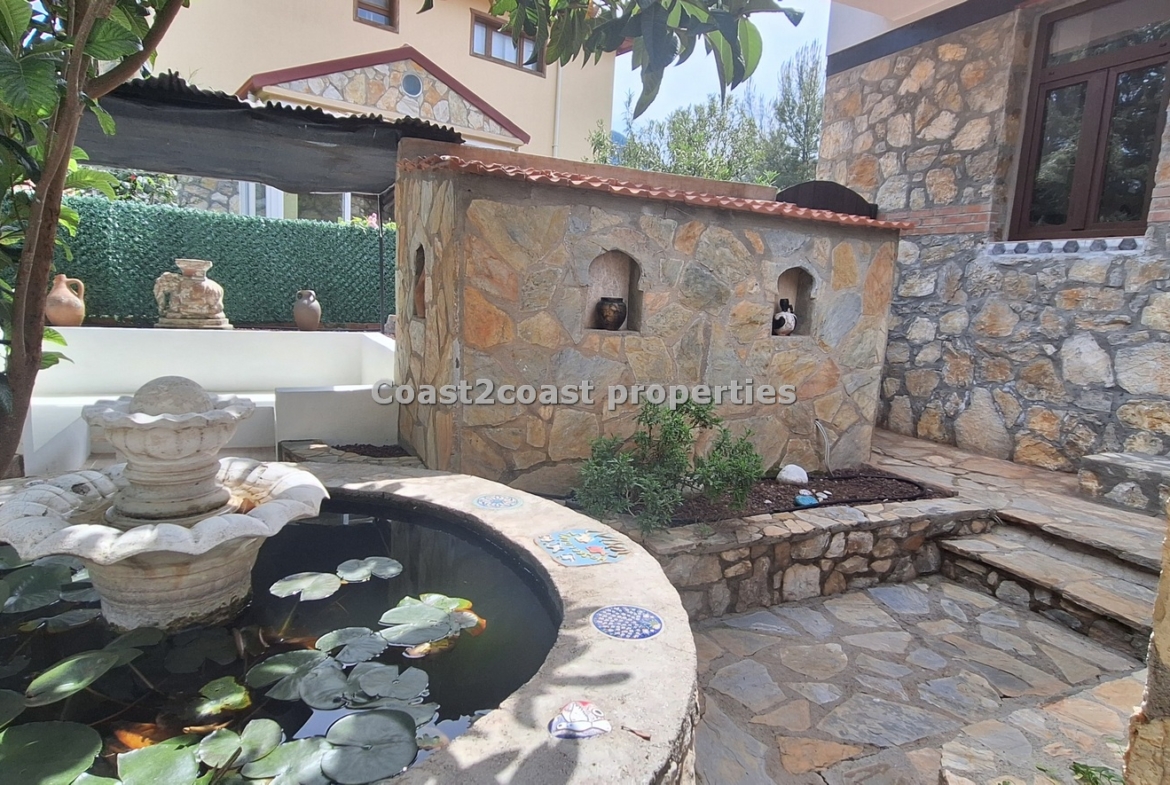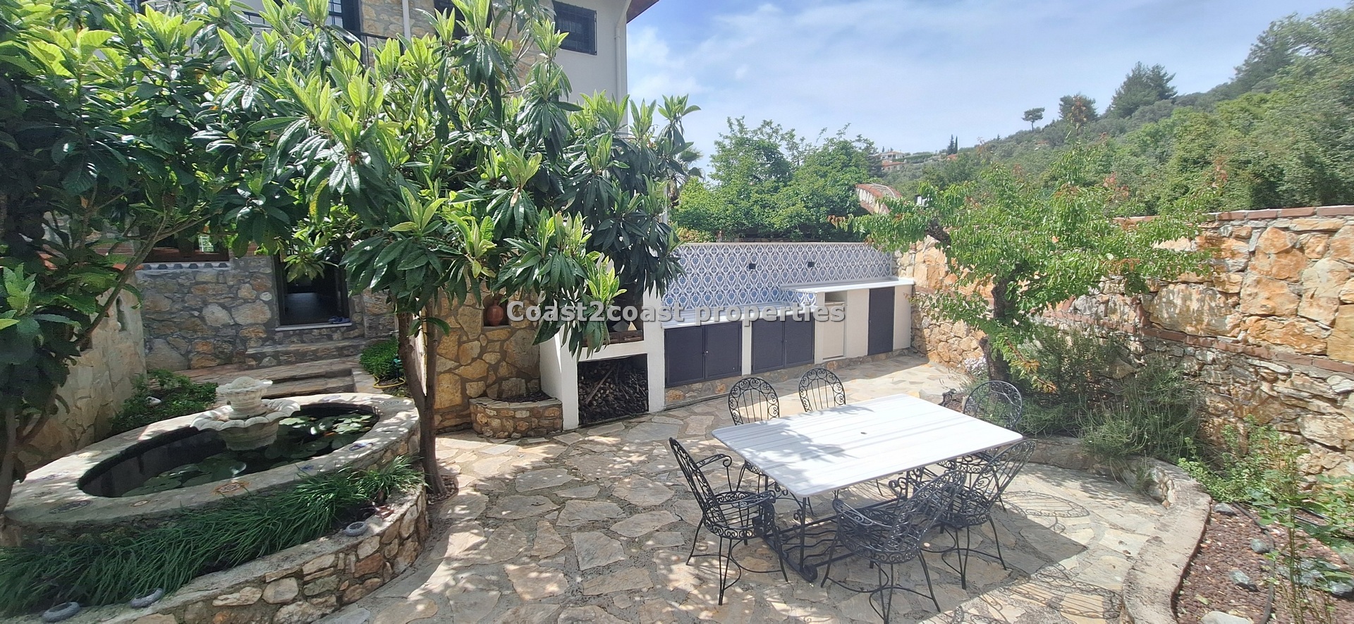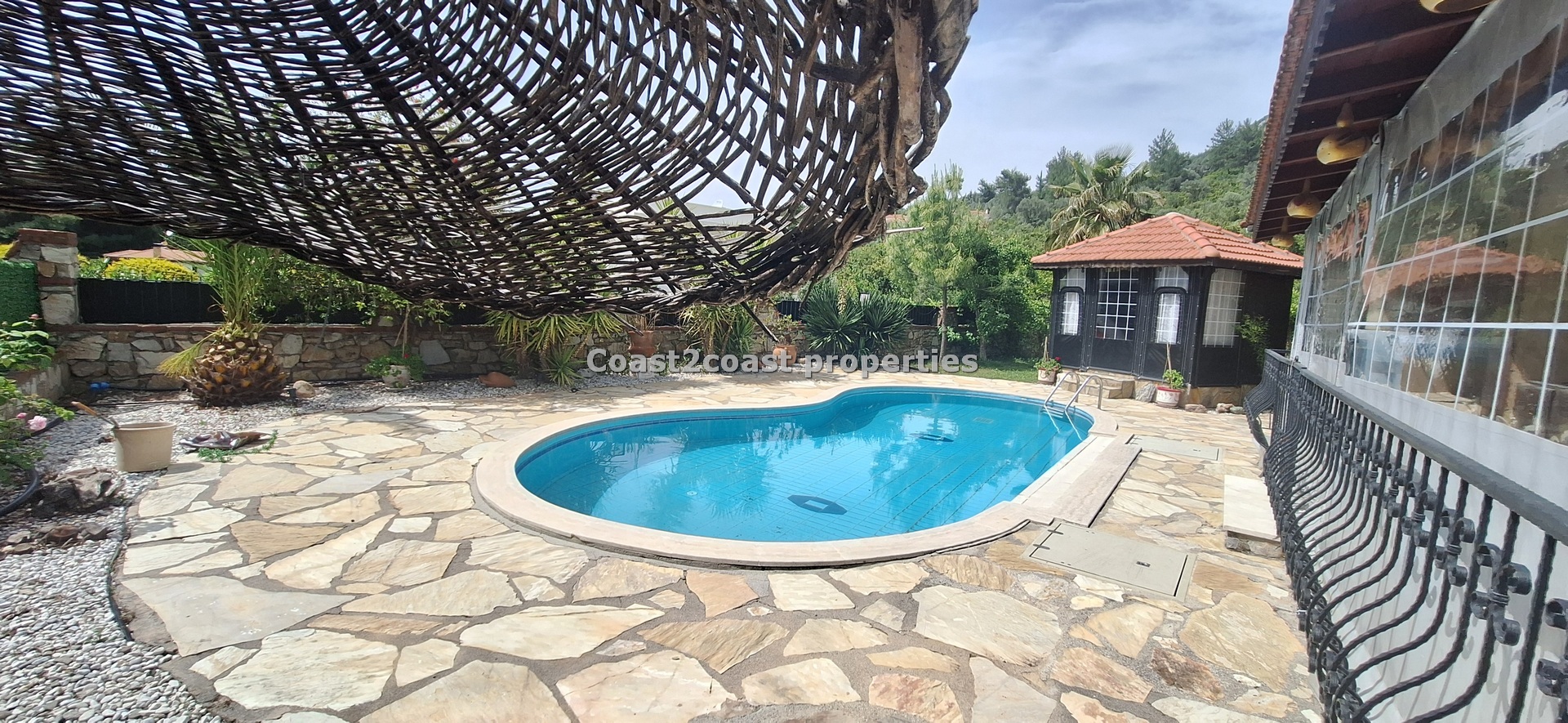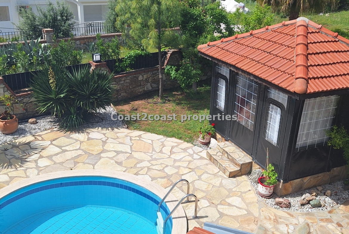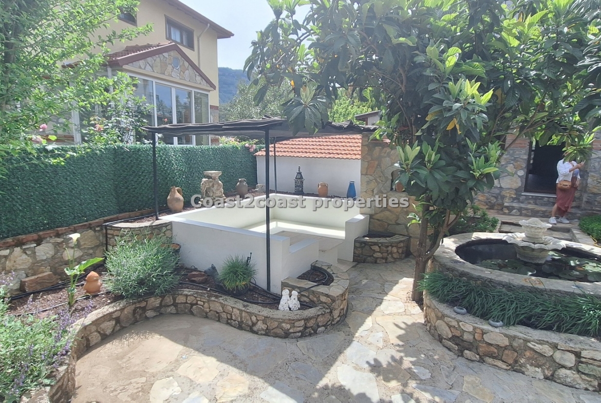 Stone walls that are fitting to the surroundings. The gardens have many different parts to explore. We have of course the poolside which has a kidney shaped pool and a great size for family fun. Around the pool area we have also a Turkish Kuş (covered seating area) which is a brilliant area to get out of the sun in the hot summer months to cools down. This can also be used in the winter months as it can close up also. Not only is it practical, but it looks fantastic.