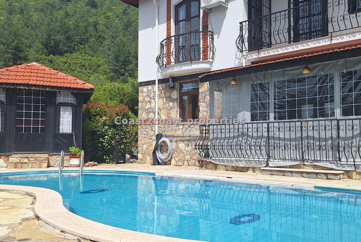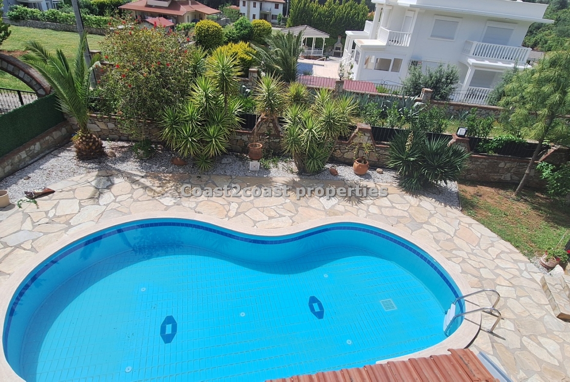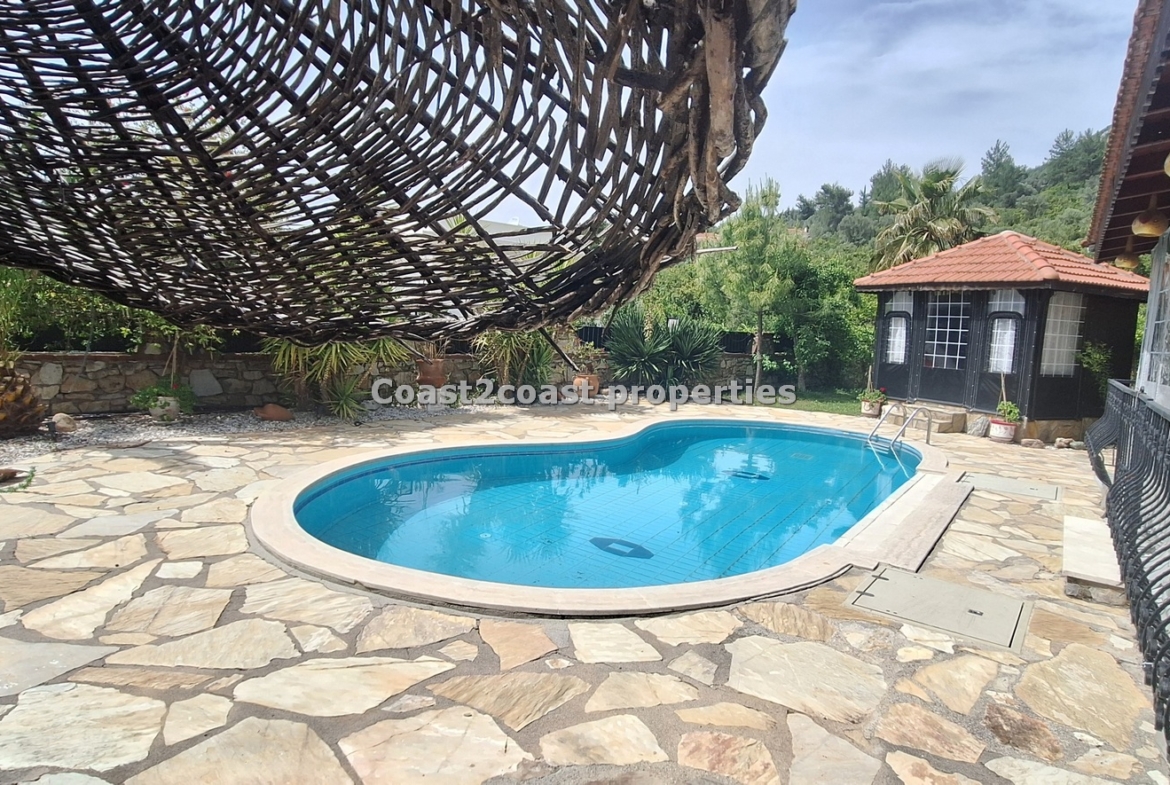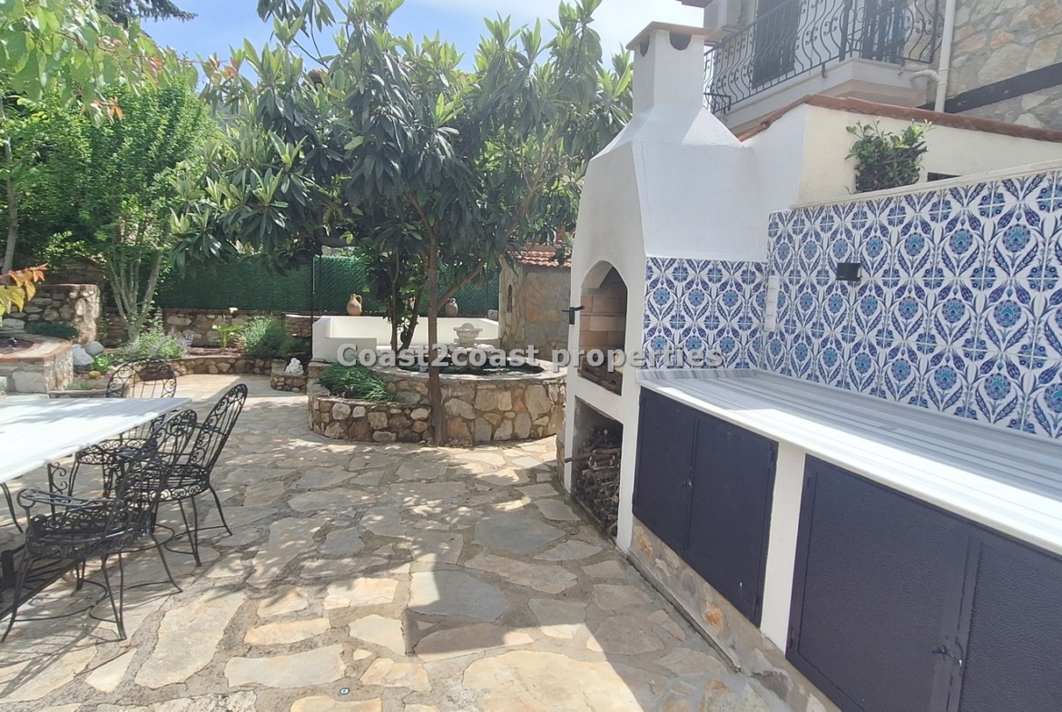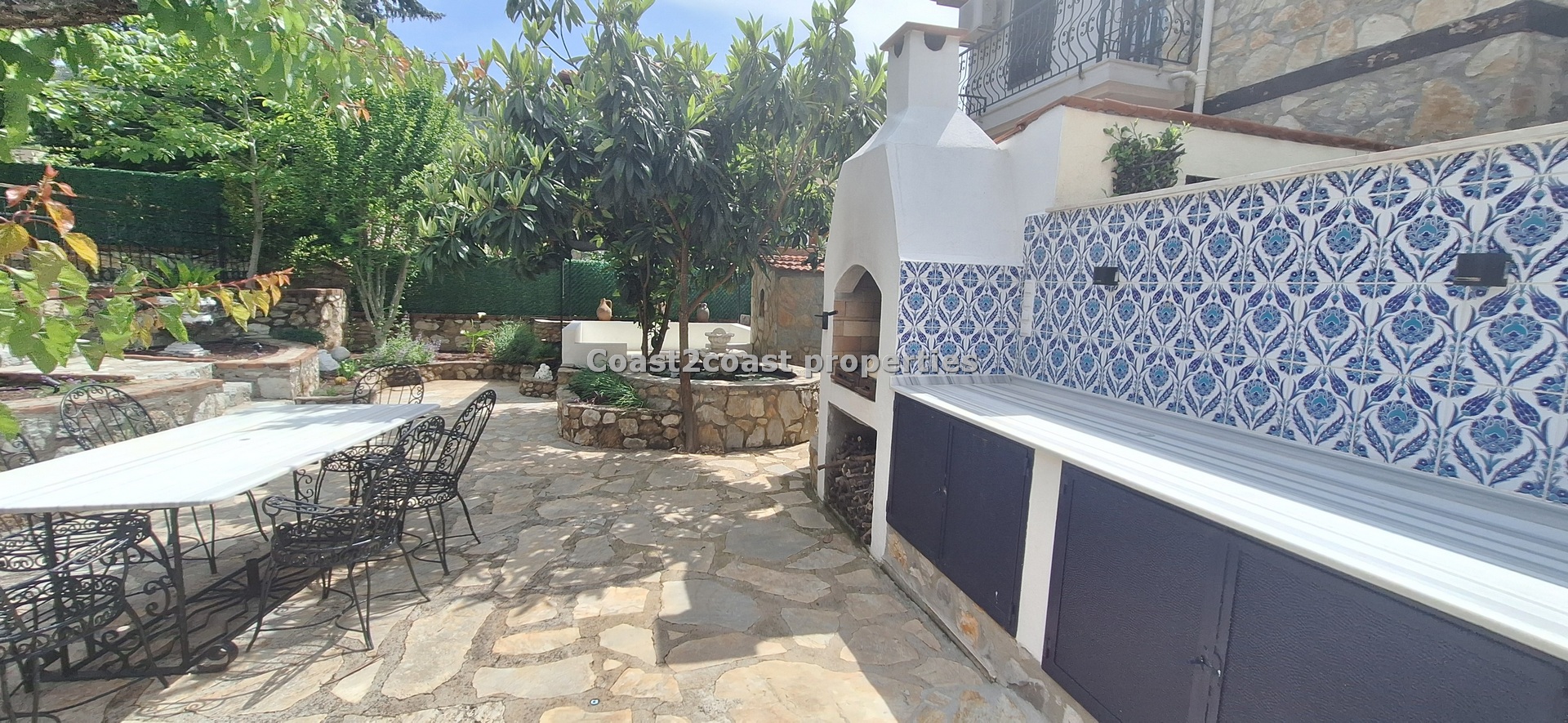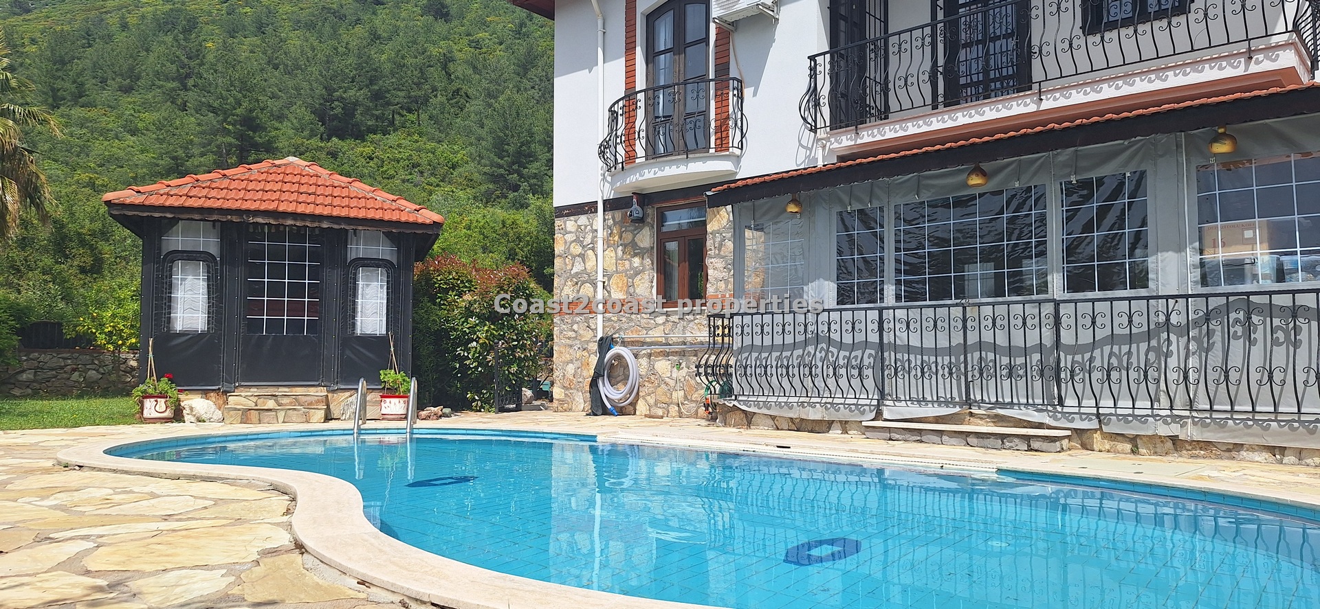 Stone walls that are fitting to the surroundings. The gardens have many different parts to explore. We have of course the poolside which has a kidney shaped pool and a great size for family fun. Around the pool area we have also a Turkish Kuş (covered seating area) which is a brilliant area to get out of the sun in the hot summer months to cools down. This can also be used in the winter months as it can close up also. Not only is it practical, but it looks fantastic.
