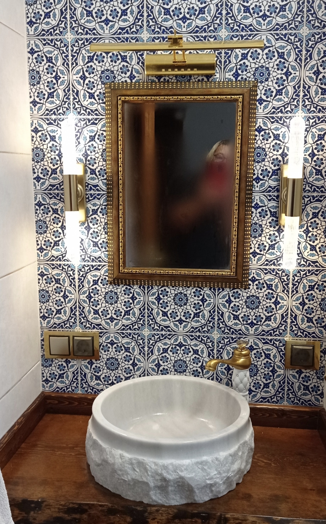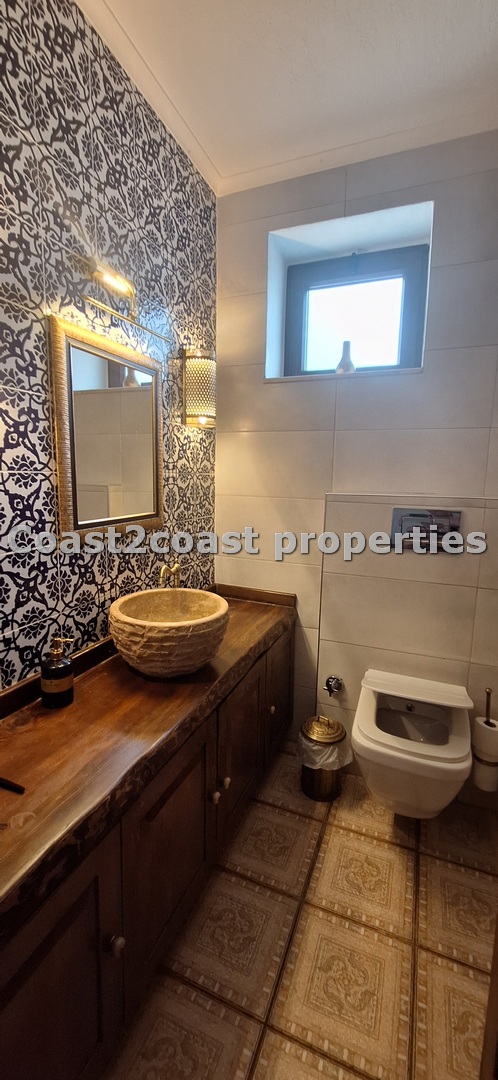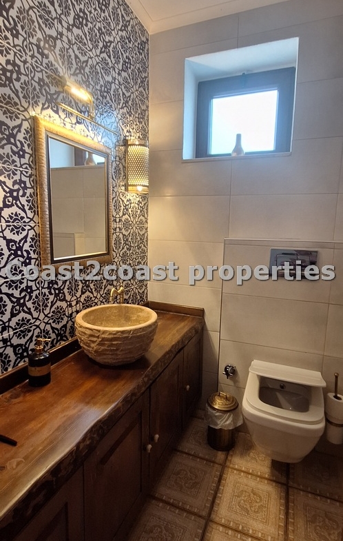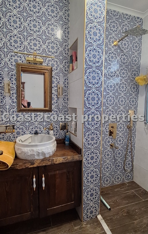 The main worktops are black marble throughout. All appliances will be left in the sale of the property. Oven, hob, extractor, dish washer, tall fridge freezer to name a few and all top quality. The wonderful thing about the ground level is we have a door from the kitchen to the stunning fountain and seating entertainment area plus another door from the dining area on to a large wrap around terrace that over looks the pool. This can be open in the summer and closed in the winter months. A real large extra seating area.  The ground floor has also a toilet that is quite beautiful with designer sink and utility unit.