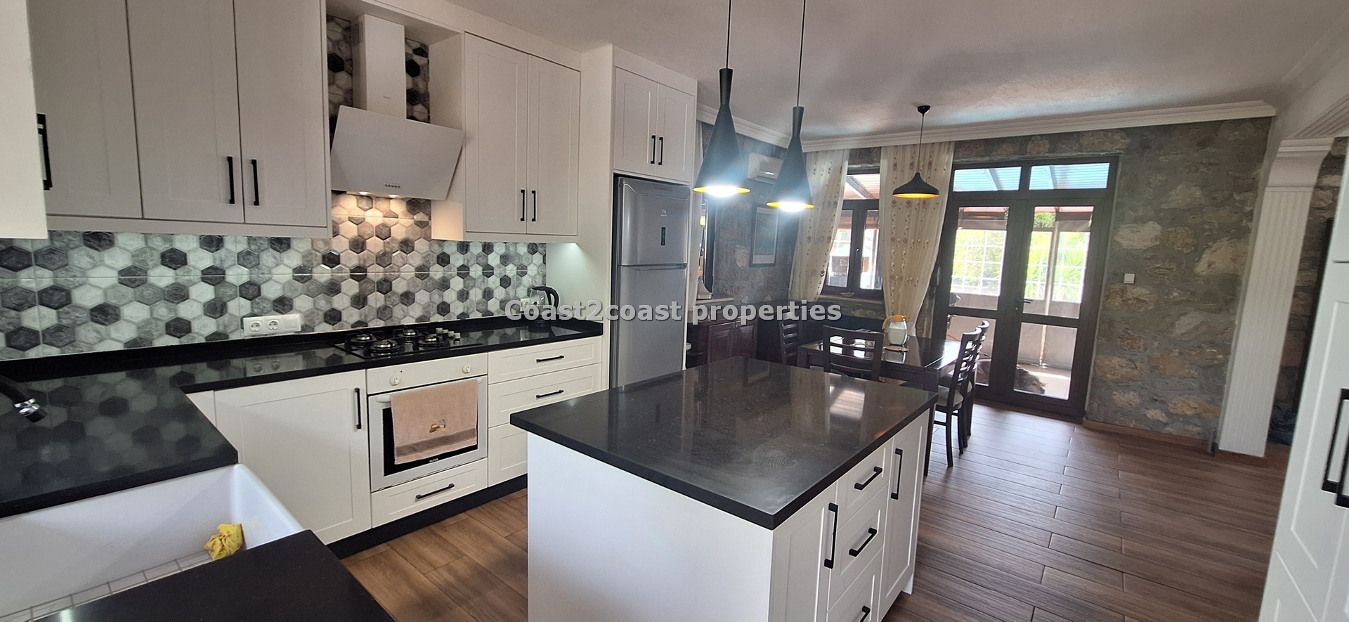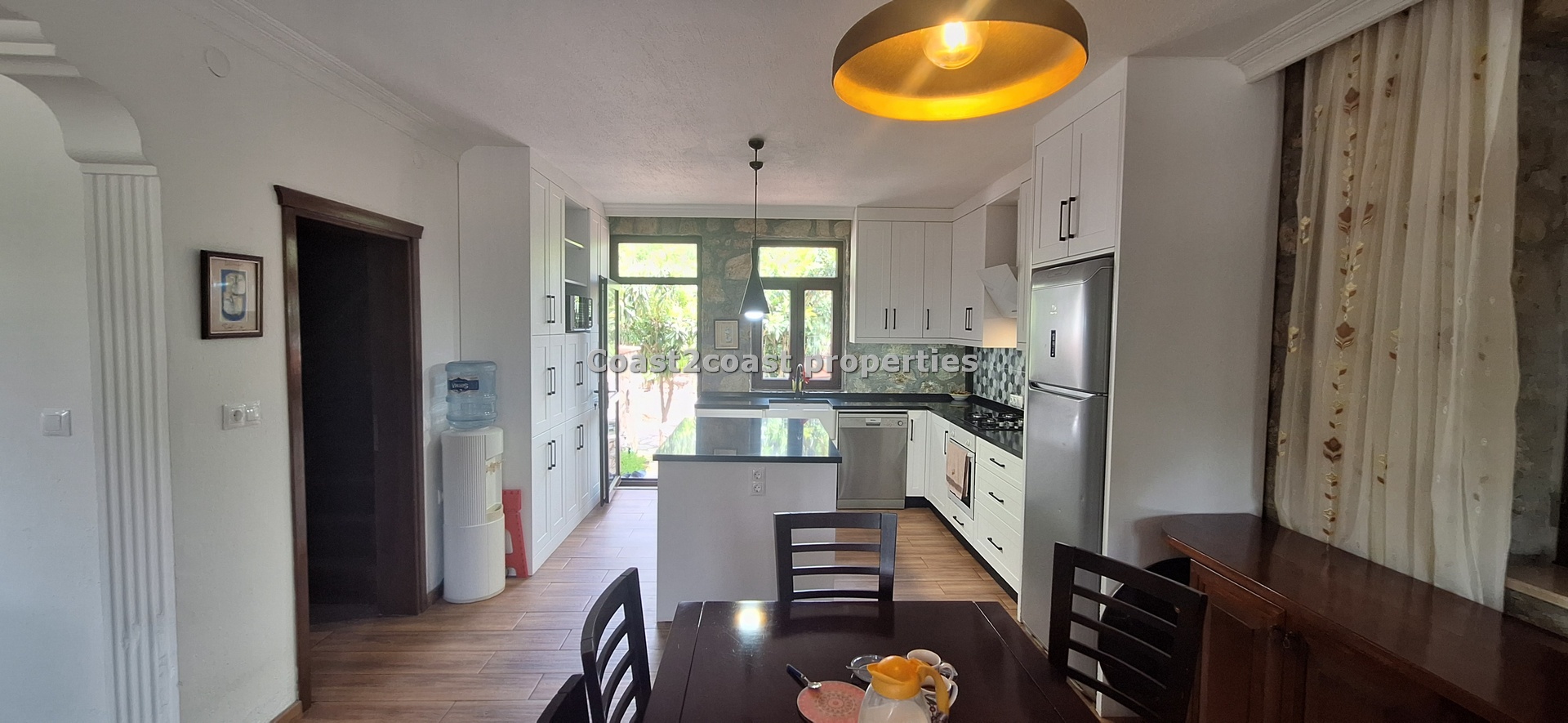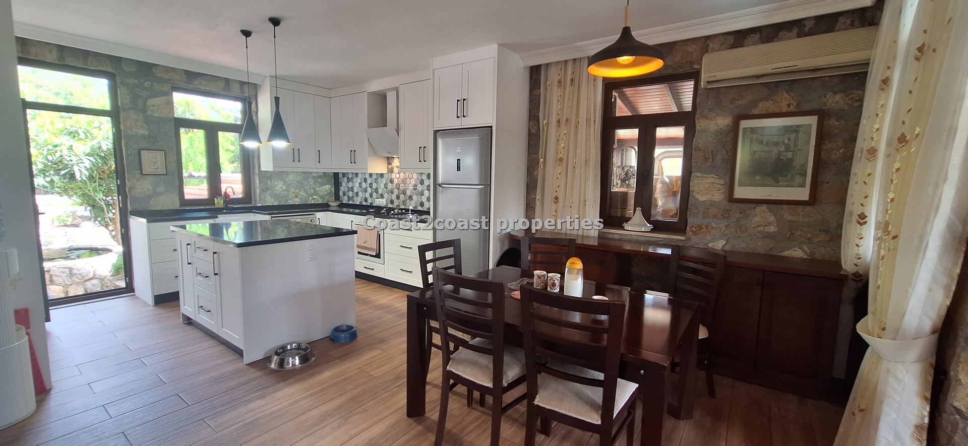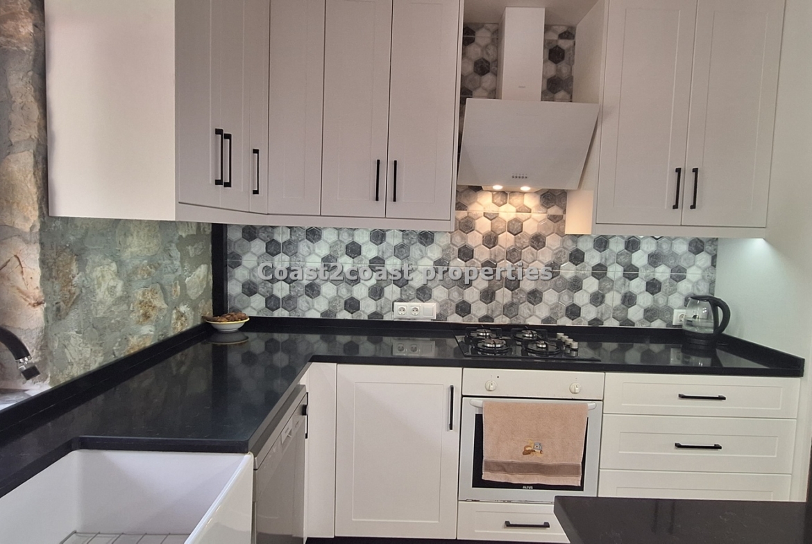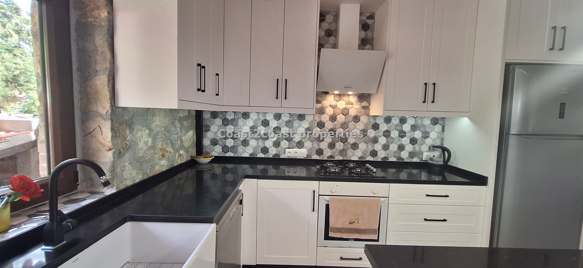 The villa is partially stone built with only 1 owner. The entrance has that real country house feel. The first thing that will catch your eye is the wonderful wooden staircase taking you to the upper floor. We pass this and enter into the lounge, kitchen and dining room areas. The lounge walls are stone keeping in fitting with the property. The floors look wooden throughout but are actually wood effect ceramic. The whole ground floor has had a full modern renovation. We have adjacent to the lounge a large dining area with table and chairs plus a large dressing table. Again the interior walls are real stone. The dining area and kitchen are really beautiful.