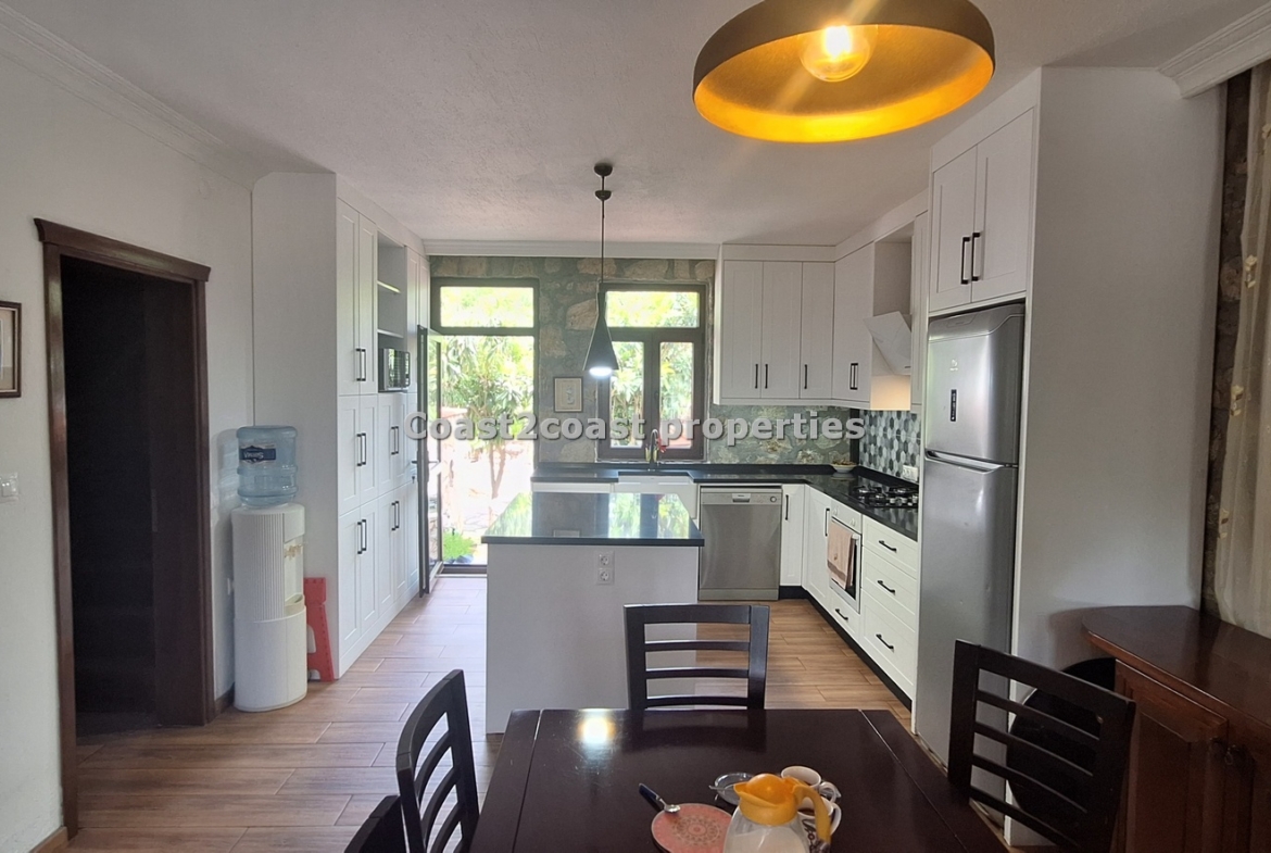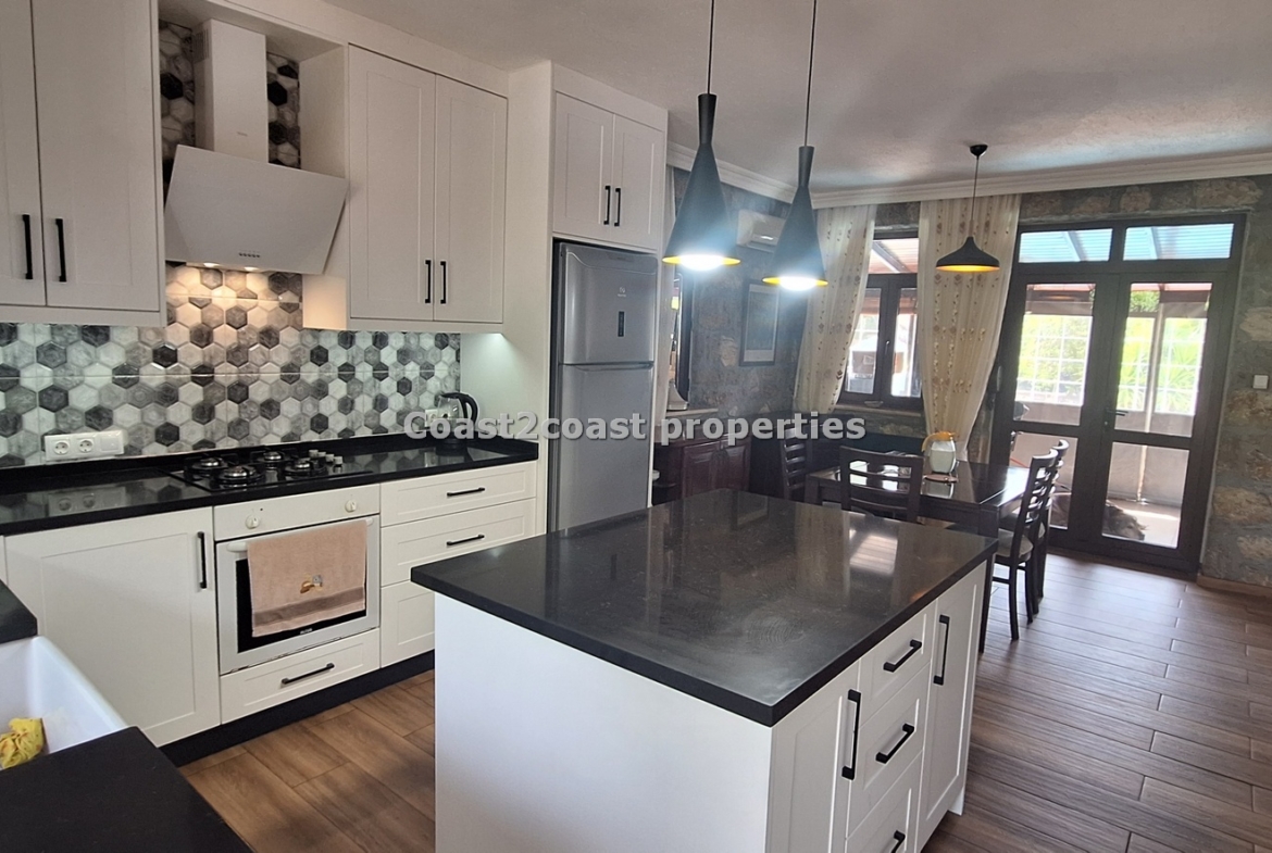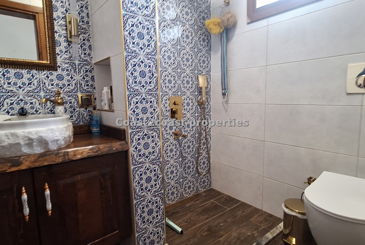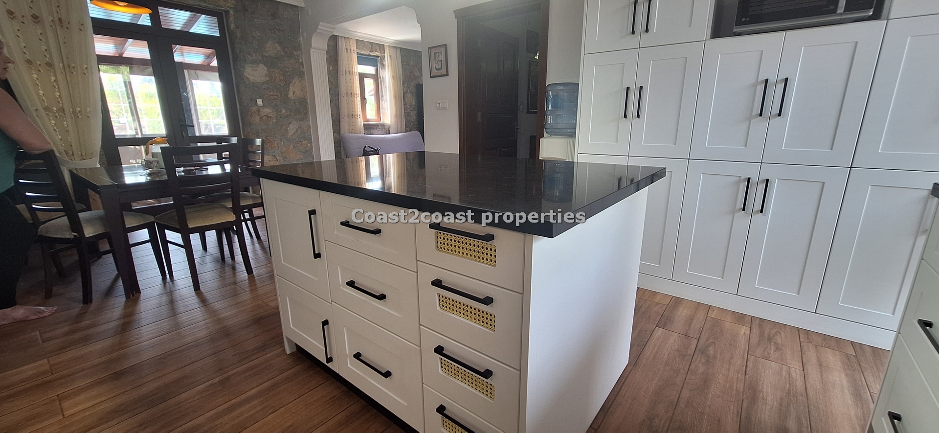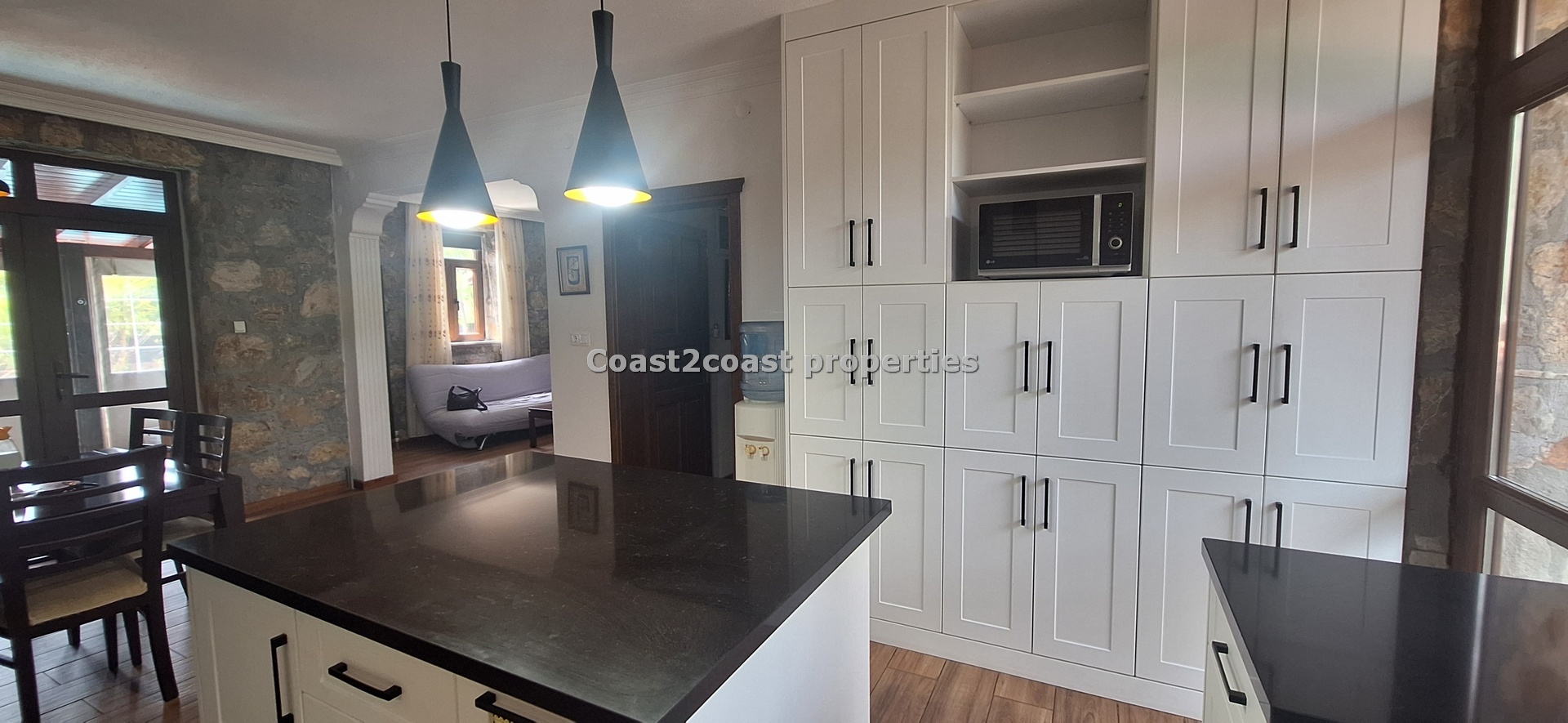 The villa is partially stone built with only 1 owner. The entrance has that real country house feel. The first thing that will catch your eye is the wonderful wooden staircase taking you to the upper floor. We pass this and enter into the lounge, kitchen and dining room areas. The lounge walls are stone keeping in fitting with the property. The floors look wooden throughout but are actually wood effect ceramic. The whole ground floor has had a full modern renovation. We have adjacent to the lounge a large dining area with table and chairs plus a large dressing table. Again the interior walls are real stone. The dining area and kitchen are really beautiful.