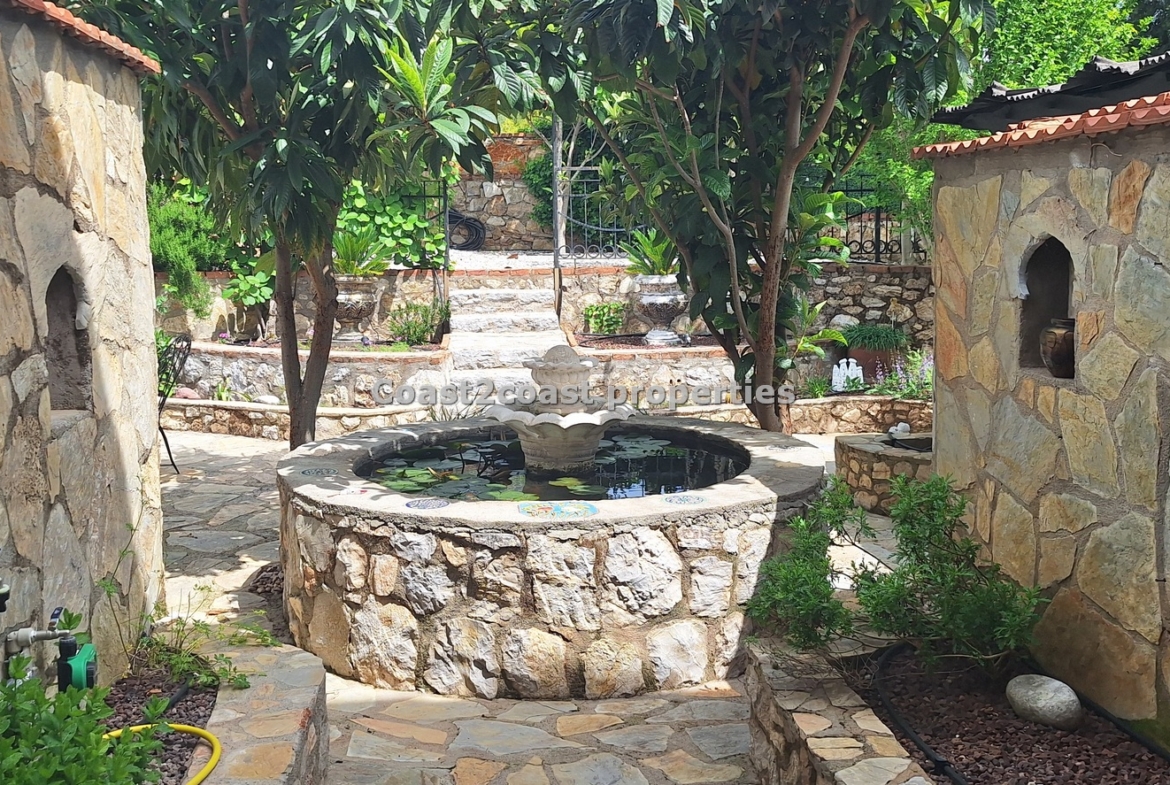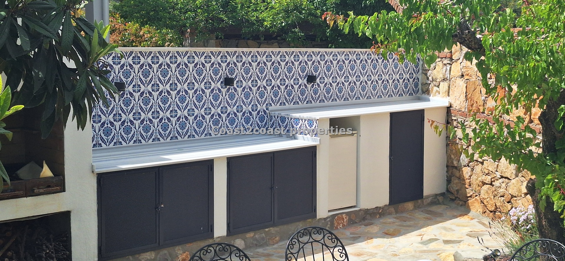 We have a few good size garden sheds but behind them we have the entertainment garden i would call it. If you have guests i am sure they would love to spend a lot of time here. There is a large working fountain taking center stage. Adjacent to this there is a lovely built in seating area with cushions and table . The other end we have again a very unusual open kitchen area purpose built to entertain. Built in BBQ, marble worktops, storage, fridge etc. Again not only looking great but practical. The gardens go on but what we can say you will fall in love with every part of the outside area as there has been so much attention to detail given everywhere.
