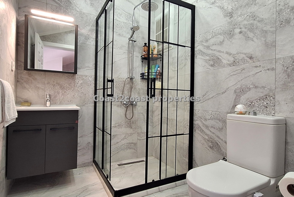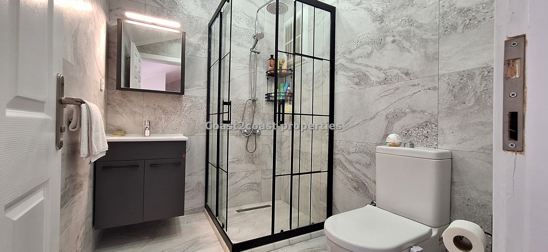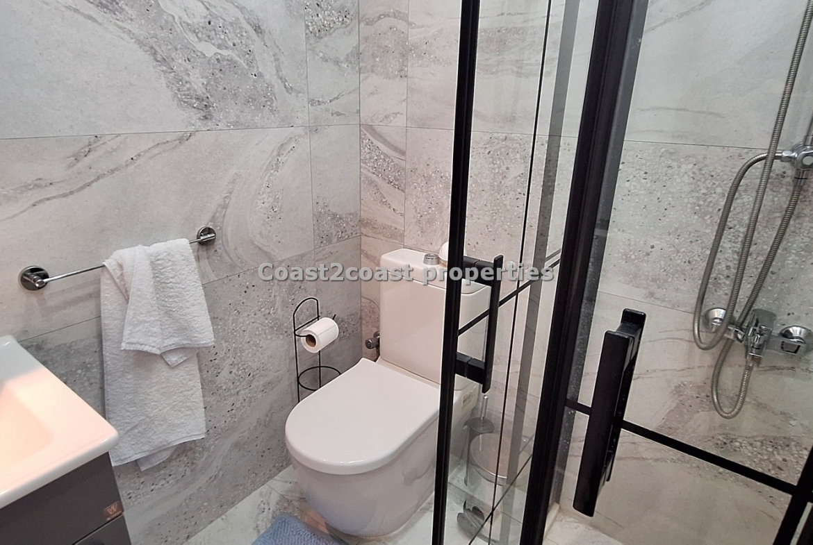 Adjacent to the this area and on the same level we have 2 double bedrooms and a shared shower room. There is one large bedroom to the front with it’s own access to the same large terrace area as the lounge. This room is very spacious with twin beds, fitted wardrobes and chest of drawers. The other bedroom , again has twin beds and fitted wardrobes and a dressing table. There is also a sunny balcony off this bedroom.