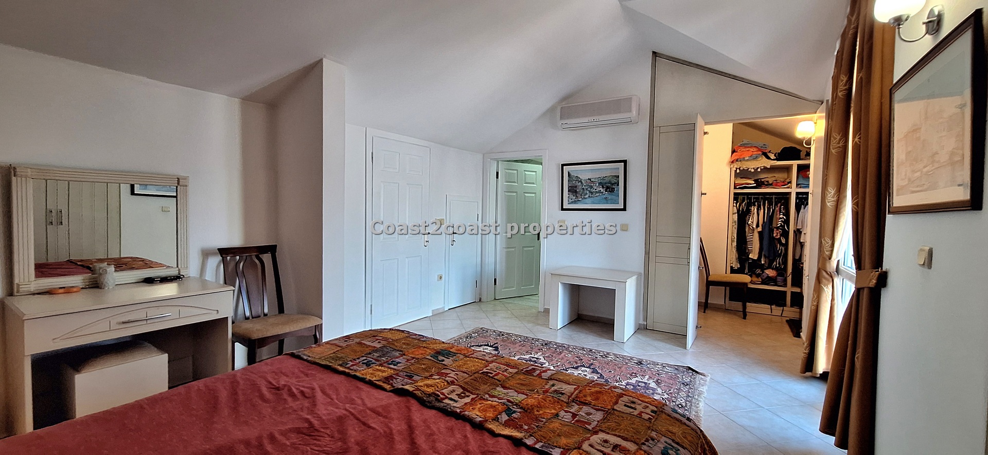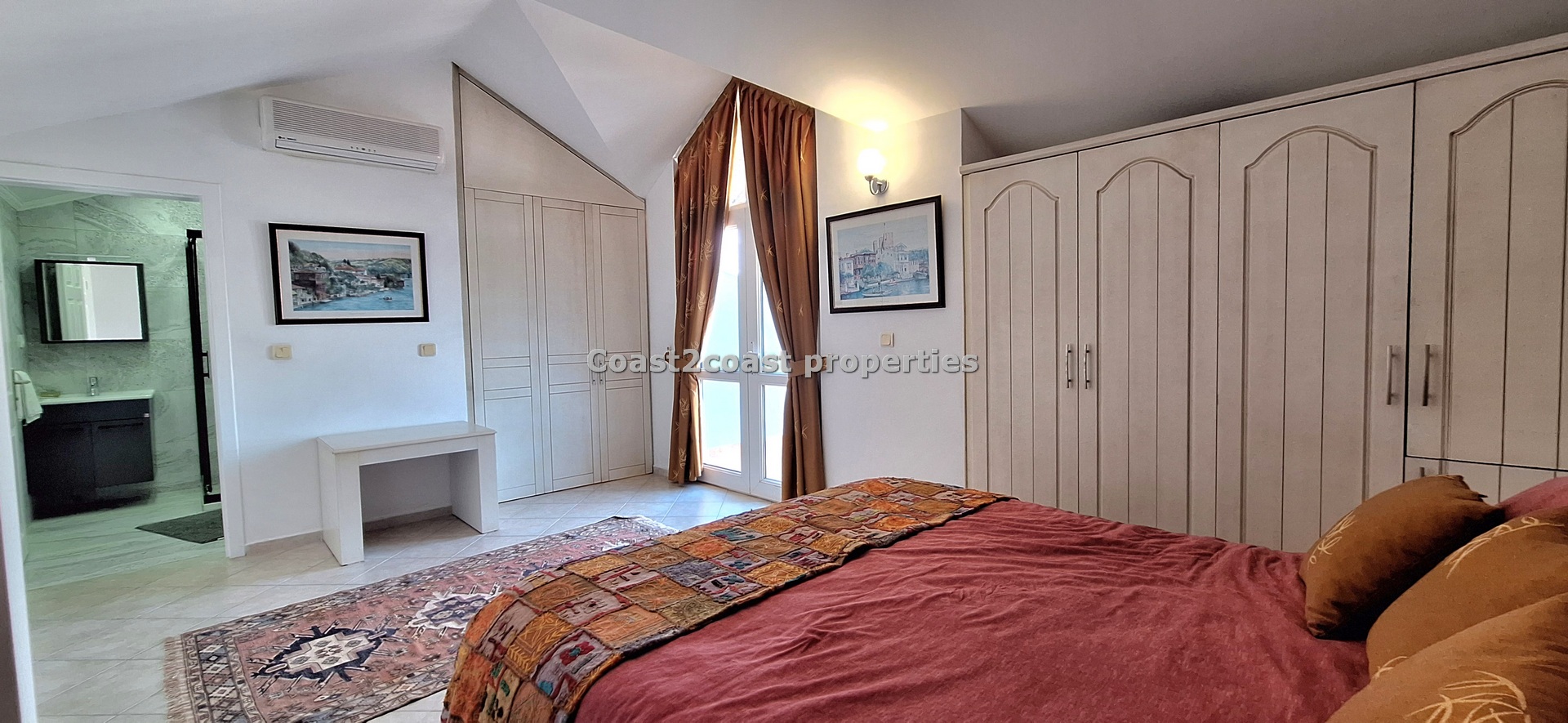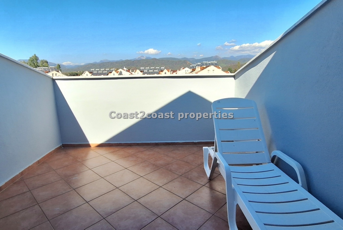 Properties for sale in Fethiye and Calis can have small spaces on the top floors, but not the Summer apartment. It is incredibly spacious. The walk around room is just perfect. So we have an open bedroom with large fitted wardrobes. Furnishings as stated are inclusive of the sale. It truly is a Turn key property. This is of course the master bedroom and has an en suite shower room. Let’s get to that in a moment. Firstly we have a roof terrace that is secluded . Ideal for that summer sunbathe with privacy! The views from here over the mountains are fantastic!