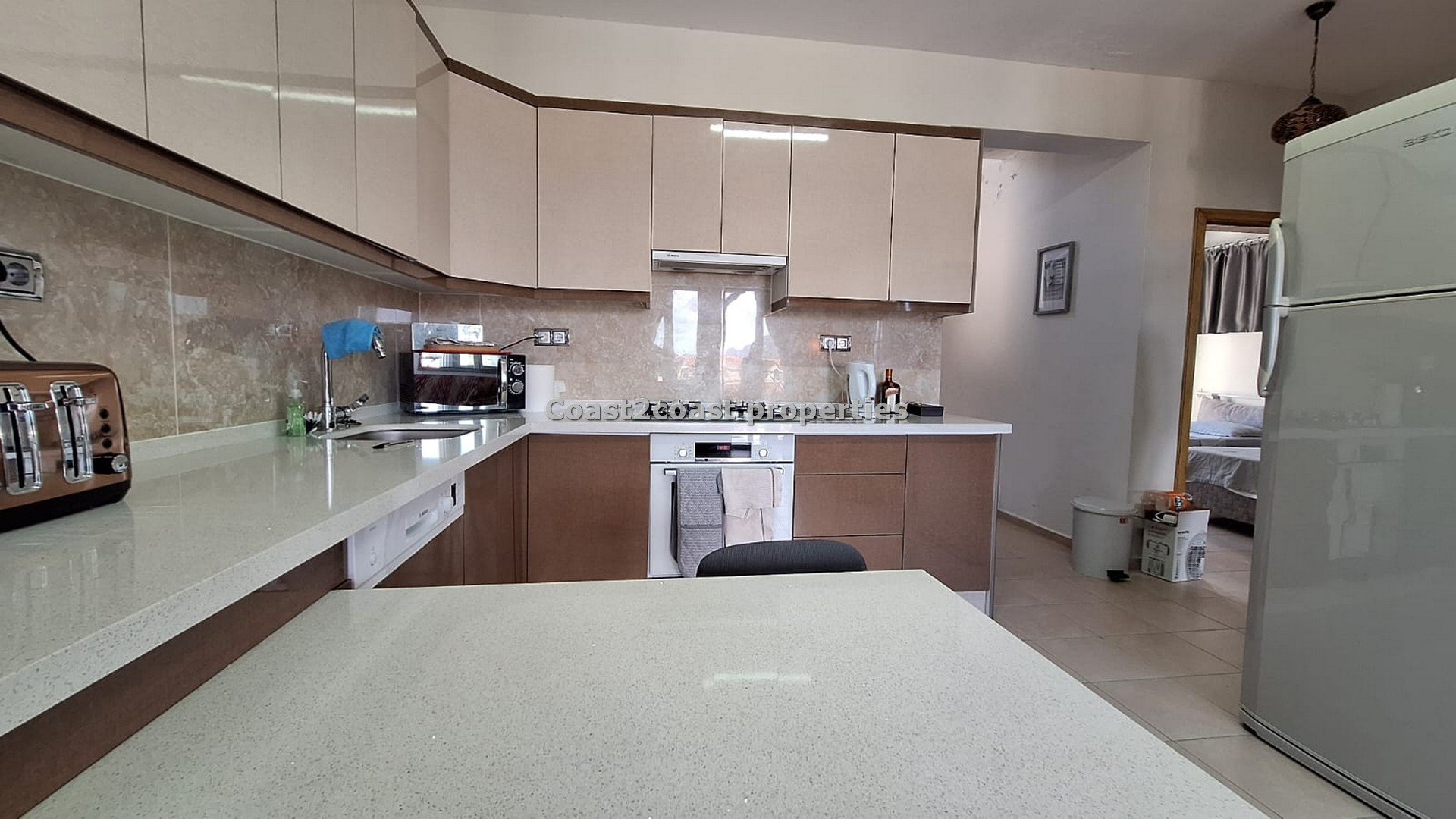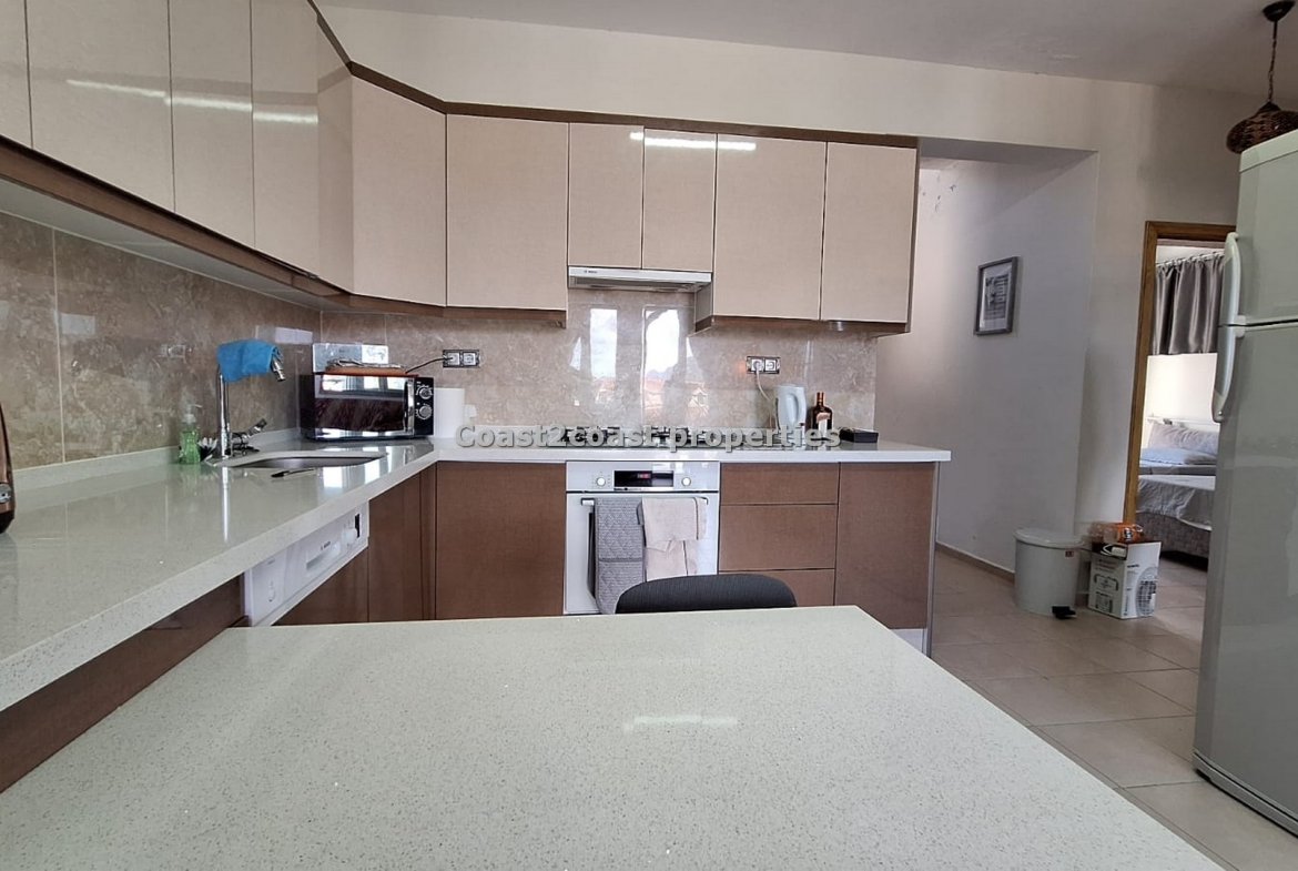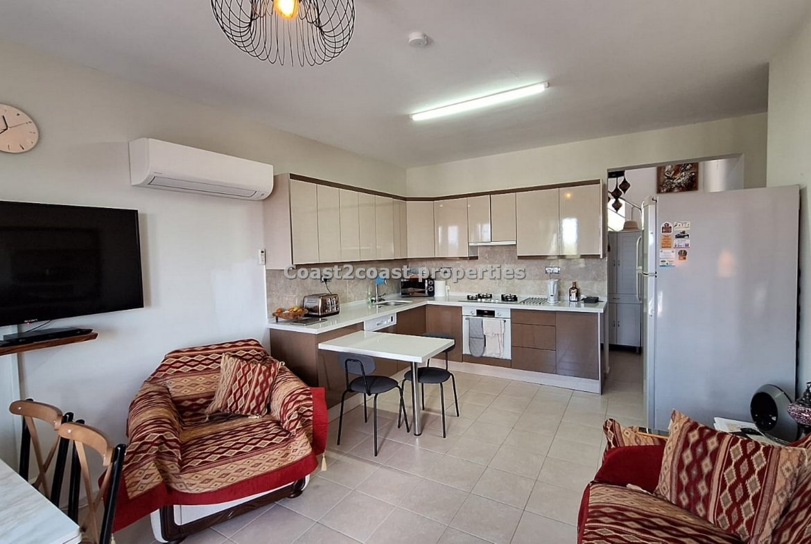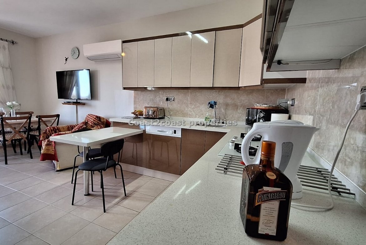 The lounge and kitchen are open plan. As stated before all fully furnished. The lounge has double doors that lead to a balcony which is shared also with a bedroom that overlooks the pool and garden areas. Great views.