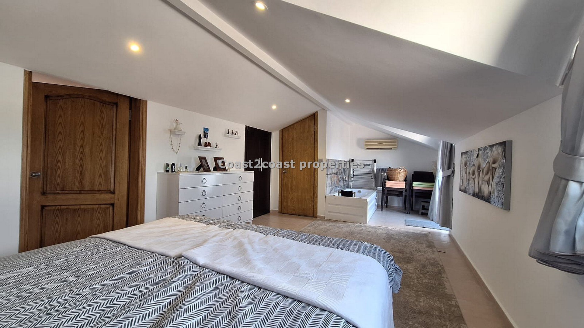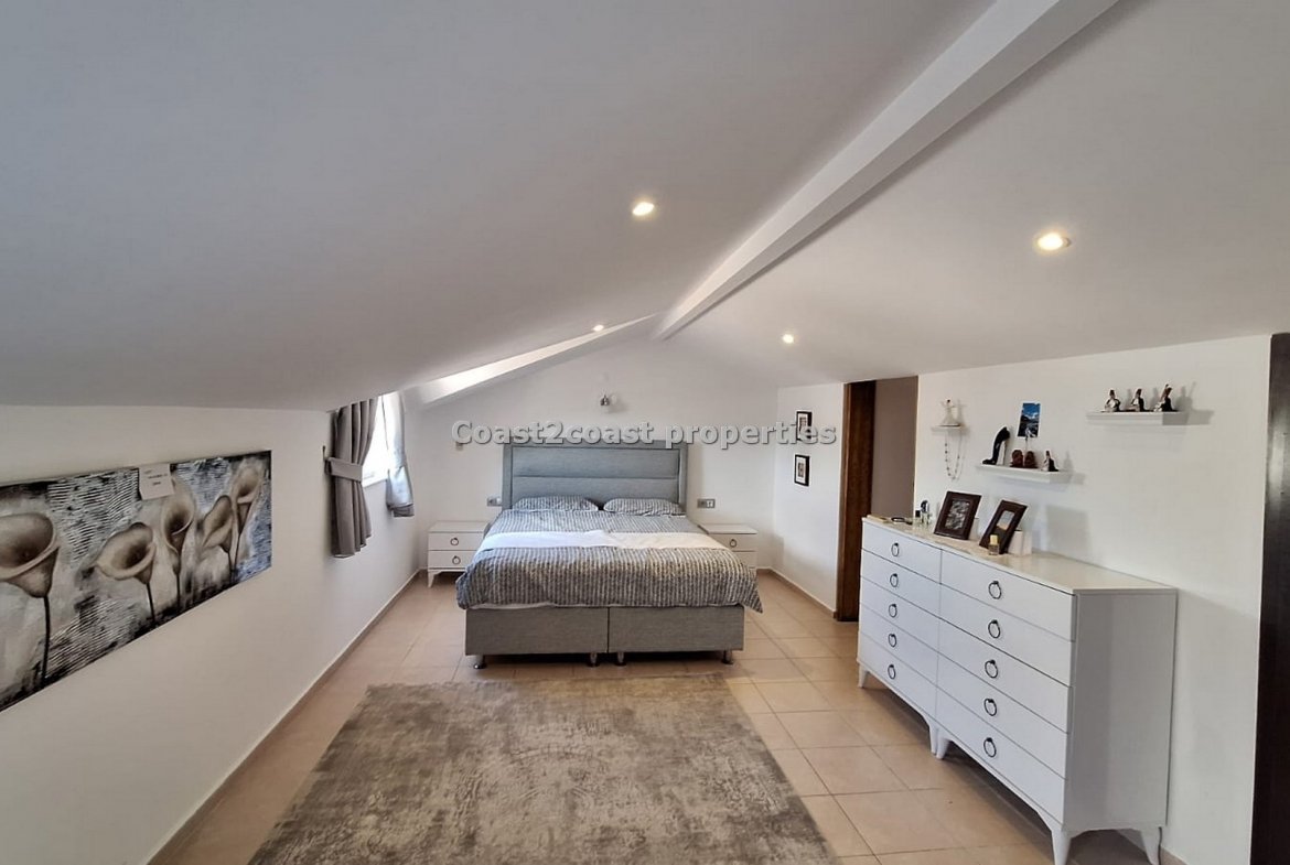 The property is on two floors with the lounge, 2 double bedrooms and a shared shower room on one level and the upper level is a large en suite bedroom with a roof terrace with the WOW factor!