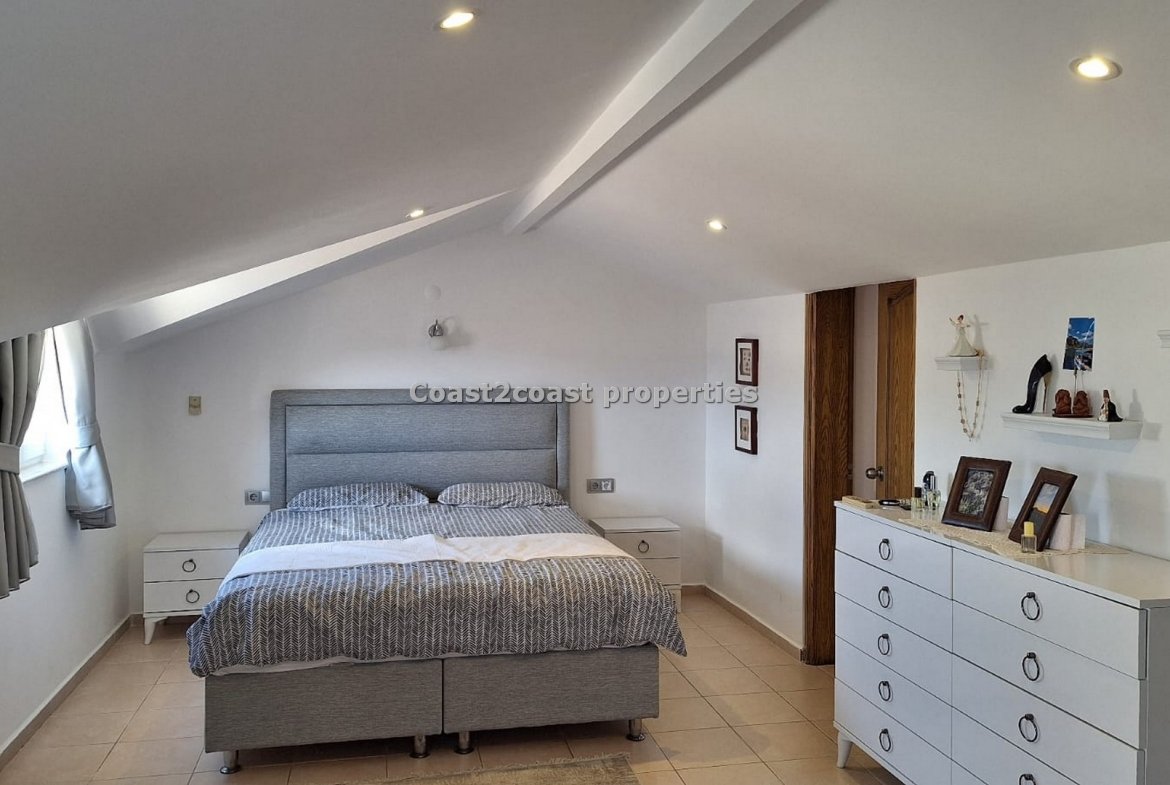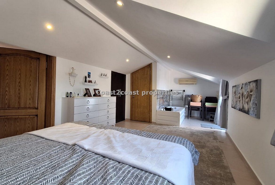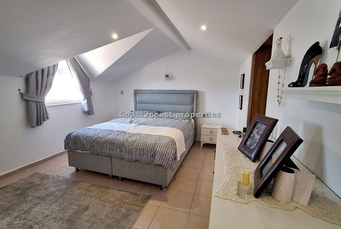 The winding stairs take us to what is a wonderful part of this property in Turkey. A huge bedroom coming furnished again, it’s open bath, en suite shower room and a roof terrace.