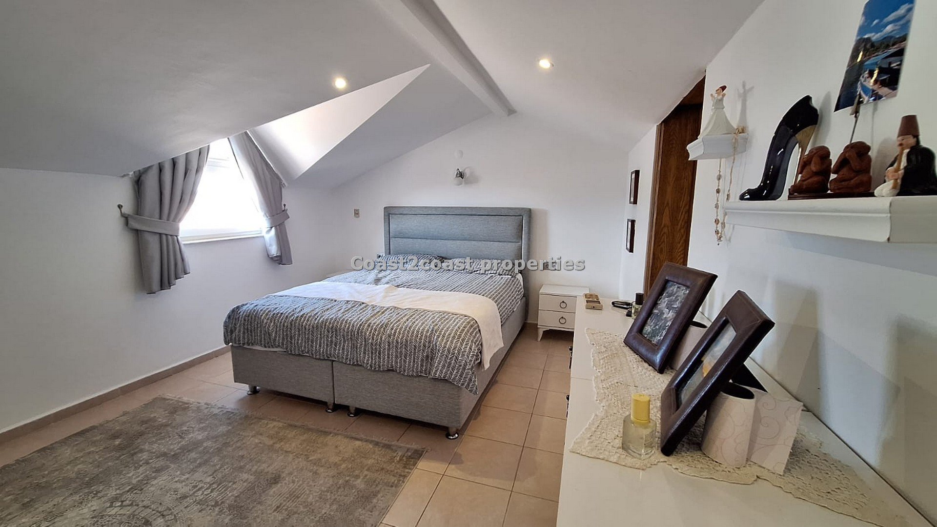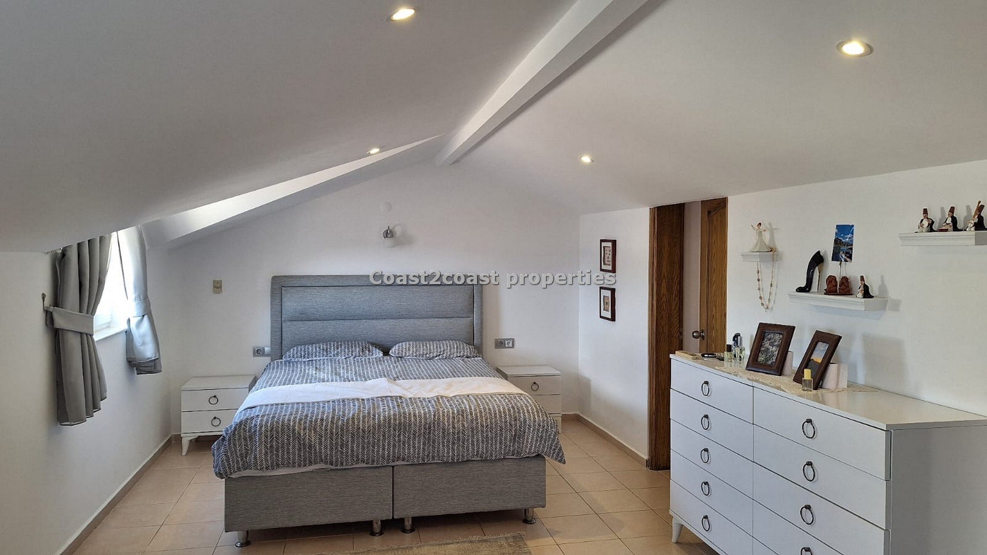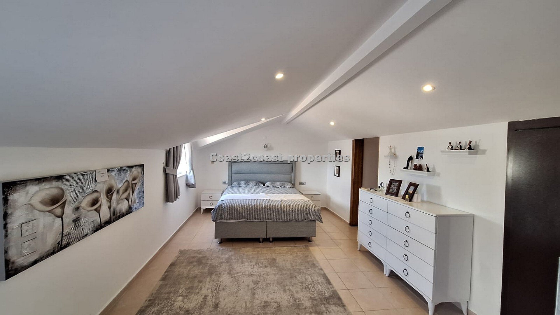 The winding stairs take us to what is a wonderful part of this property in Turkey. A huge bedroom coming furnished again, it’s open bath, en suite shower room and a roof terrace.
