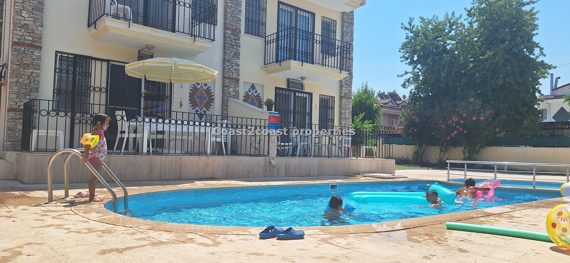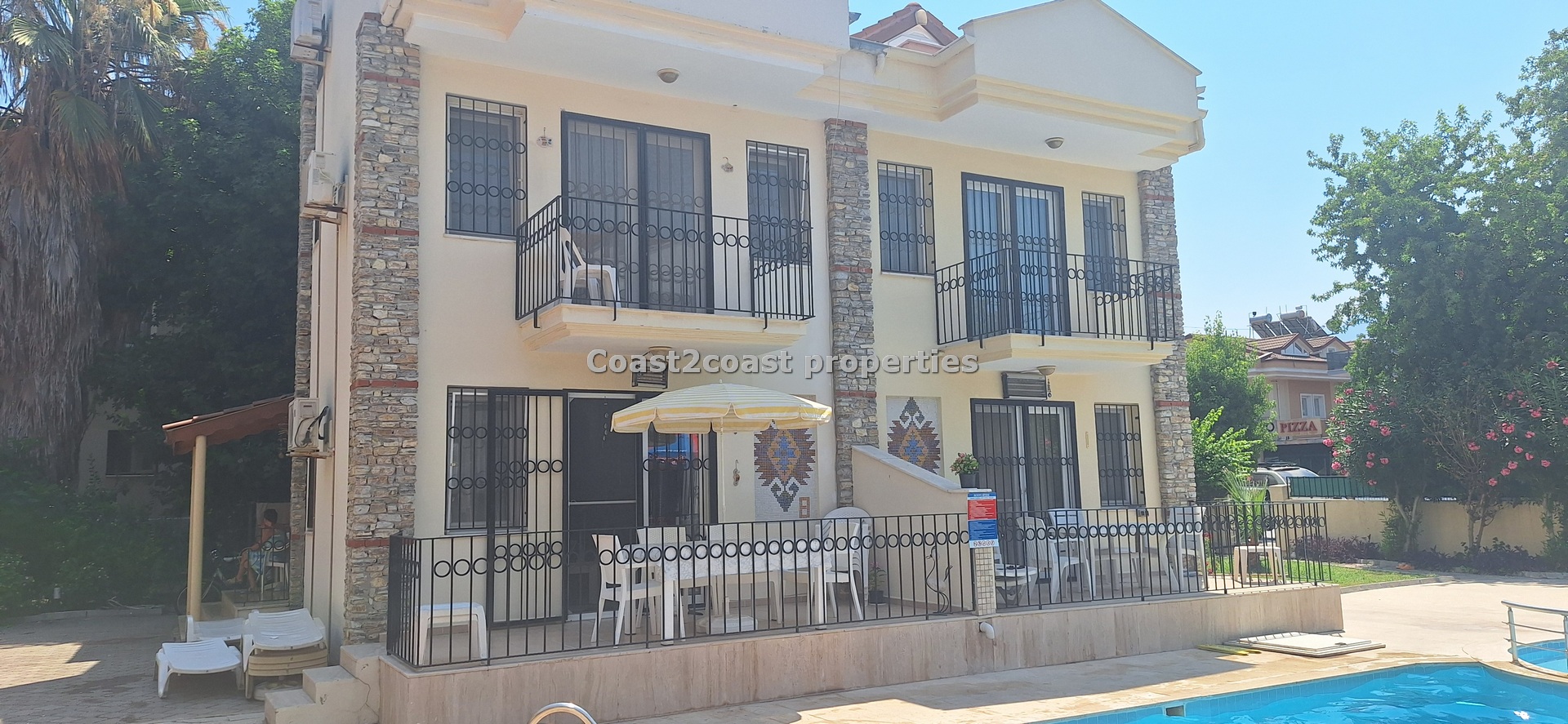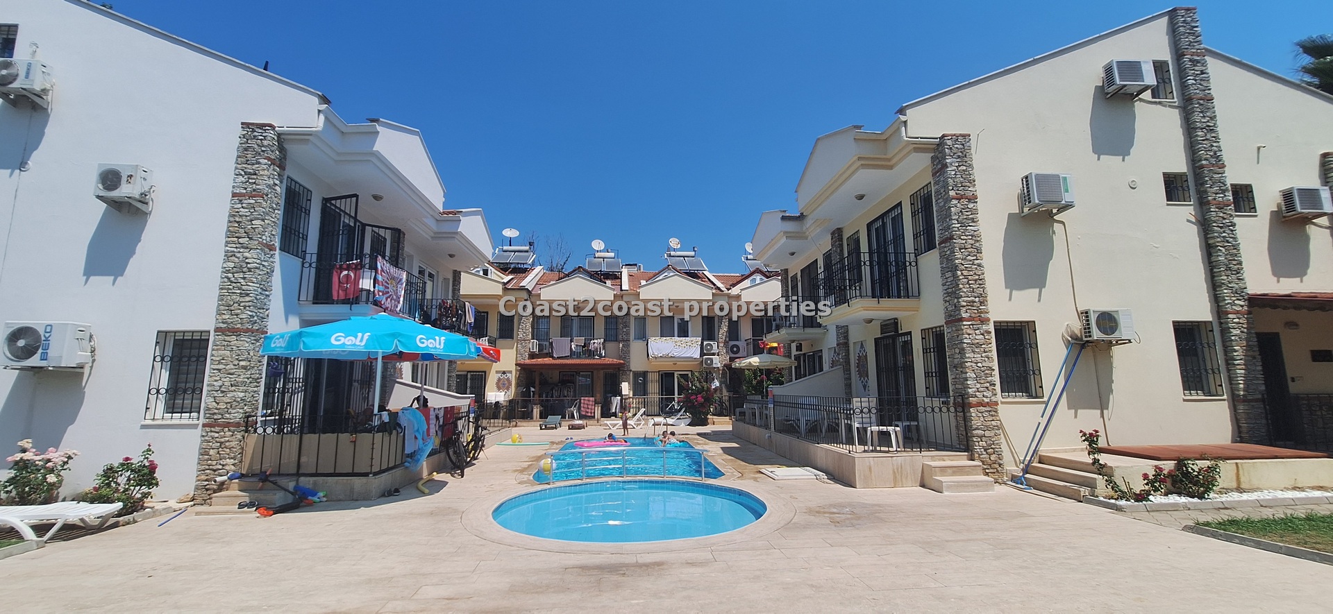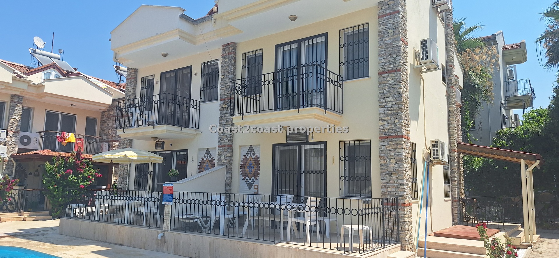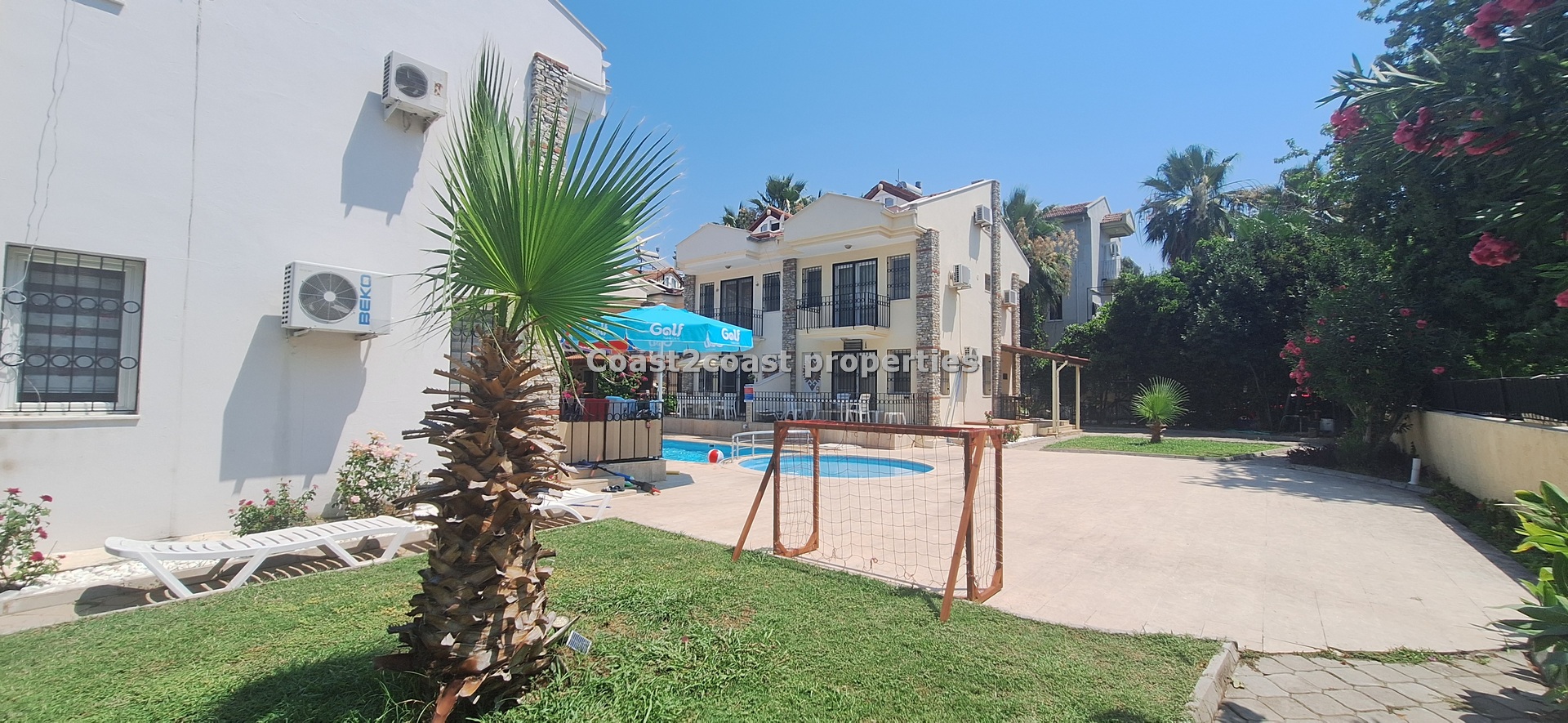 The villa as stated is in one of the main locations in this area. It is in the heart of everything! The main beach is Calis beach 8 minutes walk. Calis has so many bars and restaurants now you are spoilt for choice. Fethiye which is not far on the local bus service is a must to visit also. It has a great promenade which you can also walk to from Calis. It is quite outstanding scenery on the way. There is also a cycle lane that takes you from this resort to Fethiye taking you through beautiful parks and sea views all the way. Calis has an aquapark, Promenade, open market area, Tennis courts, beach and all walking distance from this villa for sale in Turkey.