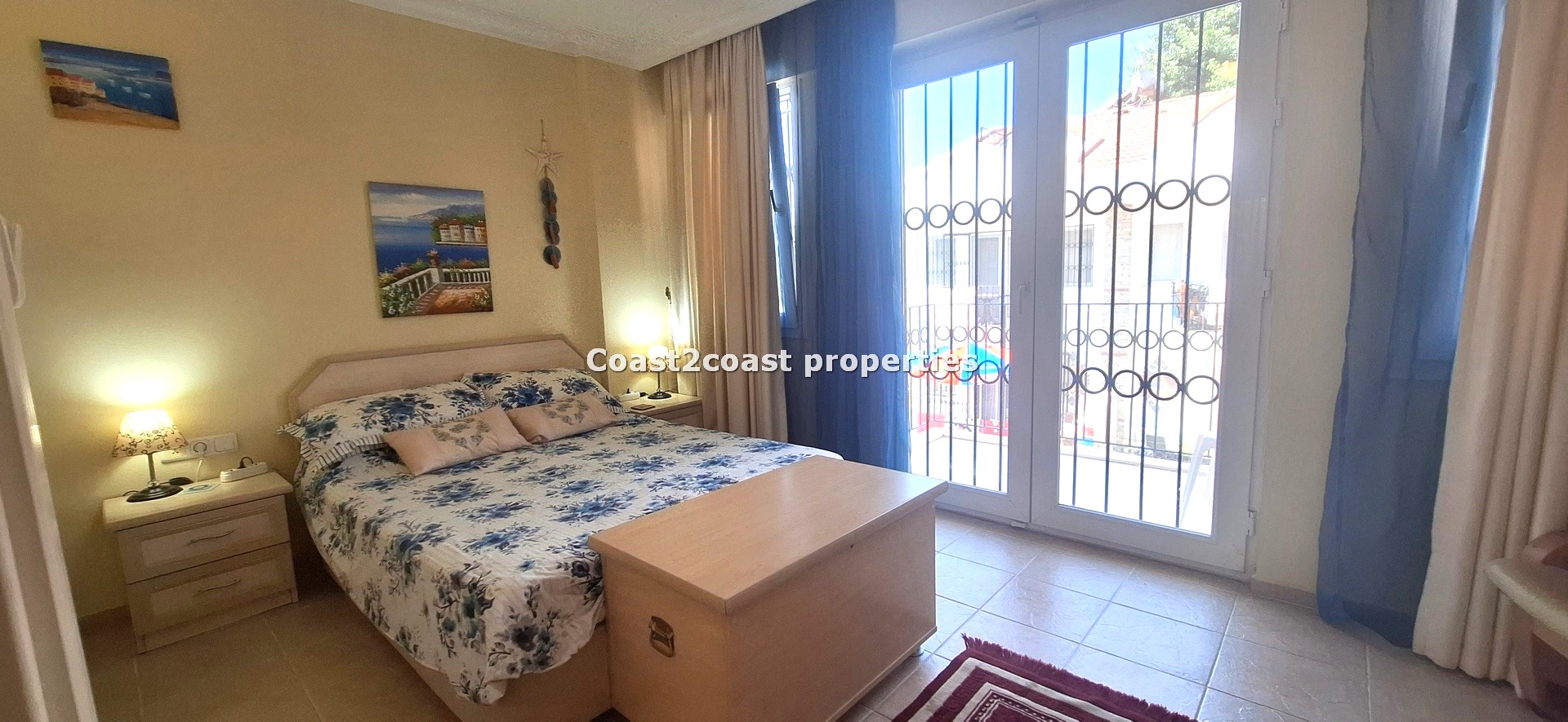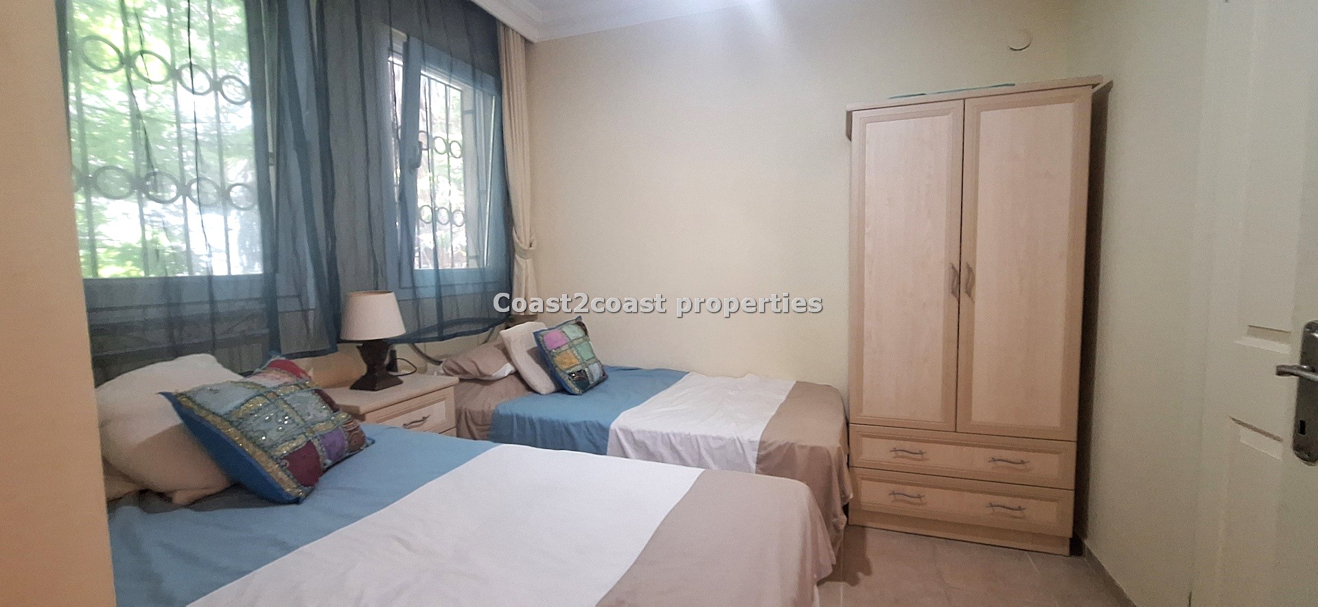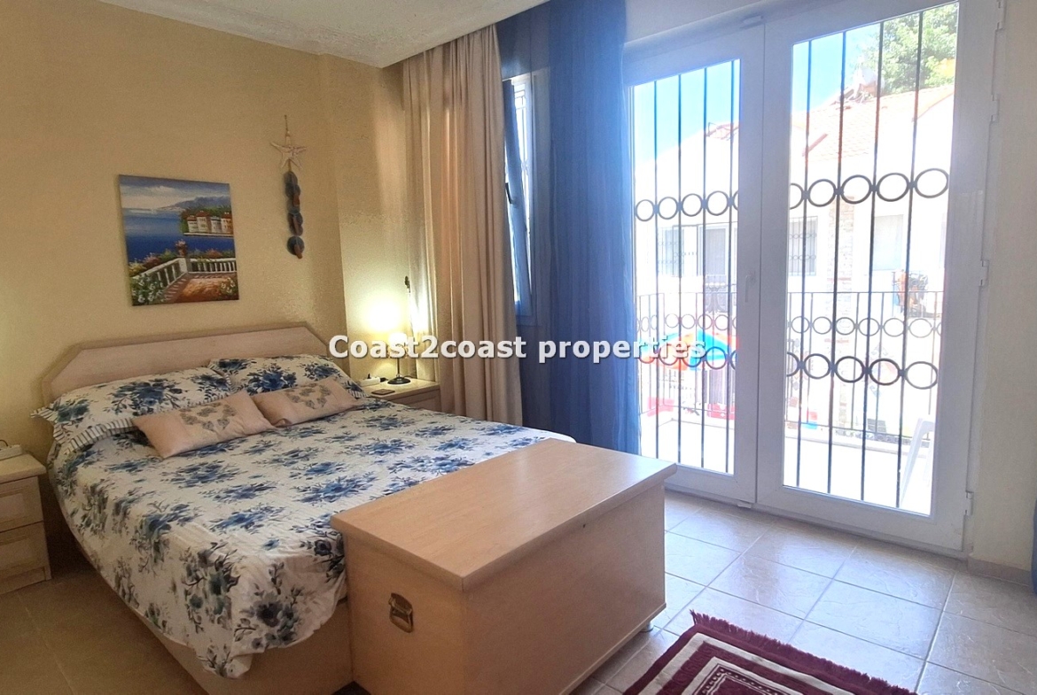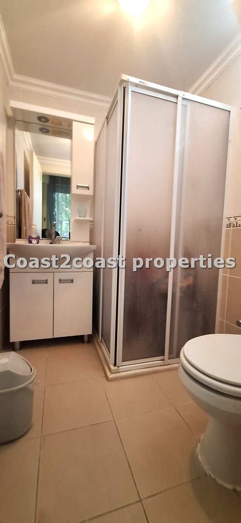 Bedroom two is a larger room with double doors to a good size balcony that again faces the pool and garden areas. This balcony gets the sun till evening time. A large room with furnishings again included. Of course this is also en suite. This shower room has sliding glass doors and is double sized. Again another vanity unit with storage , lighting and mirror. This room is tiled floor to ceiling and very beautifully finished off.