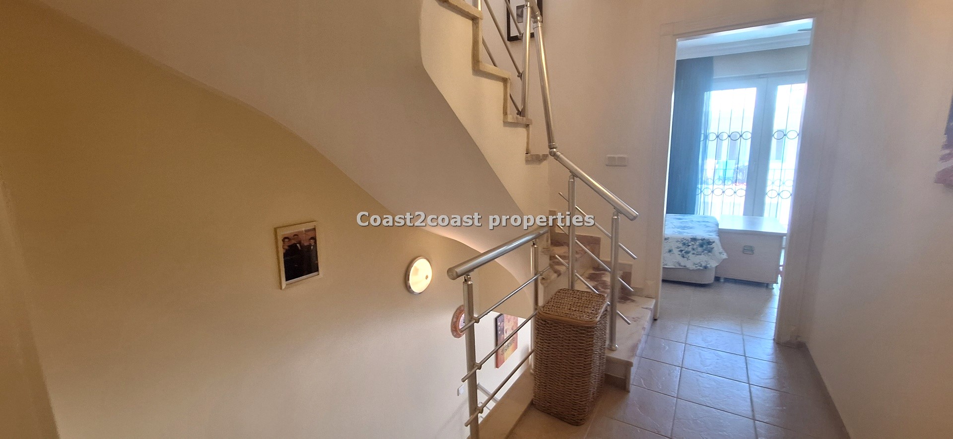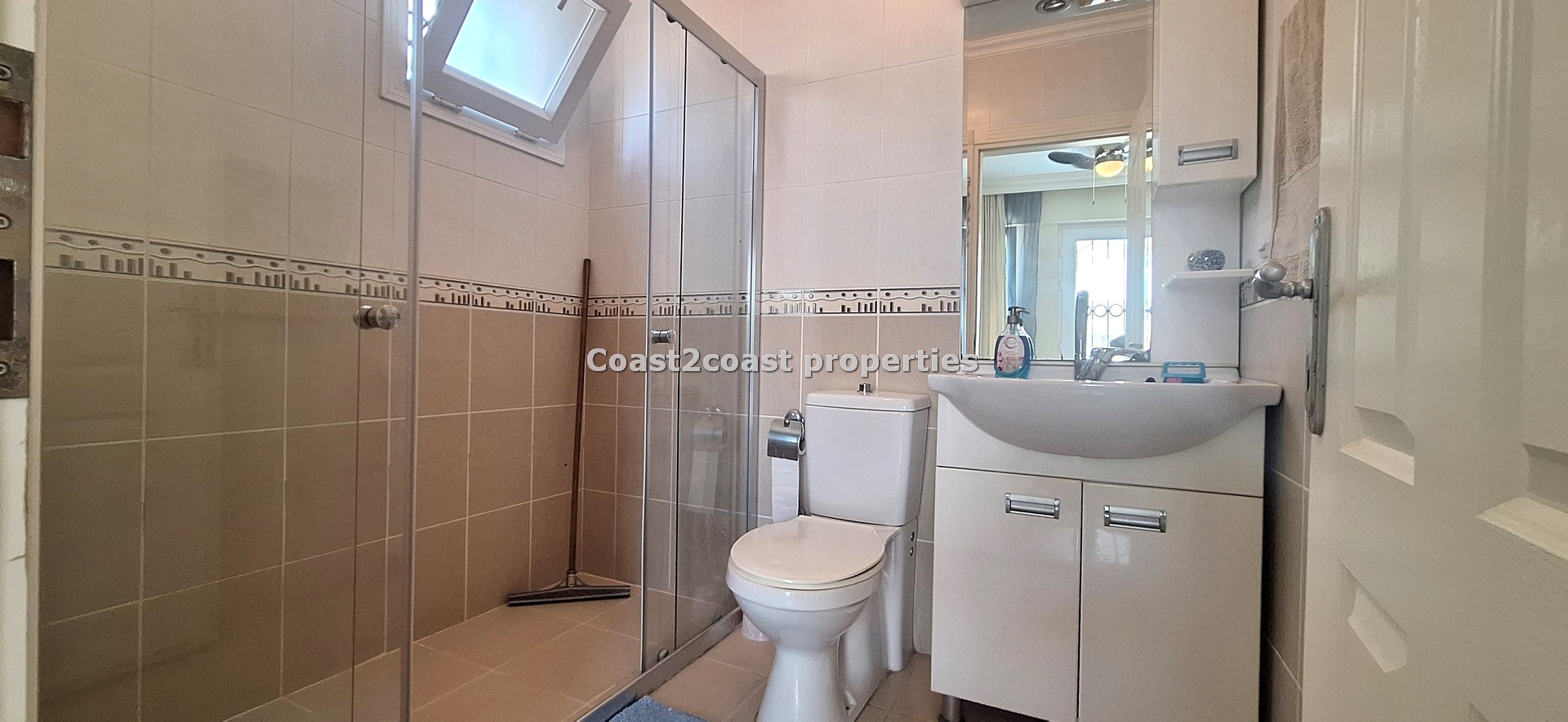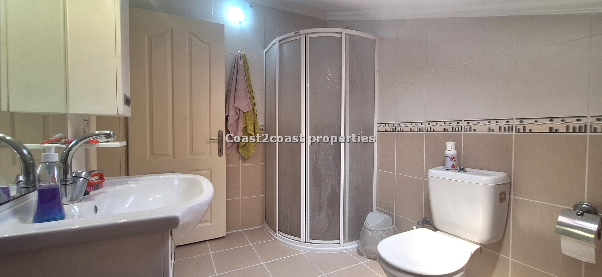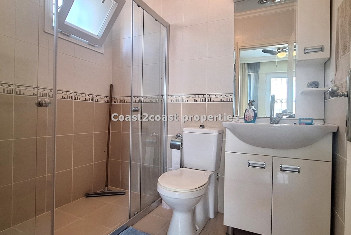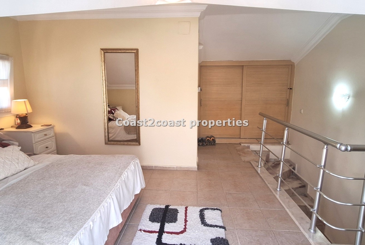 The marble staircase leads us to the next 2 levels. The first upper level comprises of 2 double bedrooms which are both en suite and having their own balconies. Bedroom one has a balcony to the back of the property offering great shade in the summer months. Again wardrobes, cabinets and beds are all inclusive of the sale! The en suite here has a shower cubicle, Wc and vanity unit. The vanity unit has storage and is very nice with sink, mirror and lighting. The floors and walls are all ceramic also.