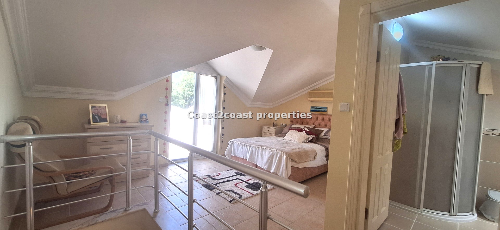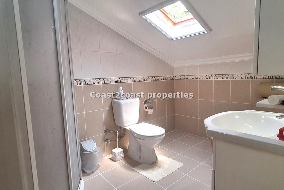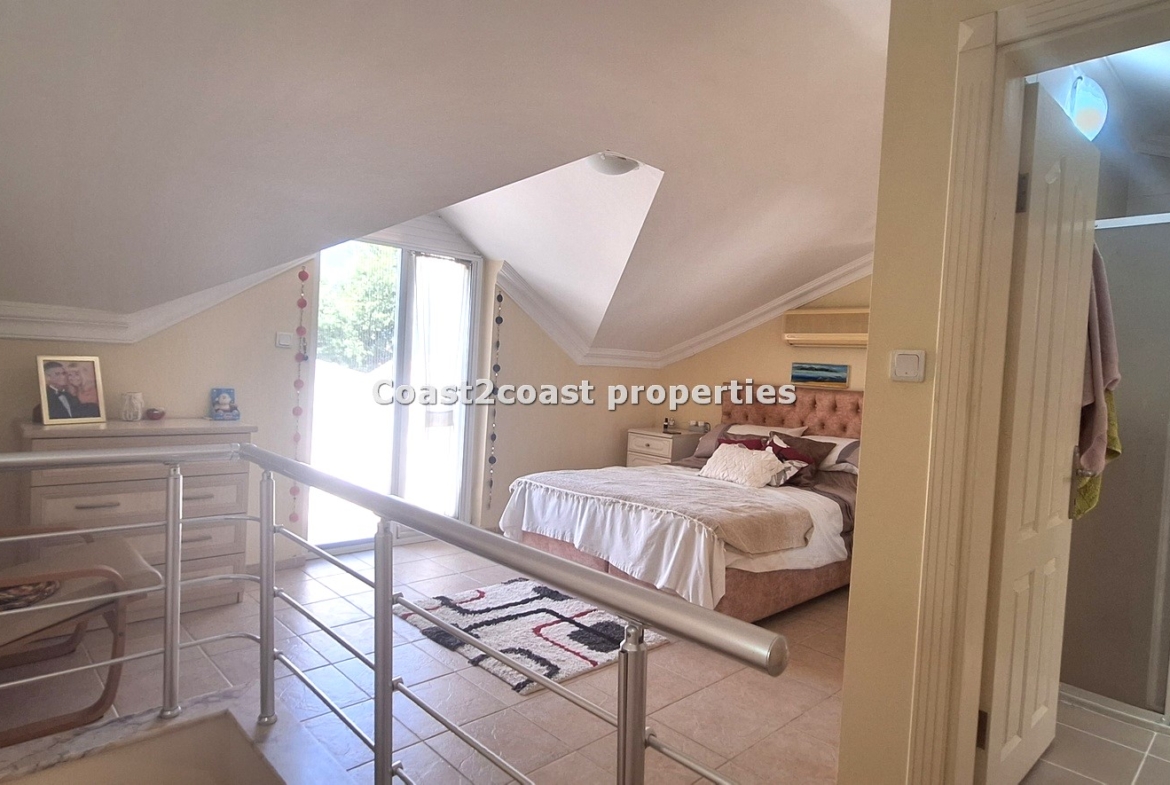 We then reach the top floor which is beautiful. A large open bedroom with a roof terrace! This is very private and walled off so ideal for sunbathing. The views over Calis are excellent from this terrace. Alternatively relax and watch the stunning sunsets Calis has to offer! Again we have big furnishings and plenty of storage all inclusive! The en suite is again a good size with a shower cubicle, vanity unit and tiled reflecting the other shower rooms. This villa for sale in Turkey is very deceiving and offers great space within!