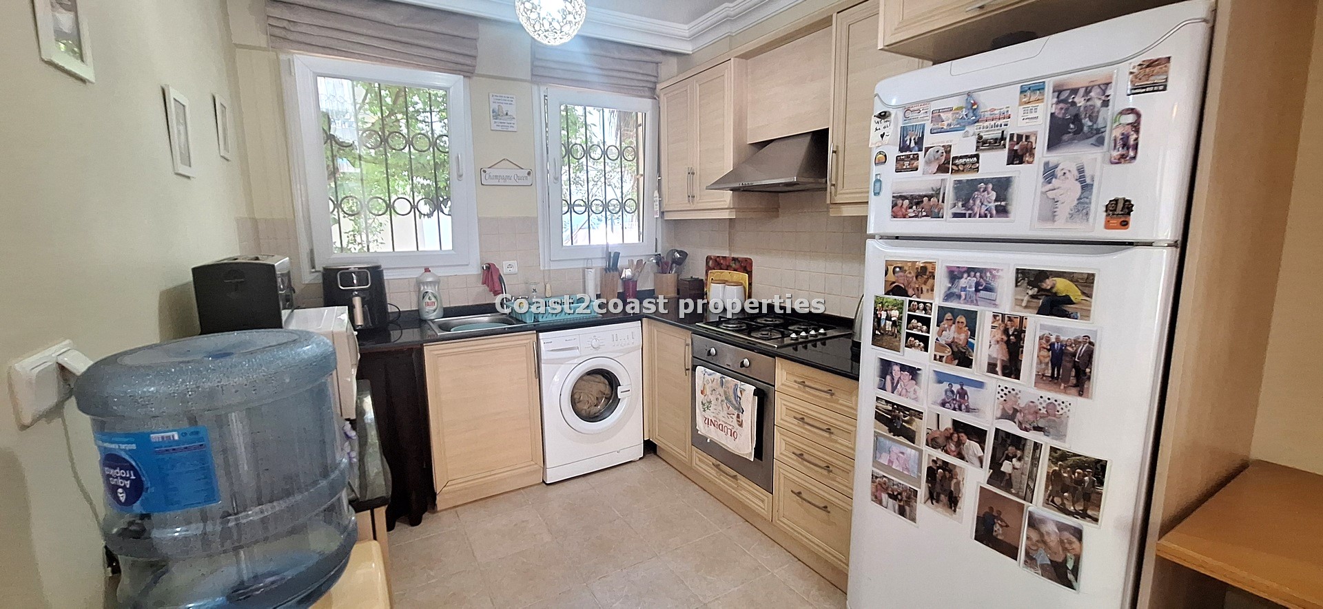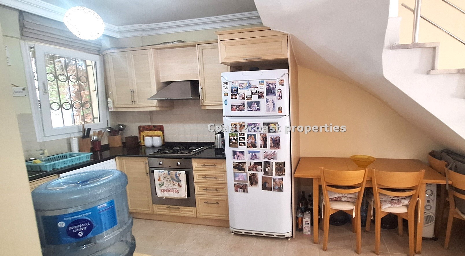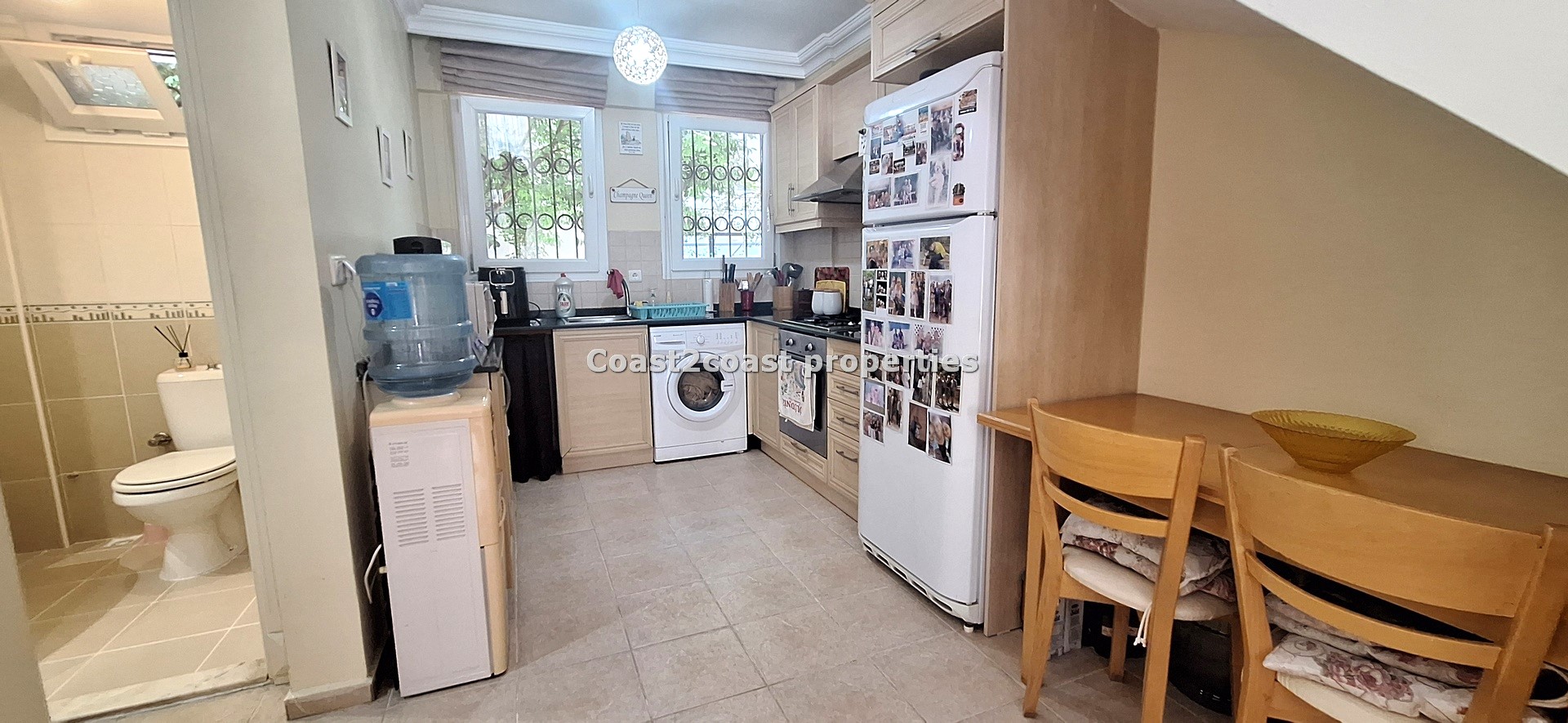 The ground level offers us the lounge, open kitchen and toilet. The lounge is a good size with double doors leading you onto a good size balcony that overlooks the pool and garden areas. Bare in mind Villas Oakle comes FULLY FURNISHED! This is a turn key property! The lounge area is bright and very welcoming. There is a feature fireplace that is for decoration purposes only! The kitchen is open plan with space for a dining table adjacent. We have ample storage space. This kitchen again comes fully furnished with built in appliances, oven, hob, extractor, washing machine and tall fridge freezer. It is finished off with a black marble work surface and tiled backsplash. The 2 large windows in this space guarantee good lighting.